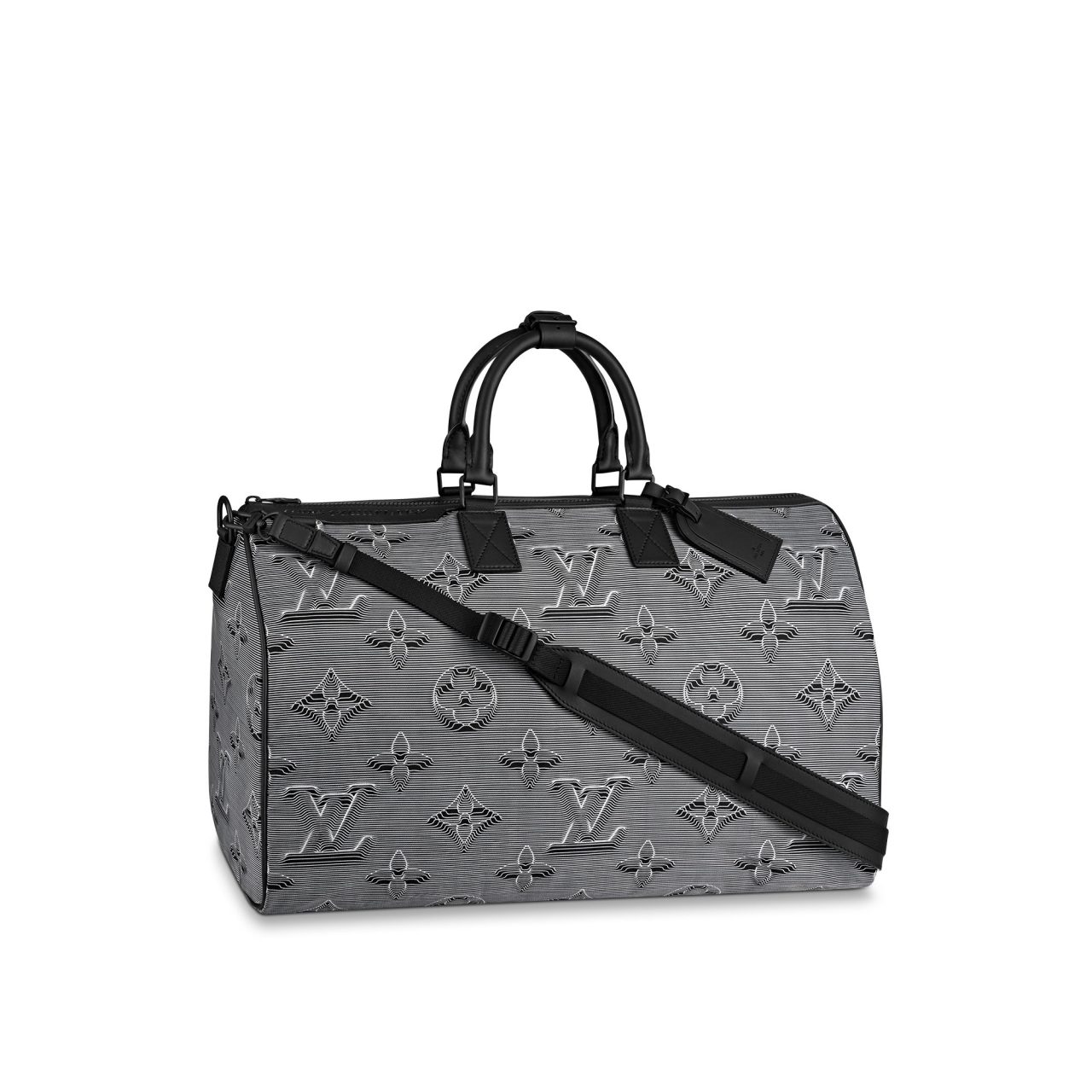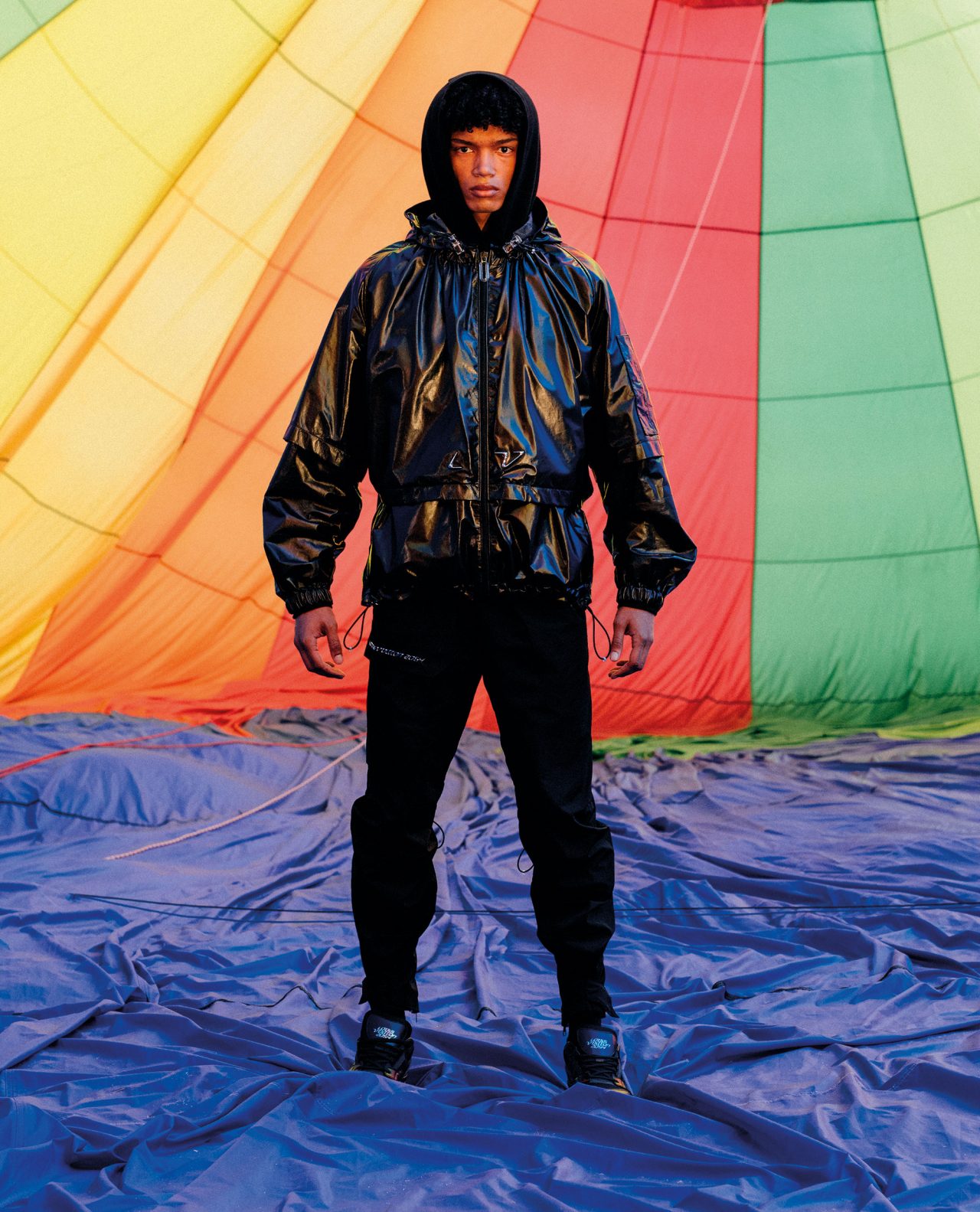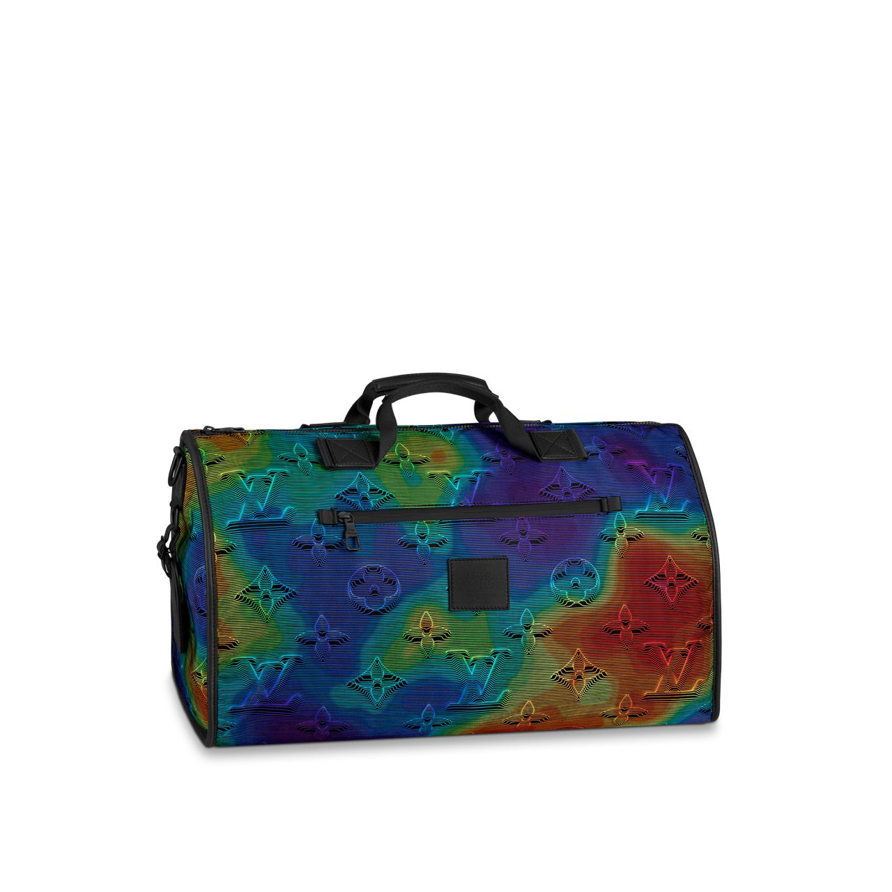 また、本ラインではいくつかのアイコニックな新たなコードが誕生。伝統的な「モノグラム」は再解釈され、エンボスを模したトロンプ・ルイユのモチーフとしてタイダイ風カモフラージュレインボーにあしらわれている。このパターンはモノトーンでも登場し、ほとんどのウェアのライニングに用いられ、本ラインの象徴となっている。他にも、胸元のポケットやパンツのポケットフラップに施されている3Dのイニシャル・モチーフや、シンクロした飛行機で形作ったイニシャルモチーフなど、多彩なグラフィックが「ルイ・ヴィトン 2054」のトレードマークとして随所にあしらわれている。