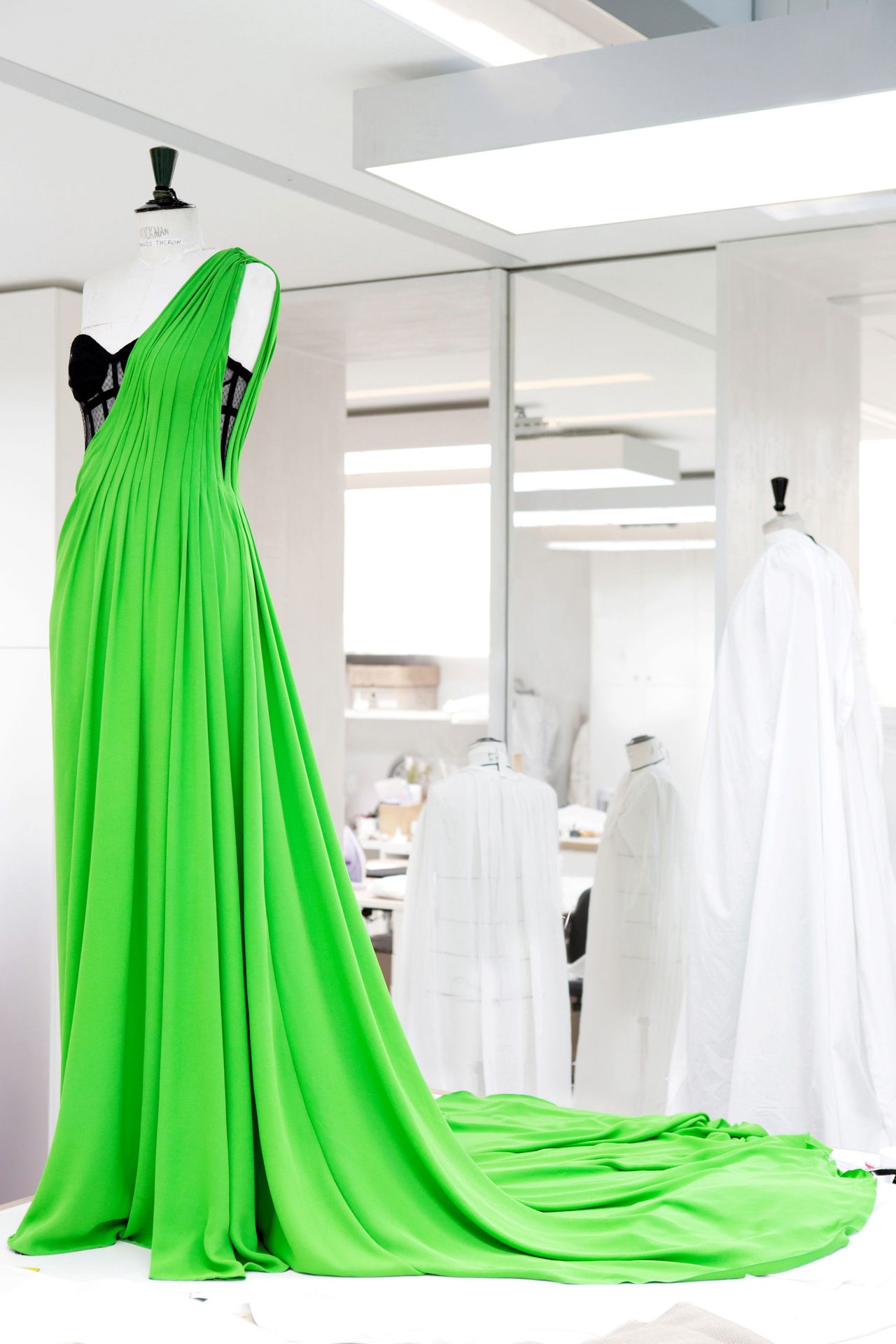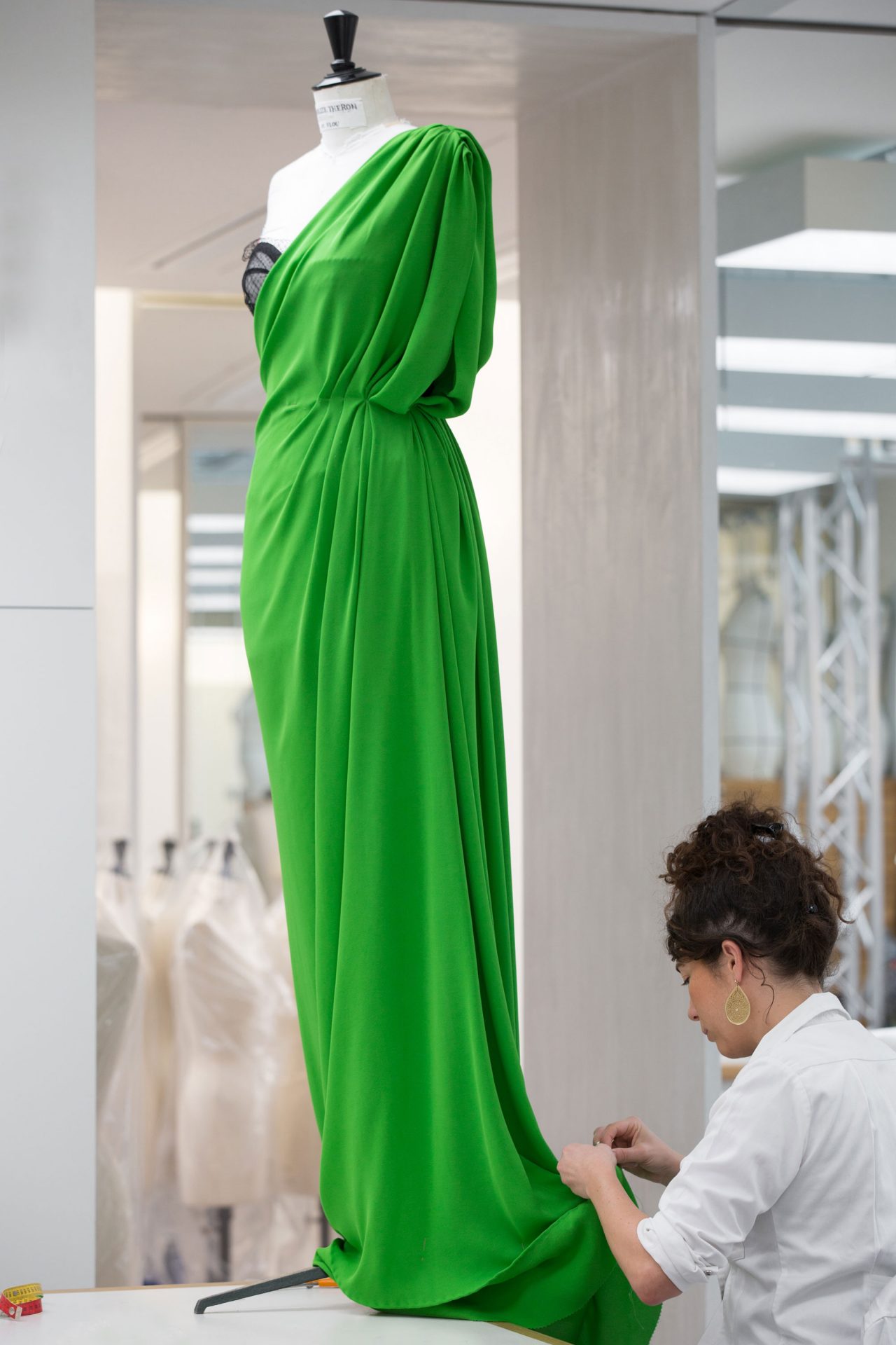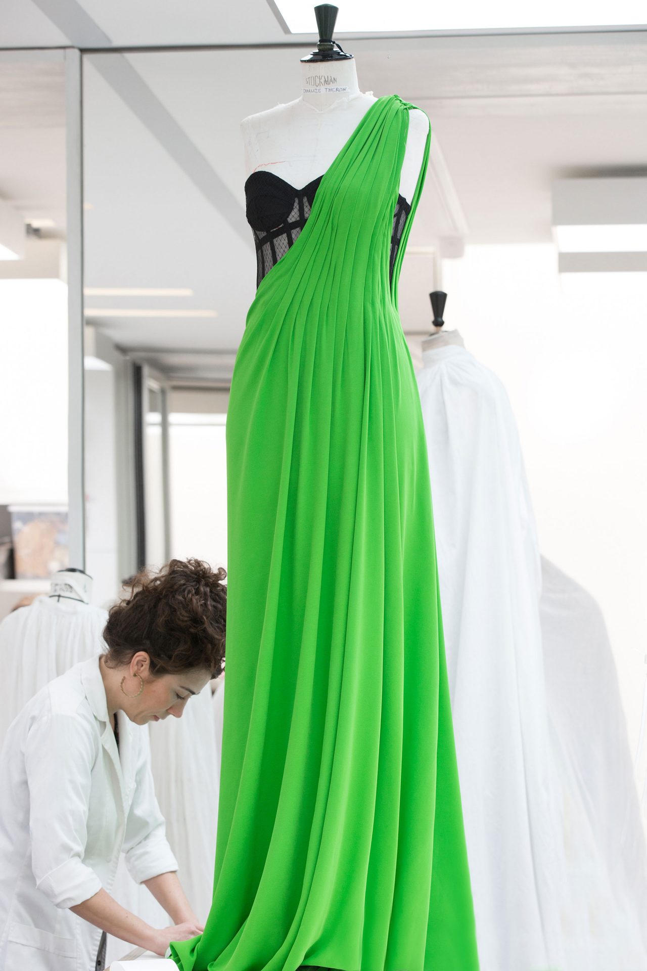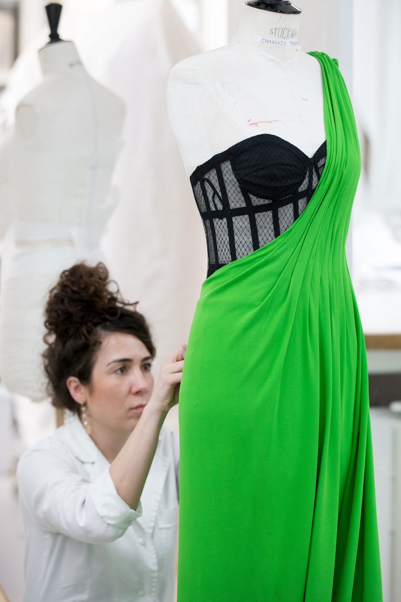 華やかな色合いが揃うレッドカーペットのドレスの中でも、一際目立っていたのがアップルグリーンに染色されたシルククレープがユニークなドレスを着た Charlize Theron だった。Maria Grazia Chiuri (マリア・グラツィア・キウリ) によるオートクチュールドレスは、ビスチェと手作業のドレープで美しくかたちづくられたシルエットが特徴的で、完成までに200時間を要したという。