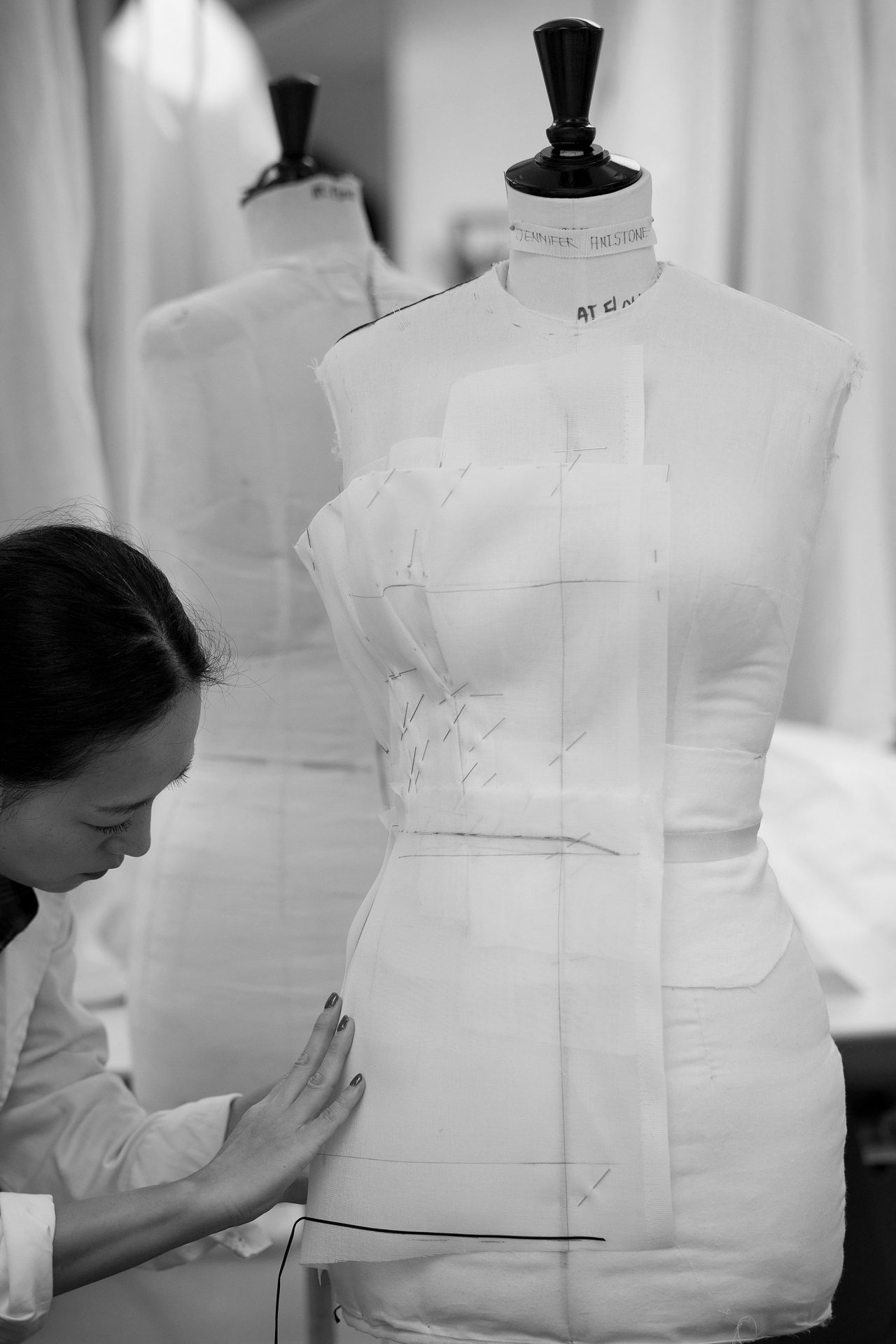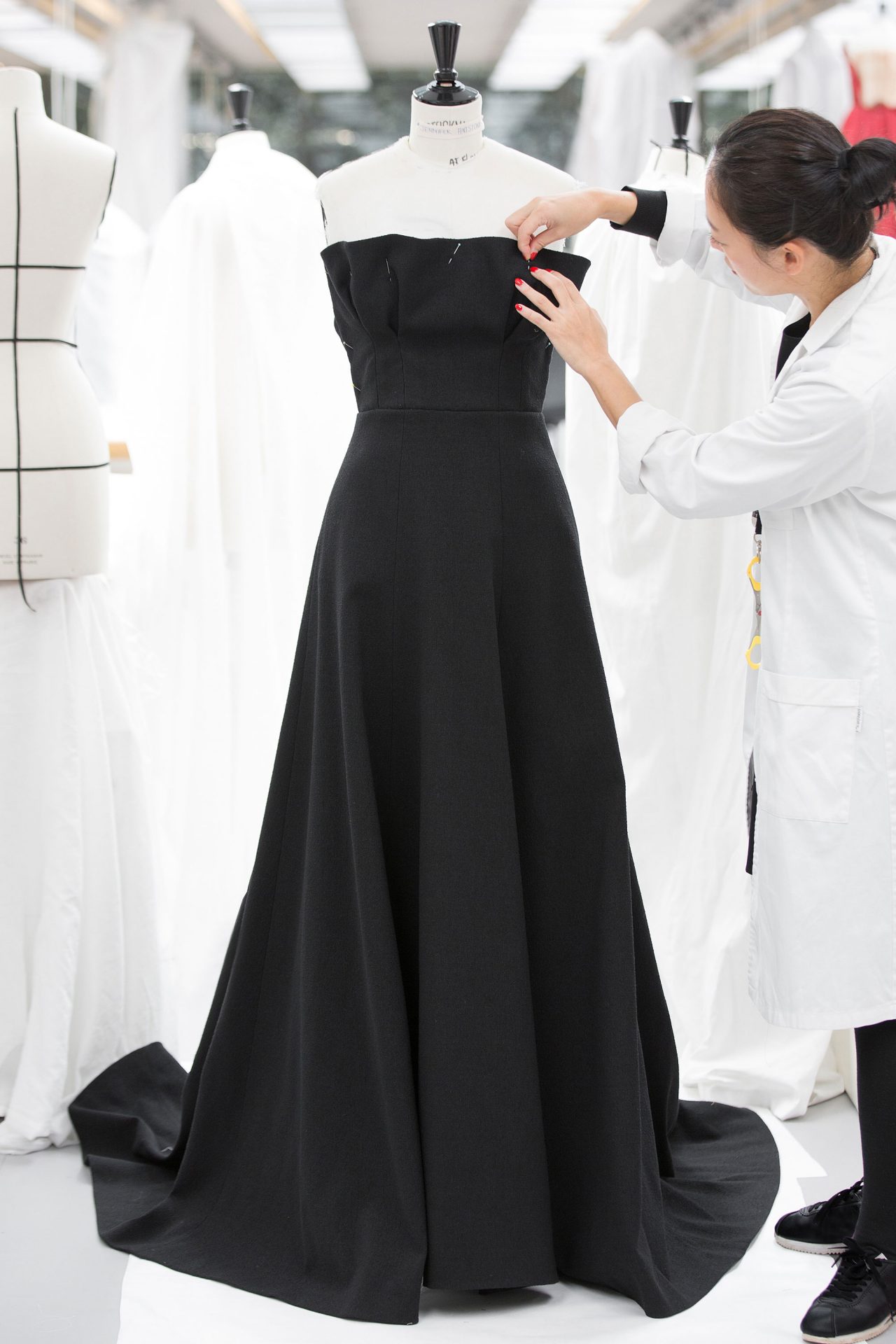 Jennifer Aniston が着用したのは ムッシュ ディオールのアーカイブピースに着想を得たブラックドレス。25メートルもの上質なシルククレープを200時間以上費やして仕上げた贅沢な一枚だ。