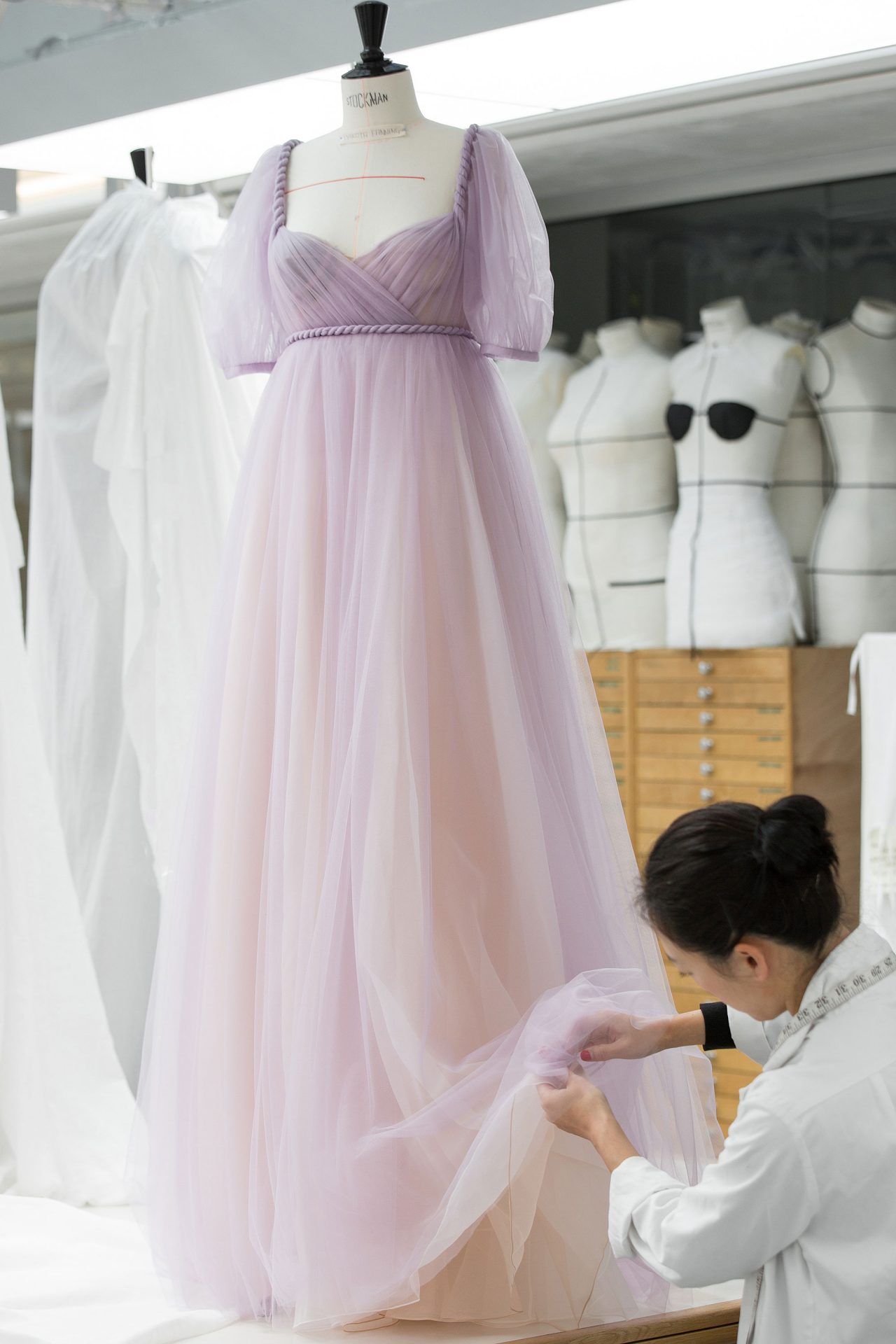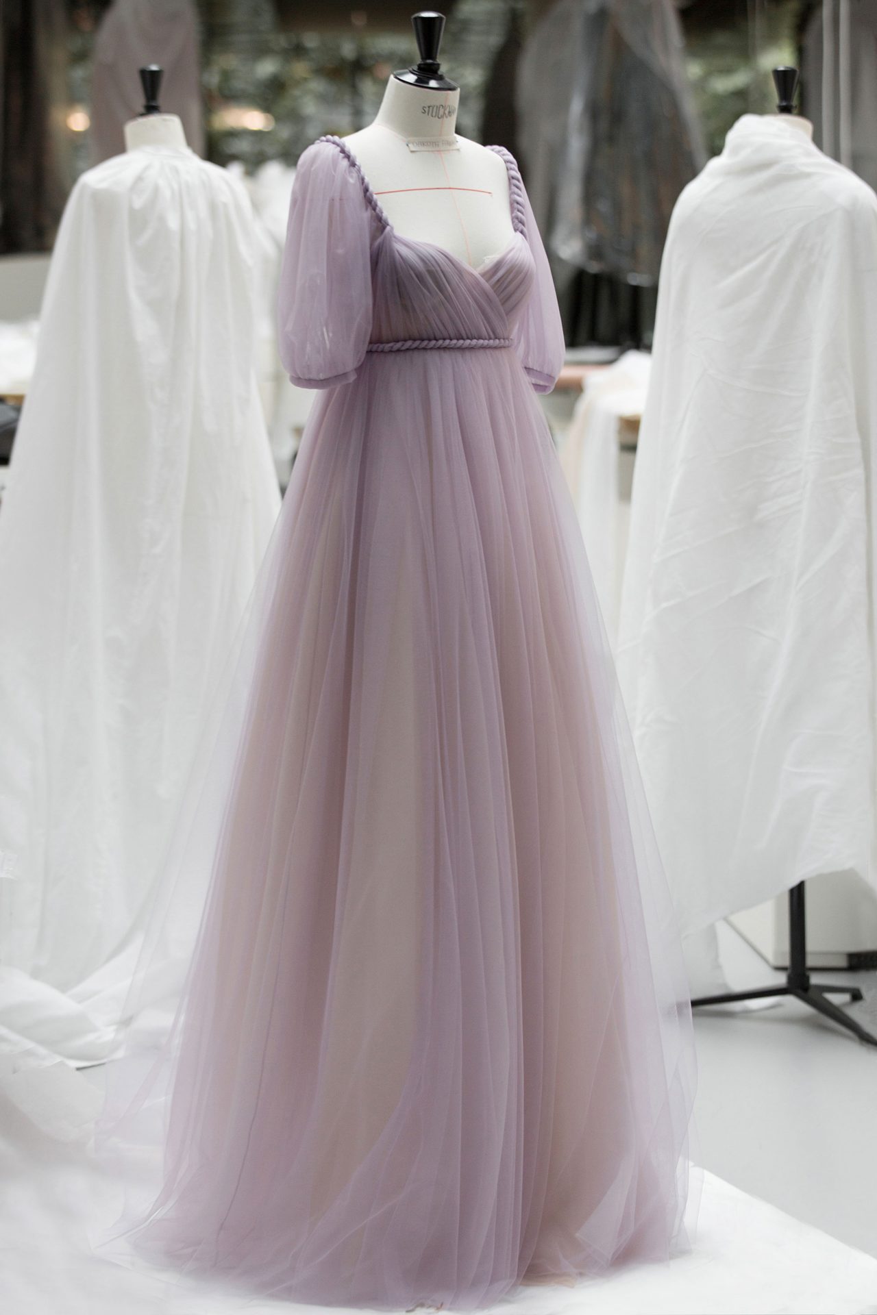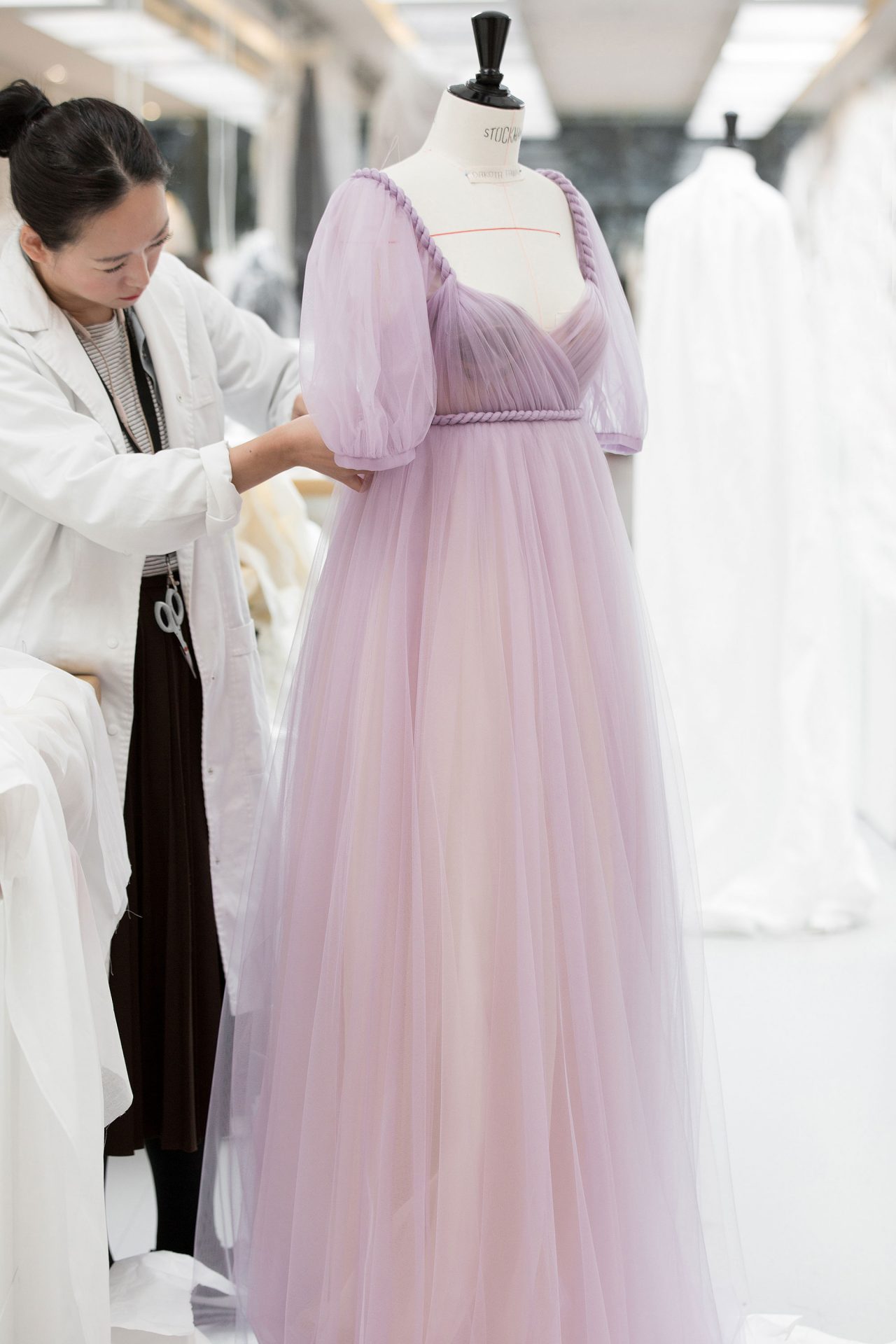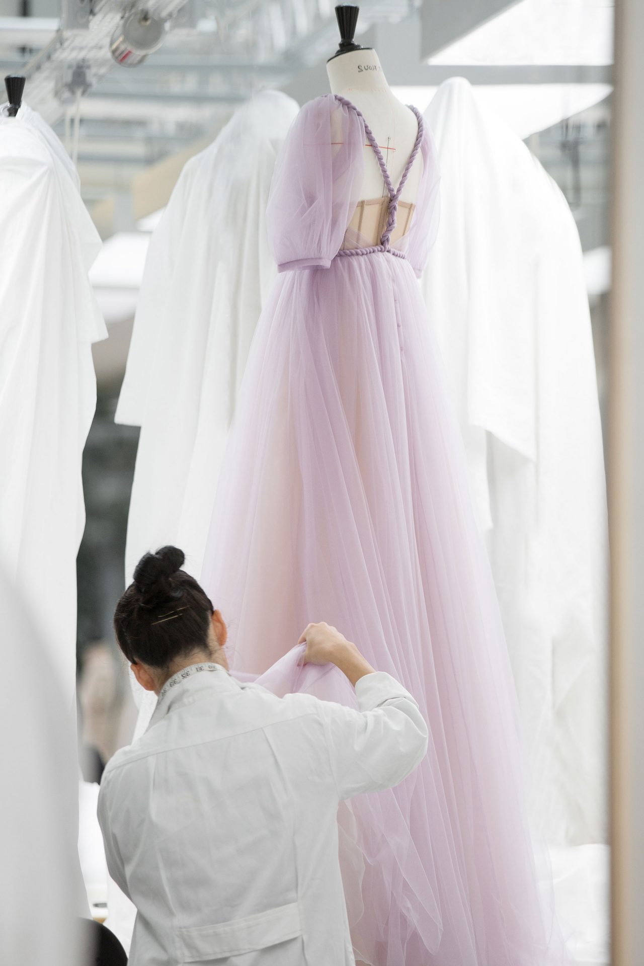 Dakota Fanning の着用したライラックカラーのドリーミーなチュールドレスも話題に。20メートルにも及ぶさまざまなウエイトのチュールを用いたこのドレスは、3人の職人によってなんと300時間以上もの制作時間をかけている。