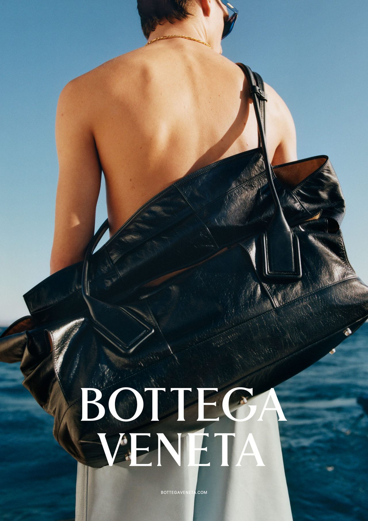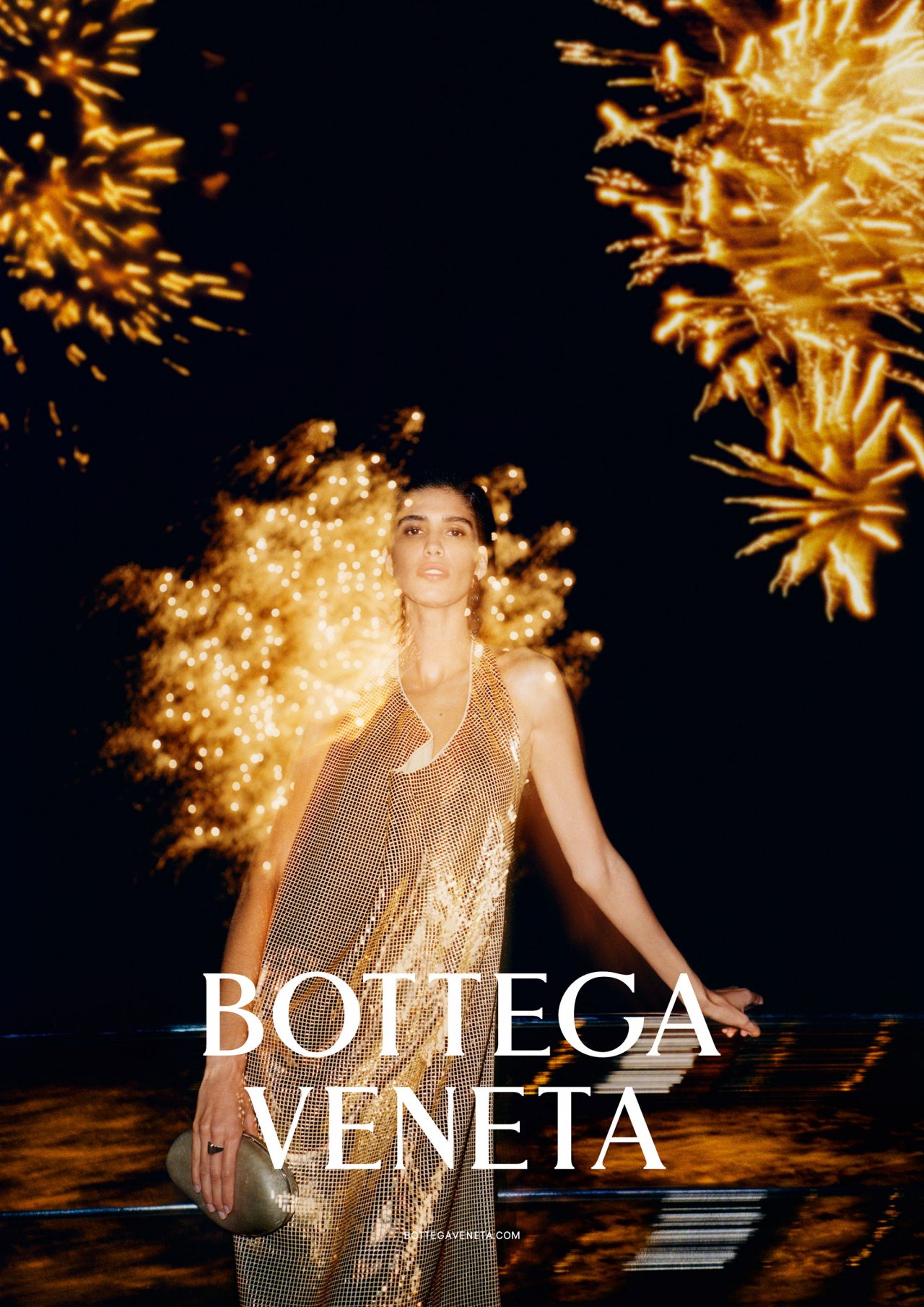 「快楽主義への憧れ」を表現したという今回のキャンペーンでは、船上で過ごす気ままな一日が切り取られている。BOTTEGA VENETA のアイコニックなバッグ「ザ・アルコ」やシューズを纏い、トップデッキで太陽を浴びる大胆で鮮やかなカット。夕暮れを迎え、空の色がコーラルとバイオレットに染まる儚い一瞬。夜空に打ち上がった花火の下で、力強く輝くジュエルやスパンコール。遠い記憶の中にある場面のような、どこか切なさが漂う終わらない夏の風景が描かれている。