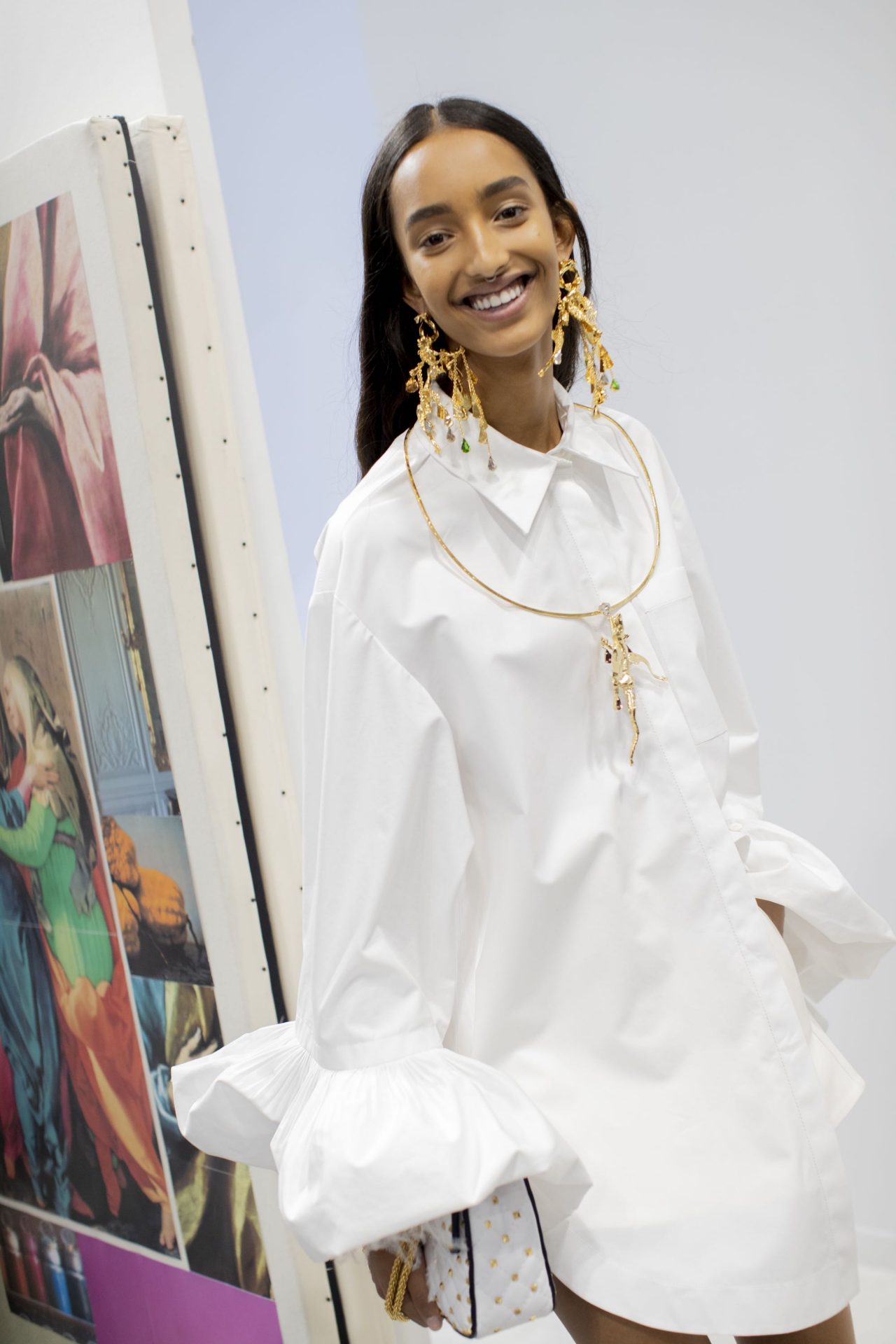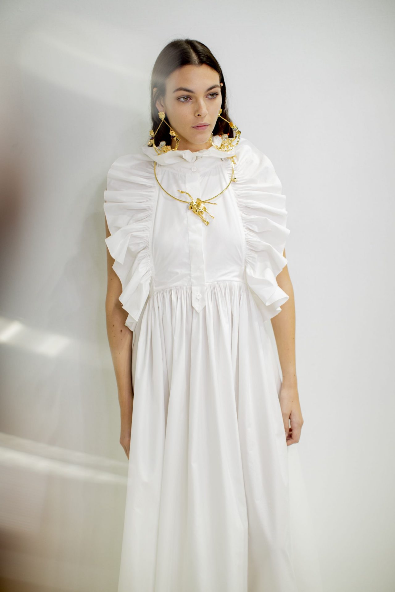 パフスリーブやフリルネックラインを取り入れられたボリュームのあるシャツ、シャツドレスなど、クチュールの技術を生かしてつくられたデイウェア クチュールともいうべきアイテムが取り揃えられる。