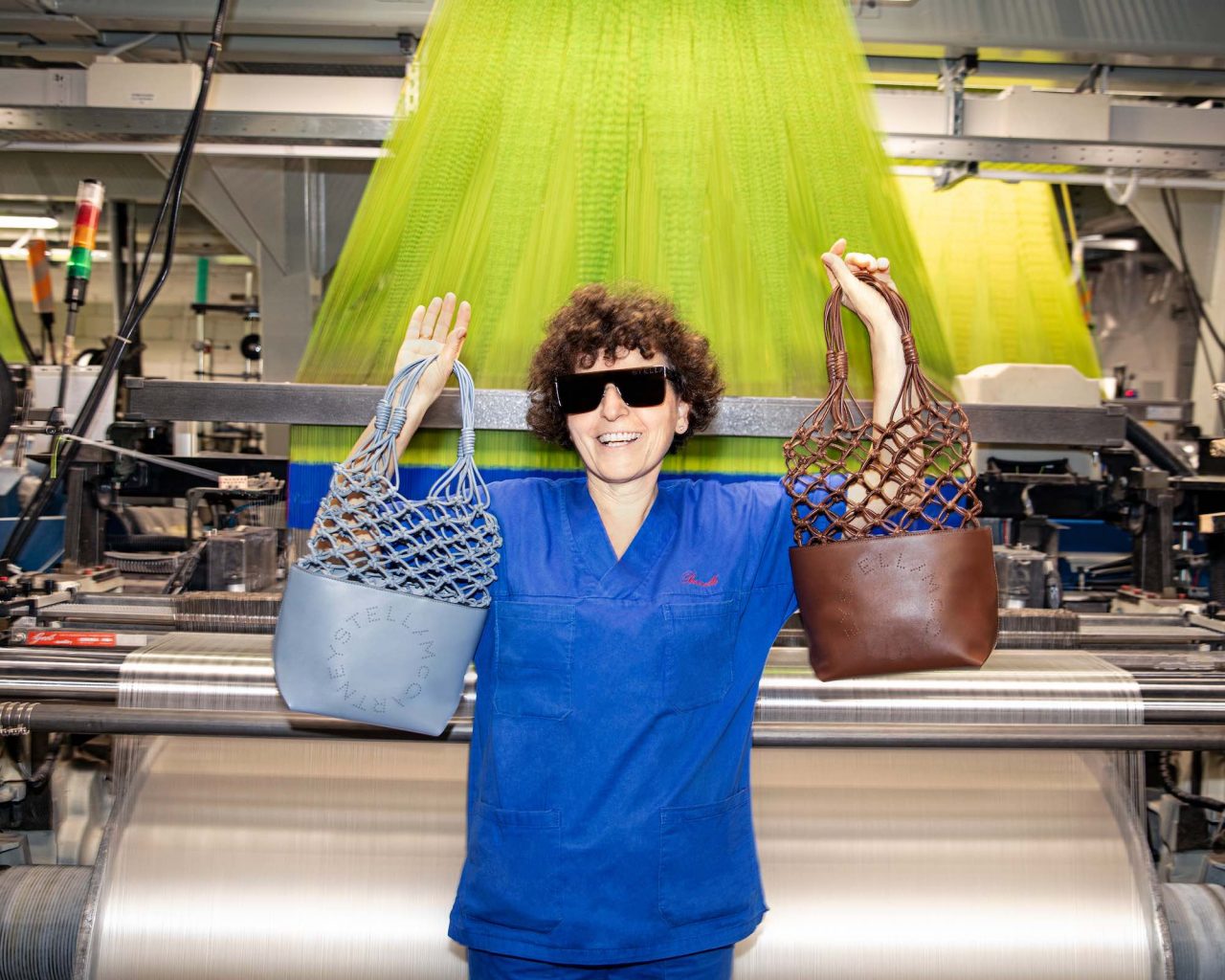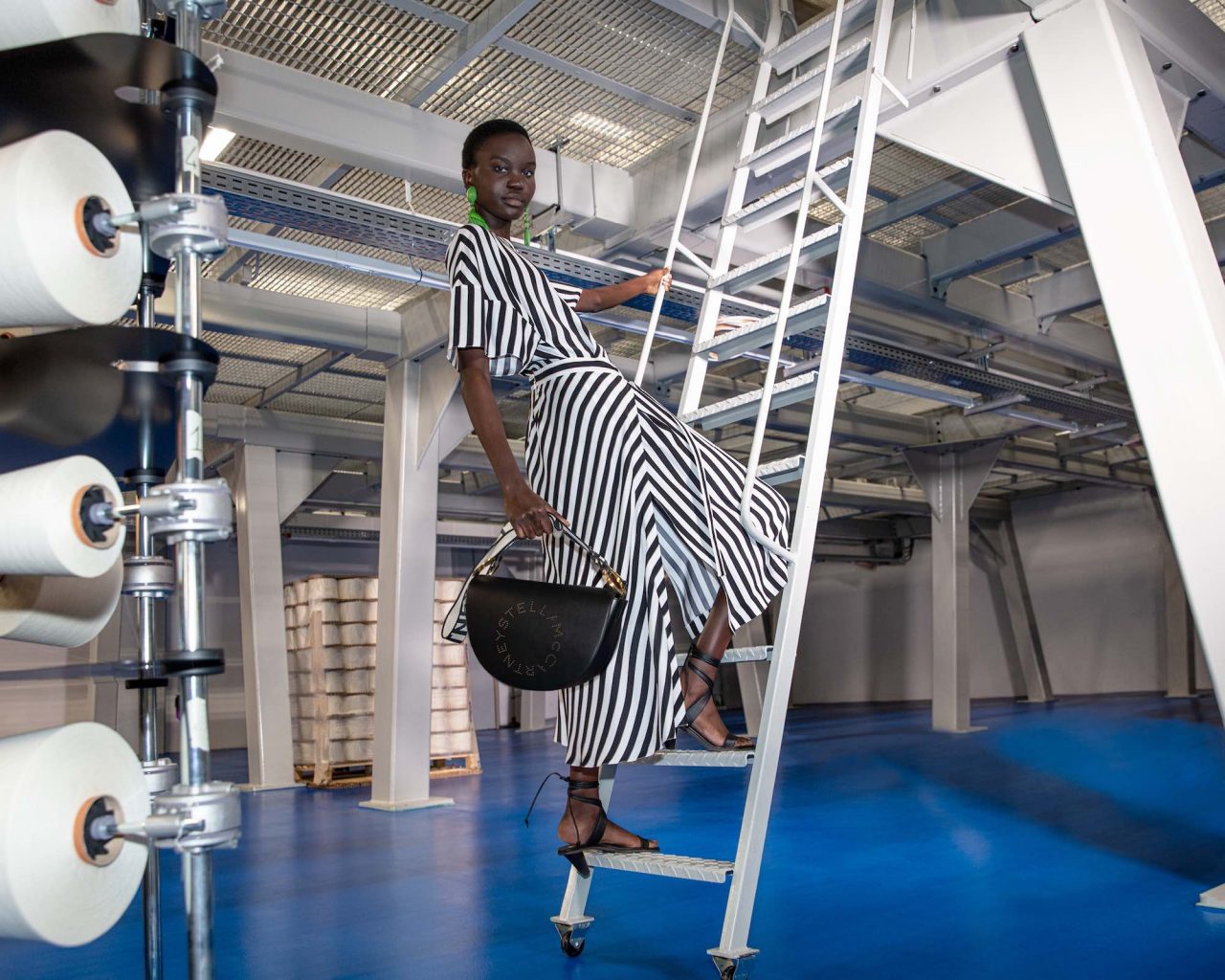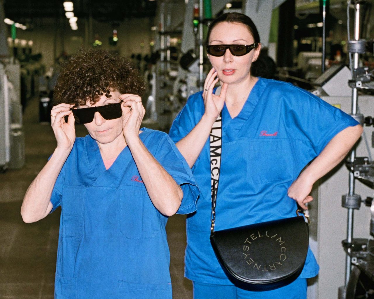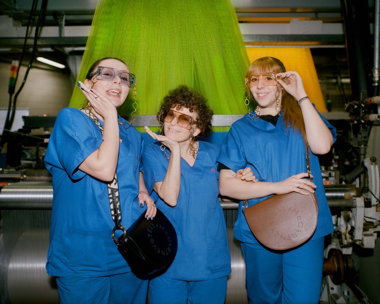 本キャンペーンで注目したいのが、新作バッグの数々。レザーの代替素材であるエコ オルター ナッパとオルター ナッパを素材とする Stella McCartney の新たなアイコンバッグだ。エコ オルター ナッパはPVCフリーで、裏張りにはプラスチック廃棄物に由来するリサイクルポリエステルを採用。植物由来オイルを50%以上配合した成分でコーティング加工が施されており、このコーティングには食料起源ではない、再生可能な天然資源が用いられている。また、工場の作業員たちがかけているアイウェアも同じく天然素材を原材料に製作。木材パルプ繊維由来でバフタル酸エステルを含まない生分解性素材、バイオアセテート製となっている。