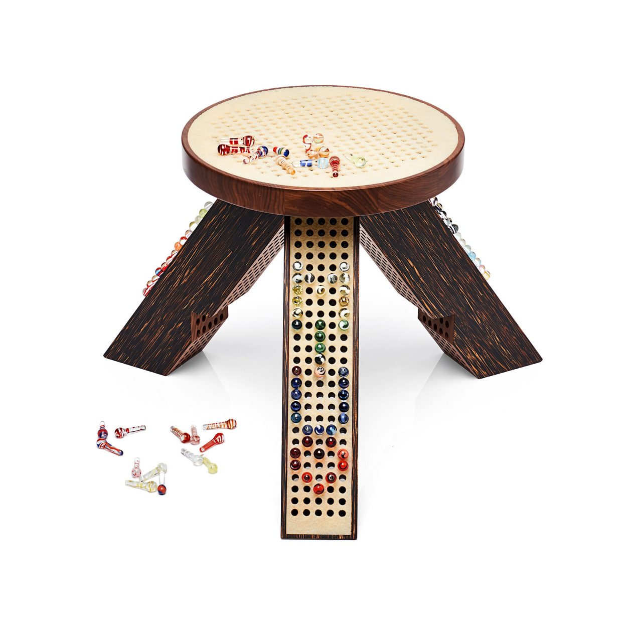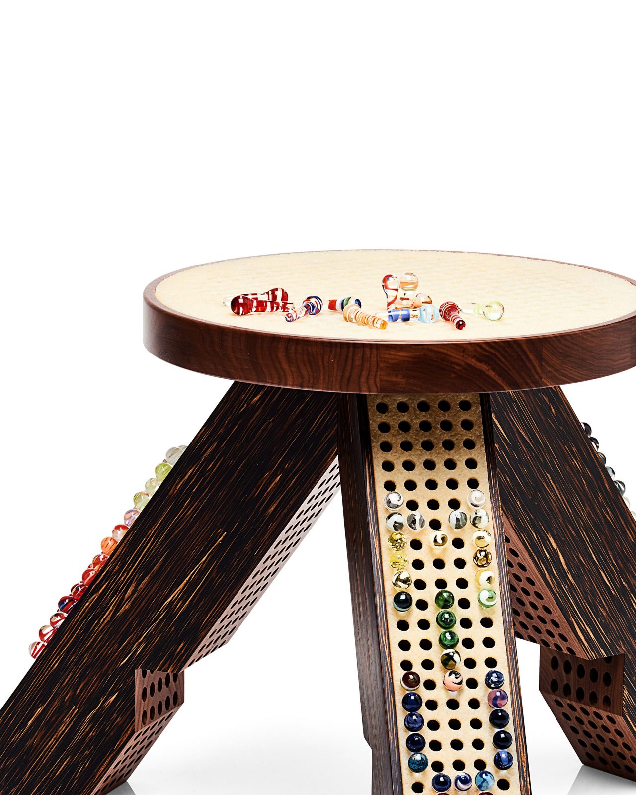 上質なウッドにラバー、ガラスといった異素材を組み合わせて制作された三脚スツールには、300個の穴が配されており、100本のマッチ棒を用いて無限にカスタマイズすることが可能。まるでロジックゲームのような遊び心が効いた本作は、ファッションならではの職人技が存分に発揮された独創的なデザインを楽しむことができる逸品だ。