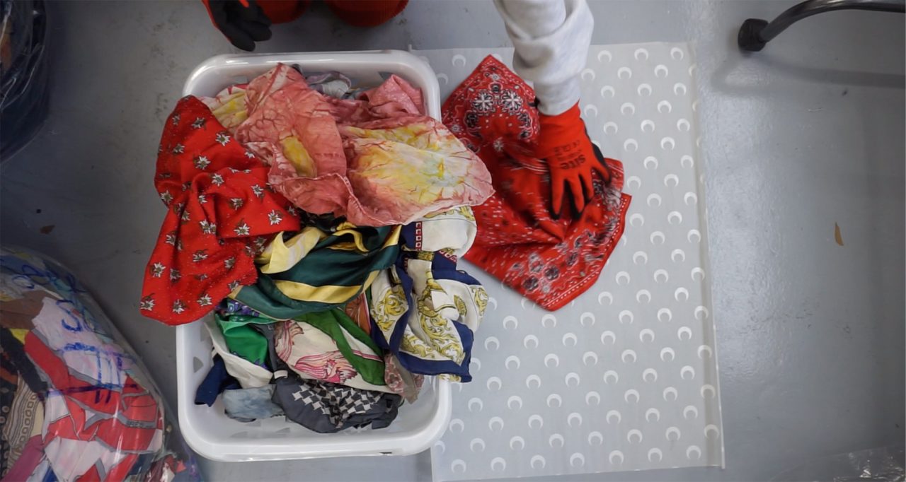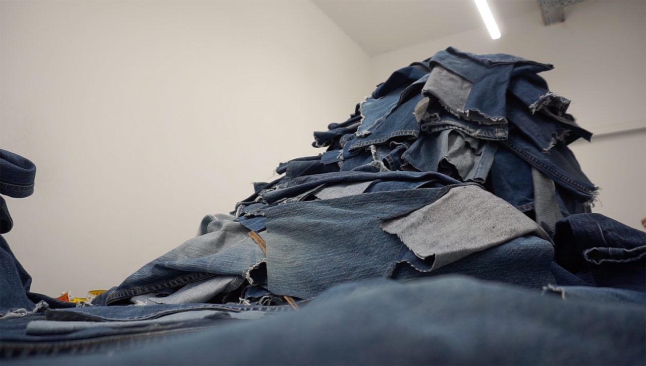 クロシェ、デニム、ベッドシーツ、レザー、シルクスカーフ、タオルのリサイクル素材ごとに6作品。ひとつひとつ手作業で、それぞれがコレクションのウエアへと新たな命が吹き込まれていく様子が、生地の段階から追って紹介されている。