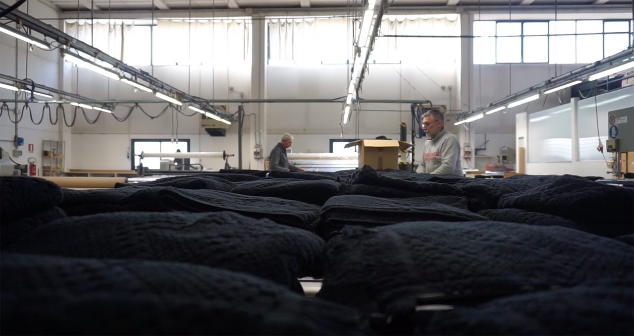 「制作プロセスは、デッドストックやリサイクルショップでのリサーチから始まります。興味深い素材やコレクションに合いそうなものを選んでいきます。 次にそれらをどのように利用するか、最良の方法を見つけ出します。最近では、サイクルの終った衣服を仕分けしている新しいサプライヤーと協力し始めました。彼らは生地の繊維を認識し、どれがコットンでコットンでないかなど、素材の選別をすることが可能な機械を使用しています。ただ、機械が混合繊維を認識しないので、これにより自動的に高品質の素材のみを使用することになるのです。それらがスタジオに到着すると、社内のチームが慎重に再確認します。これらは全体的に複雑な制作プロセスであり、毎回少しずつ違いがあります。 私たちが「REGENERATED (再生させた)」衣服と呼ぶものを扱ってくれる工場を見つけることは簡単ではないですが、私達は実際に工場に出向き、オーナーさん達に会い、私達と一緒に働いてくれるよう説得する必要がありました」とMarine Serre は話す。