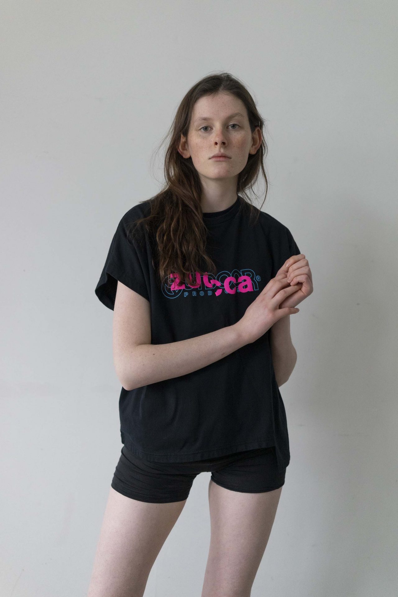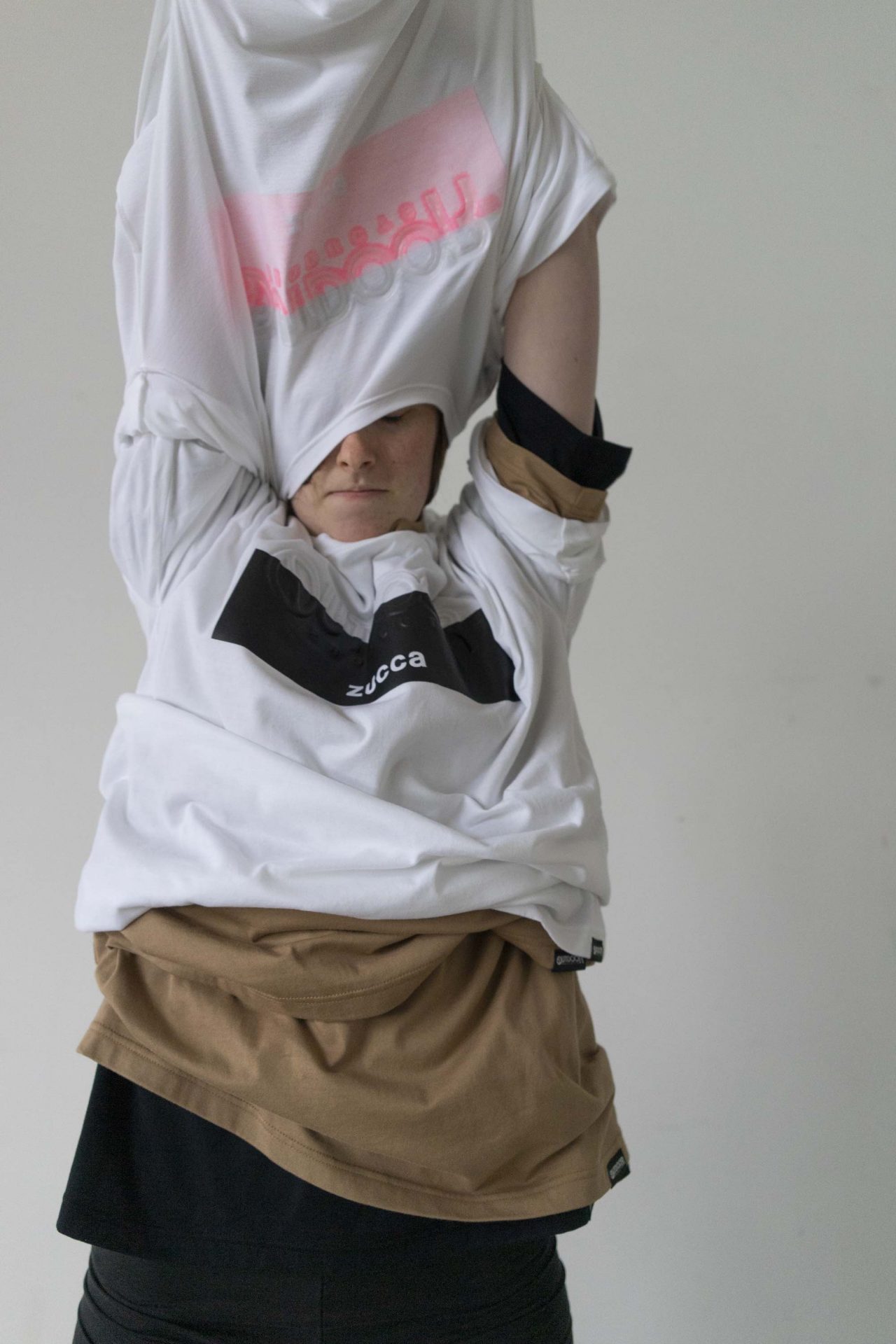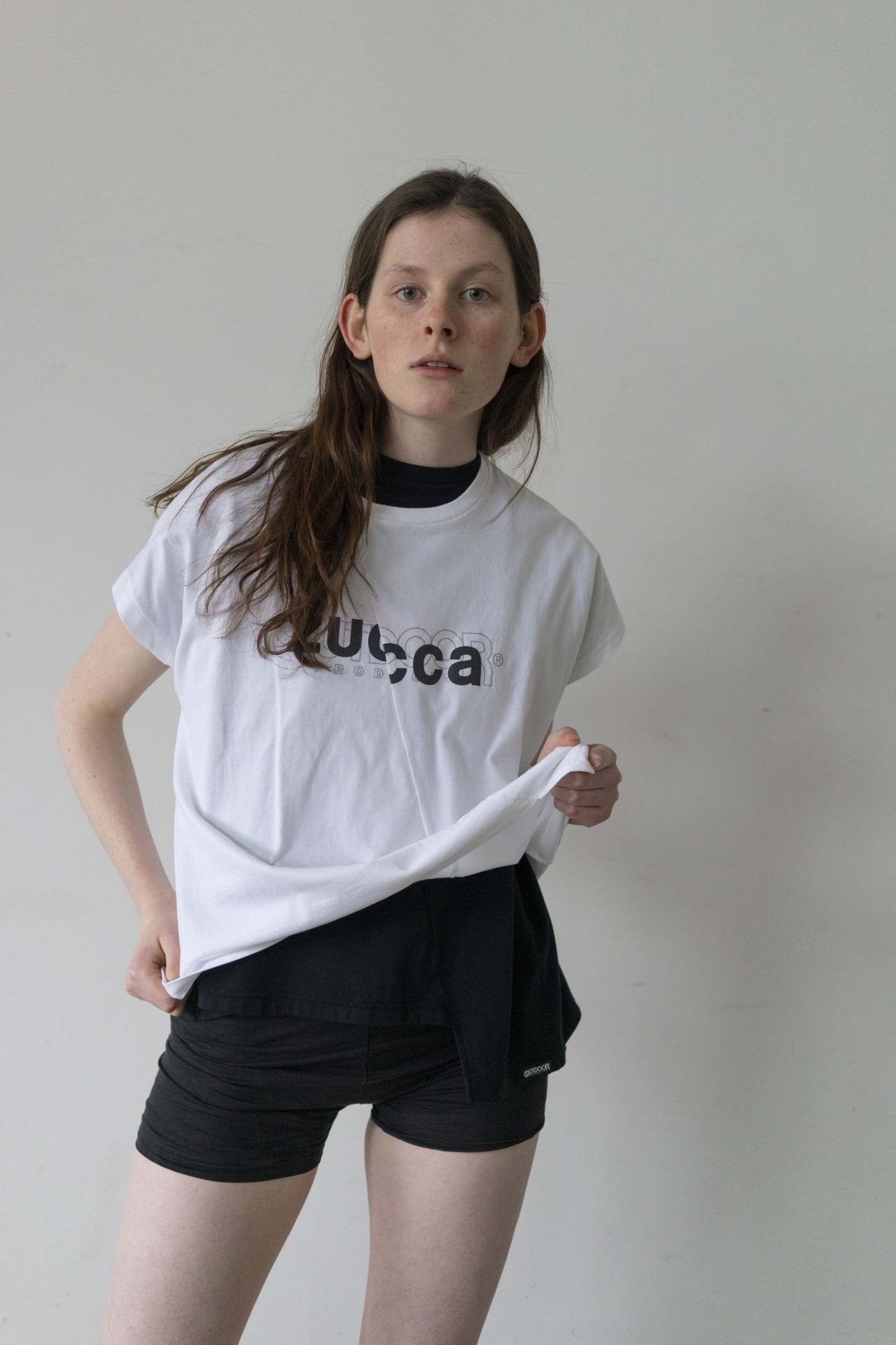 Tシャツもエンボス加工や光沢あるラバーのベタプリント、Tシャツを半分にカットして繋ぎ合わせたような変形デザインなど細部までこだわり抜かれている。