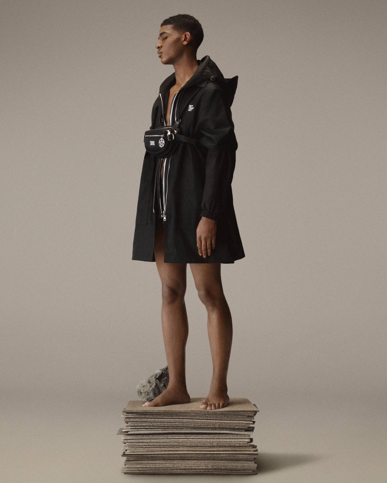「ReBURBERRY Edit」では、使用済みの漁綱やファブリックの端切れ、工業用プラスチックなどを再生したリサイクルナイロン ECONYL® を使用したトレンチコートやアクセサリー、先端的なバイオアセテートを用いたアイウェアコレクションといった新素材を採用したサステイナブルな21のスタイルを発表。パーカーとケープは生産の過程において、エネルギーと水の使用量を低減させ、素材のリサイクル、化学品の利用が管理された工場で製造。その他アウターには、ヒマシ油などの再生可能資源を使用したナイロンやプラスチックボトルを原料とするポリエステルが新たに用いられている。