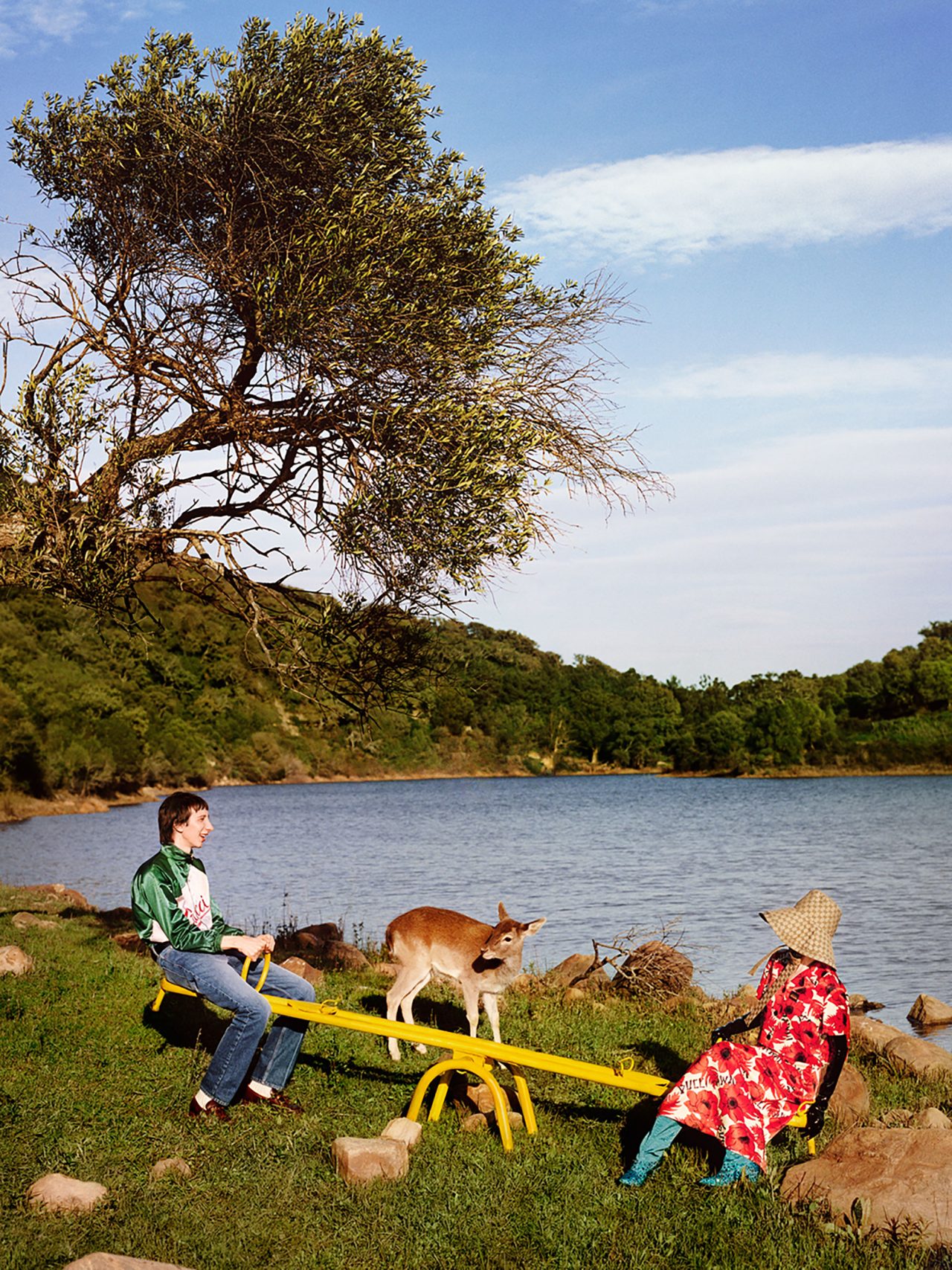 「So Deer To Me」というタイトルが冠された Gucci (グッチ) 2020年プレフォールコレクションのキャンペーンには、シカやハリネズミ、カエル、フクロウなどたくさんの動物が大集合。豊かな自然を背景にモデルたちが動物たちと触れ合い、ブランコやすべり台といった遊具で子供のように遊んでいる。