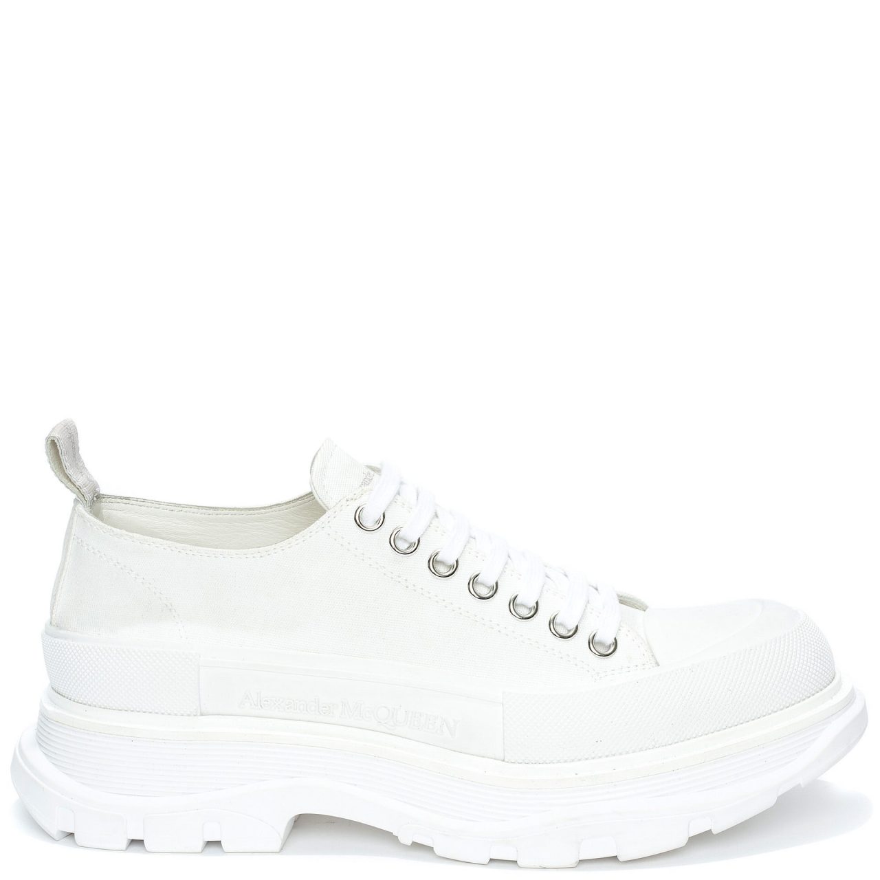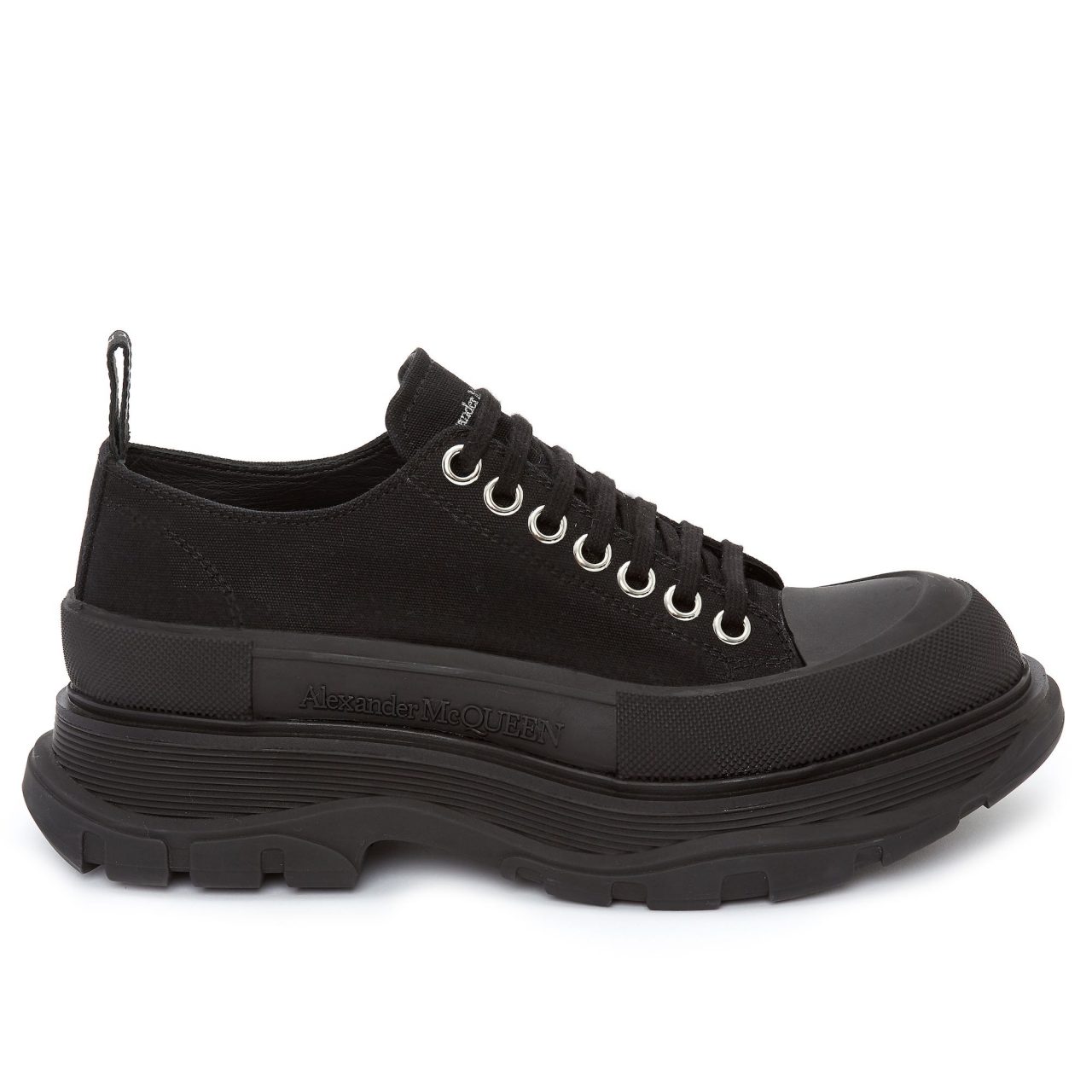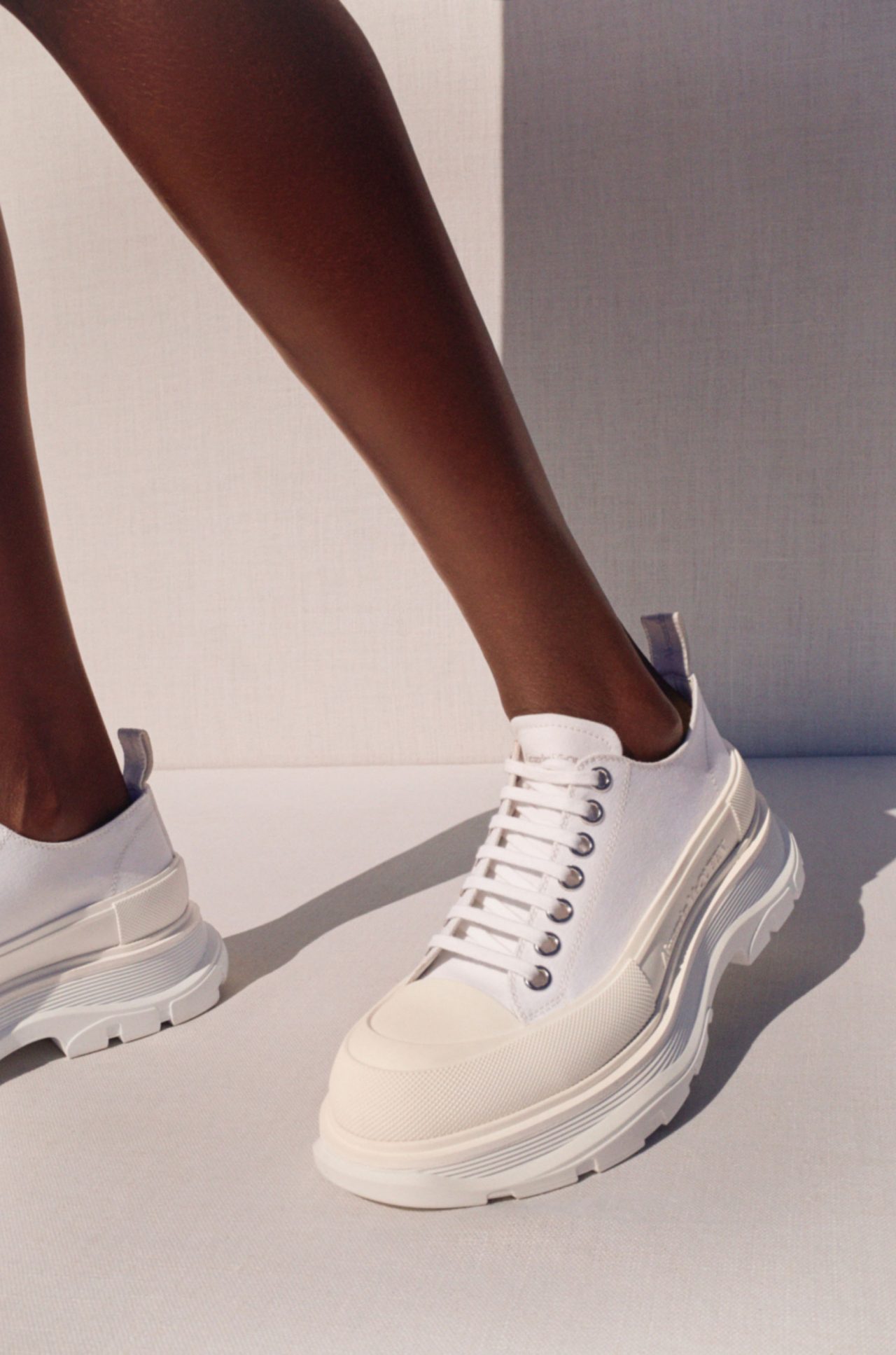 Alexander McQueen の「Tread Slick」は、2020年春夏プレコレクションでデビュー。オーバーサイズのラバーソールとキャンバス地のボディが特徴的なスニーカーで、メンズ、ウィメンズともにローカットとハイカットの2パターンで展開。そのアイコニックなルックスは発表されるやいなや、すぐに大きな注目を集めた。