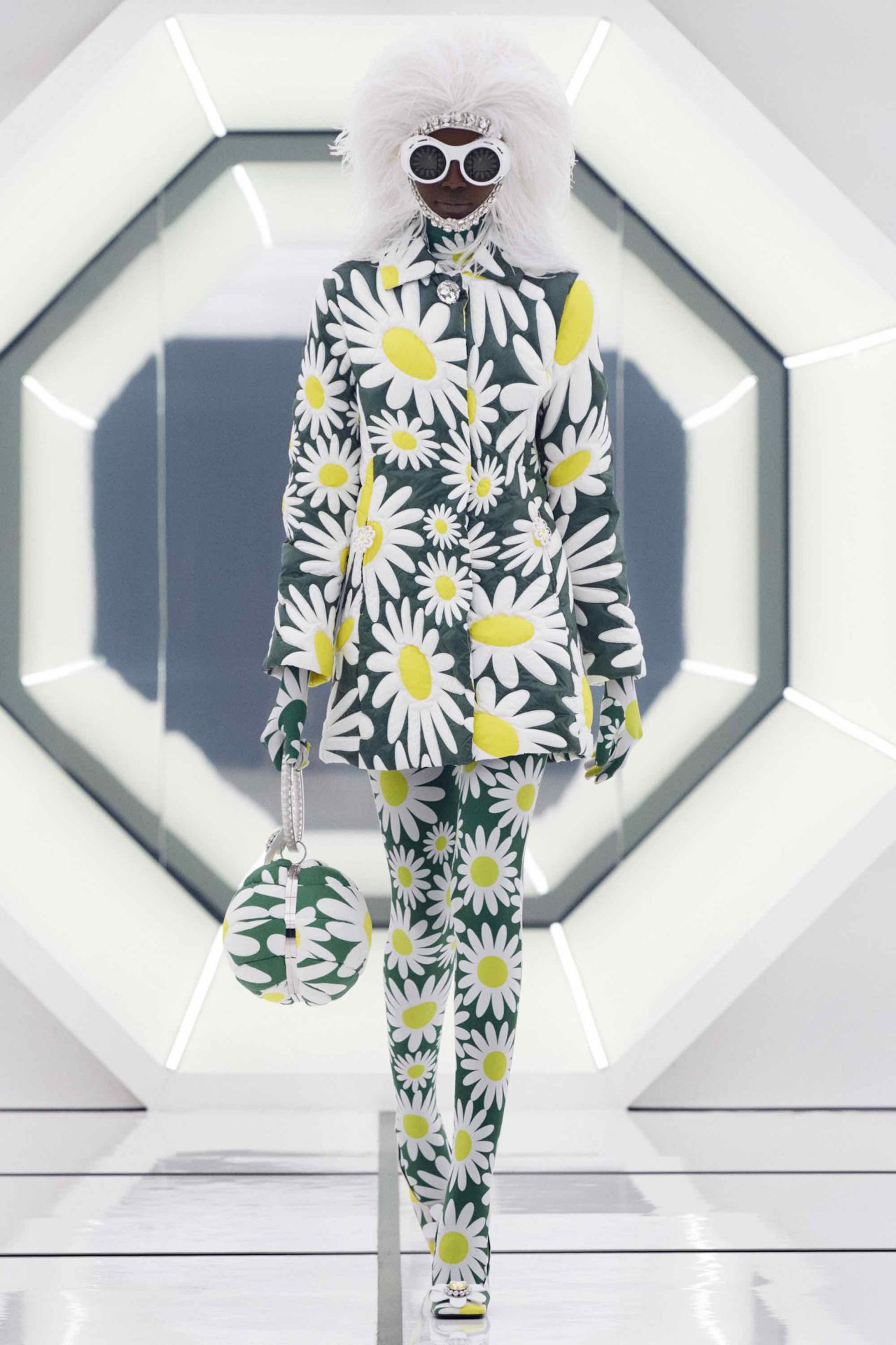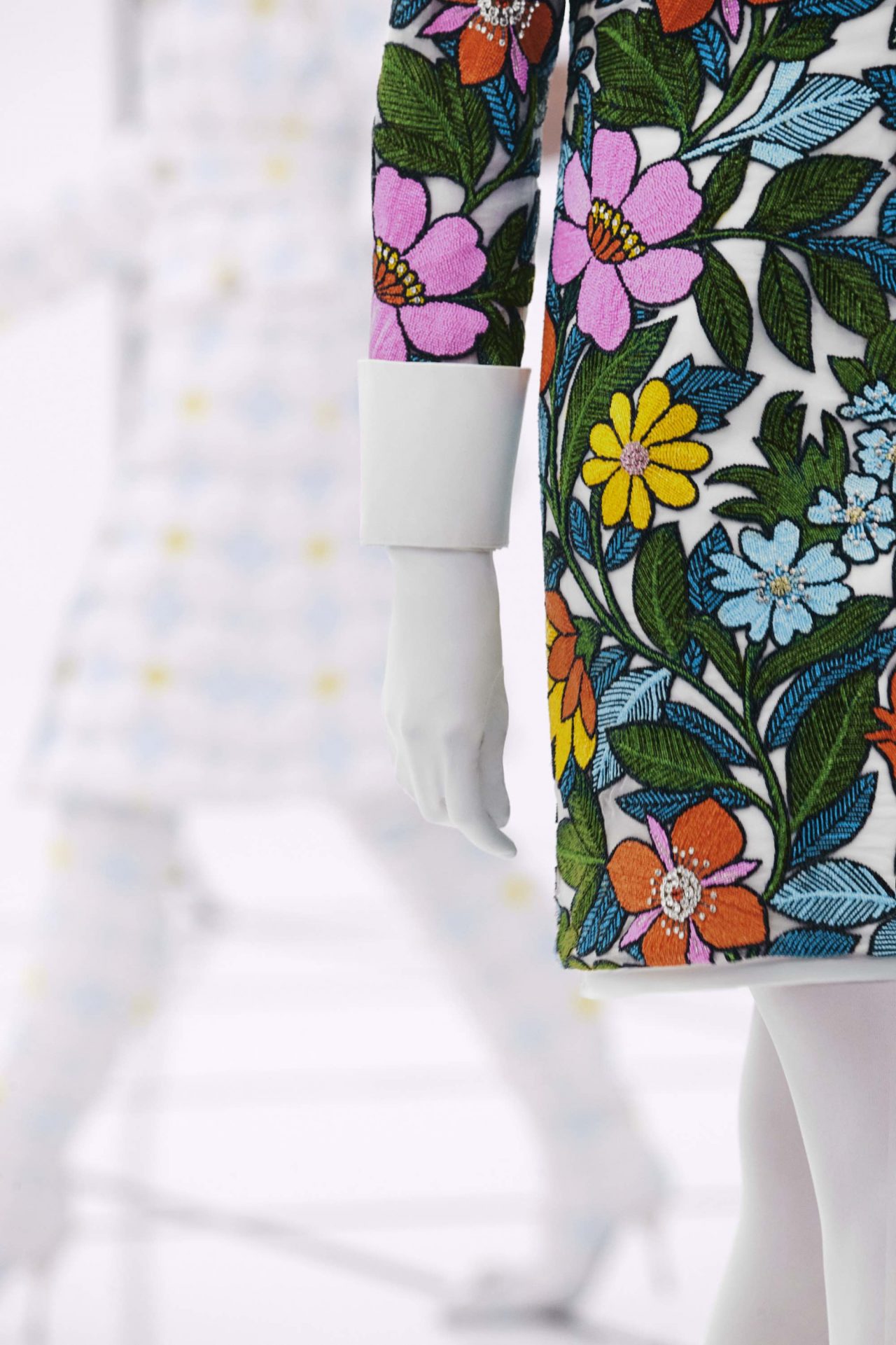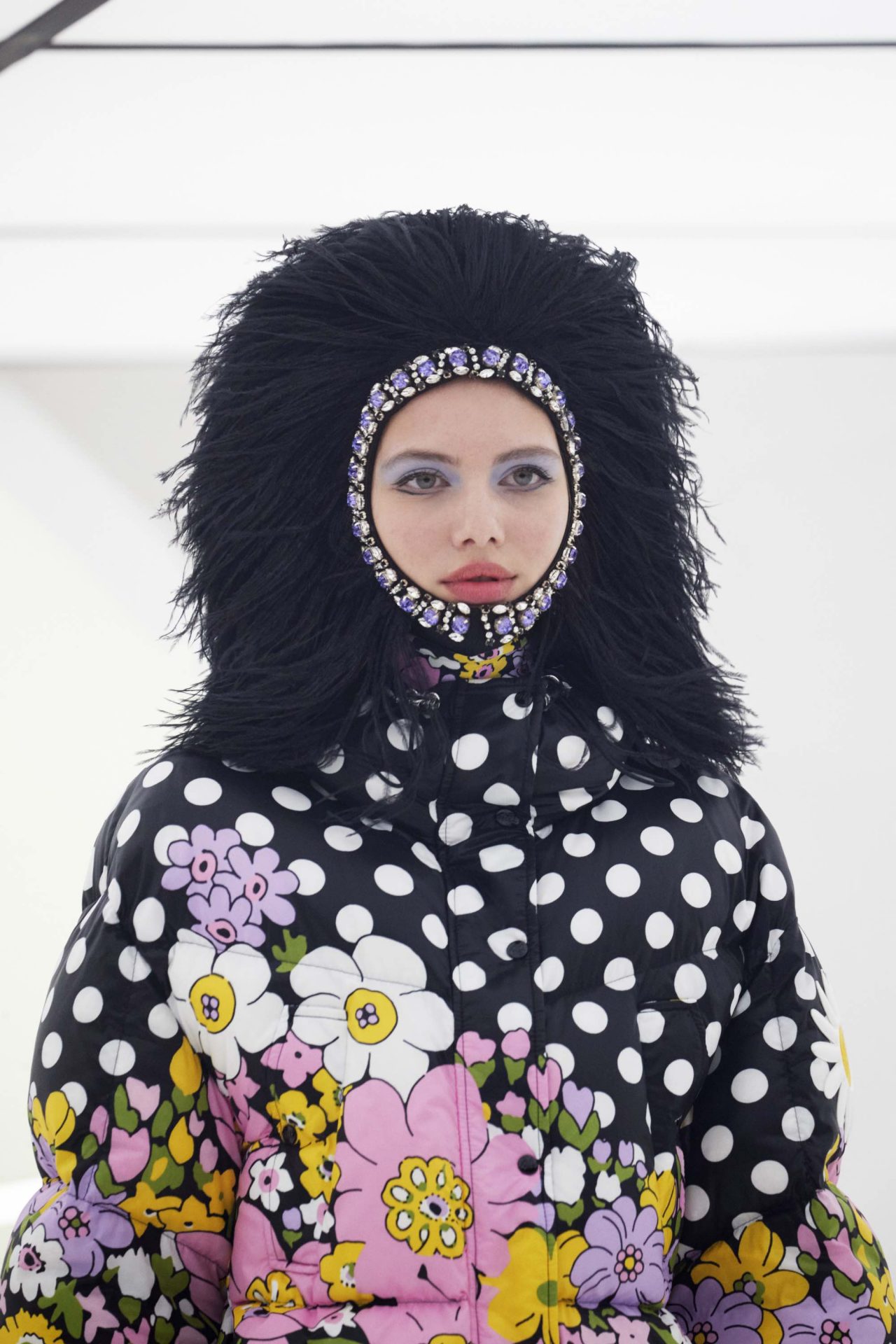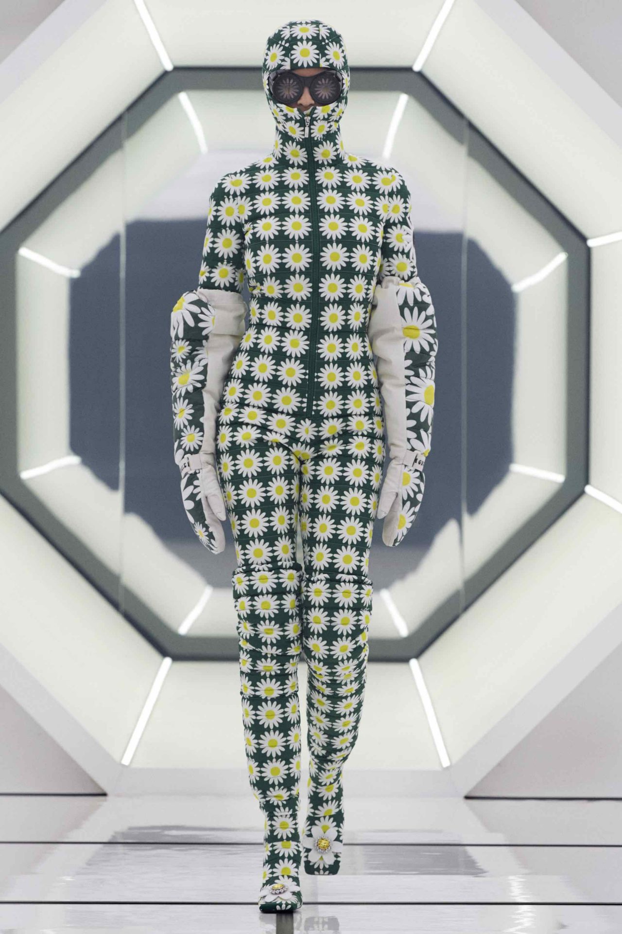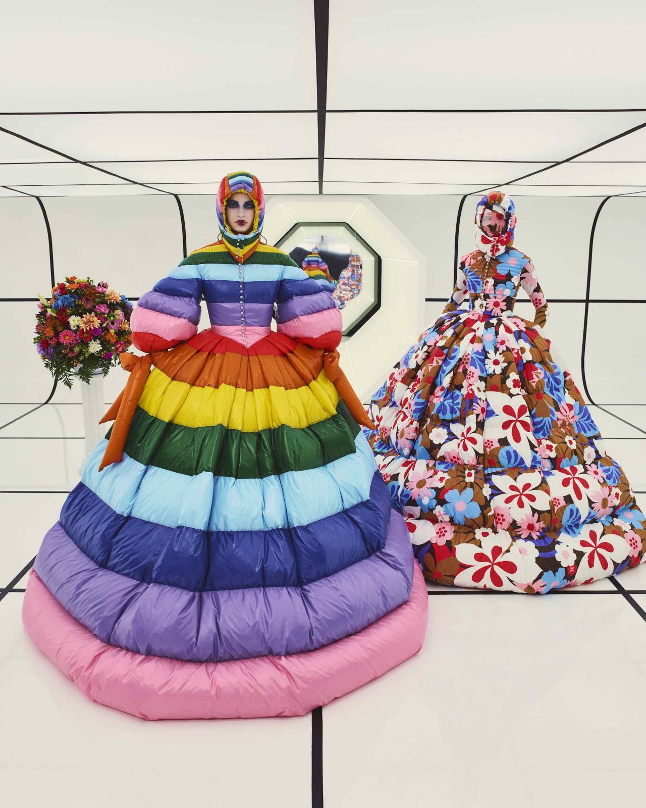 本コレクションでは、ショートでシャープなトラペーズドレスやジェムボタンのコートなど、ノン-ノスタルジックな1960年代のエレガンスへのオマージュを表現した。フラワーからゼブラモチーフ、レインボー、チェックなど、MONCLER (モンクレール) のためだけに考案された 12種類のエクスクルーシヴなプリントがコレクションを彩っている。