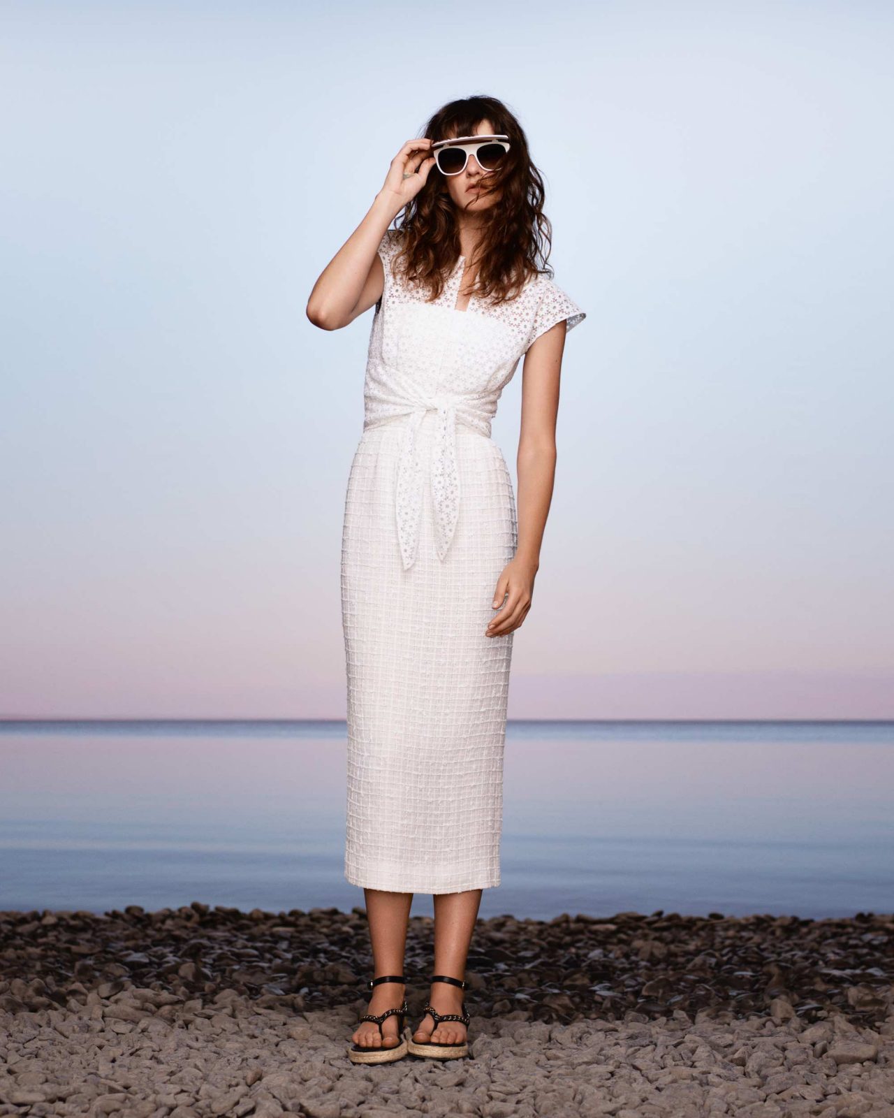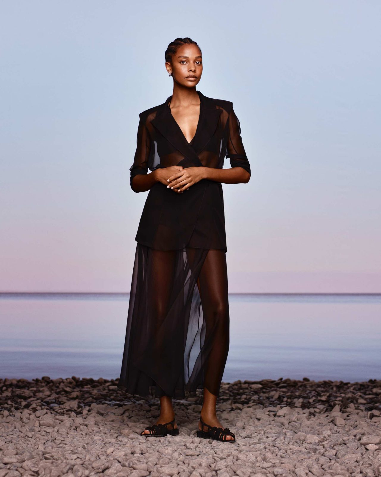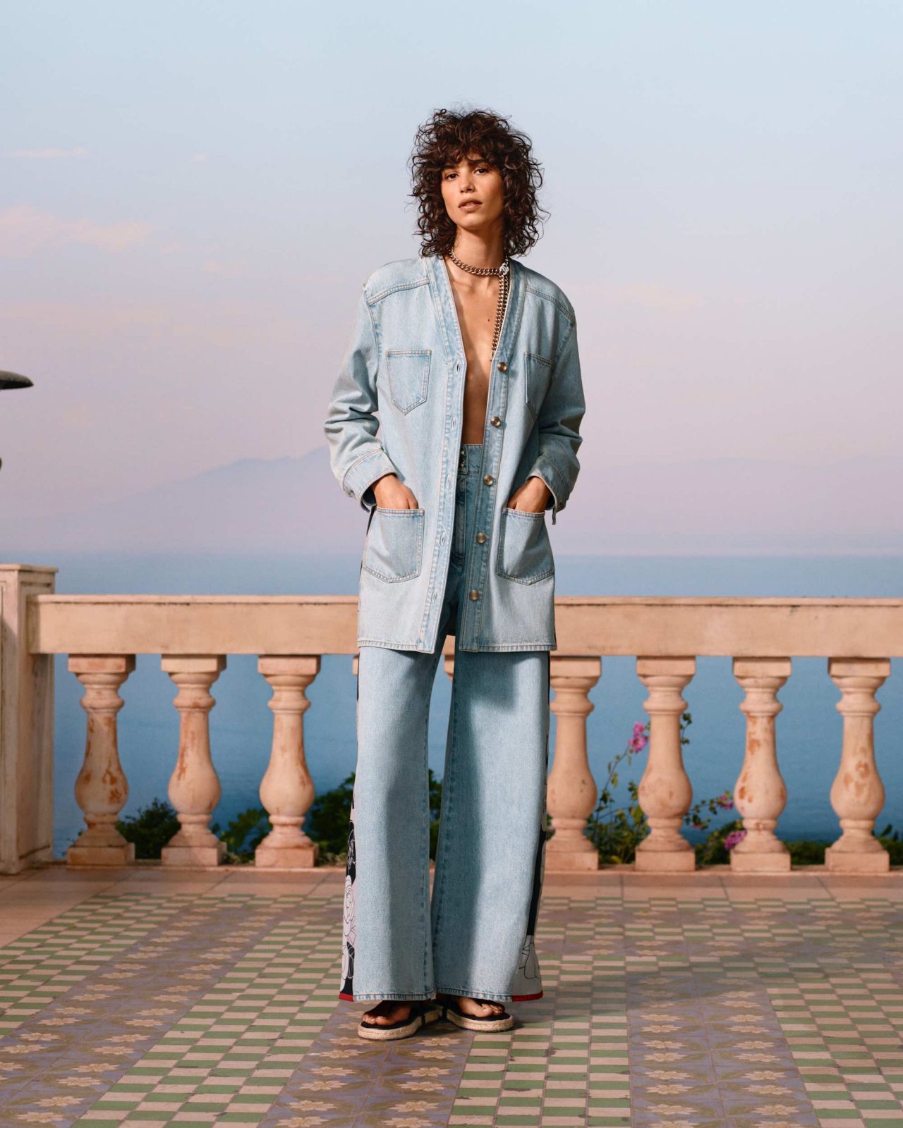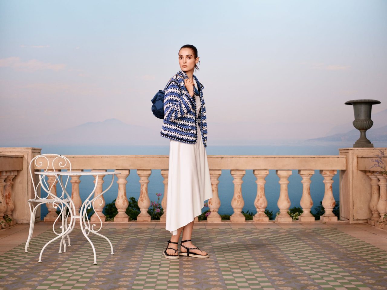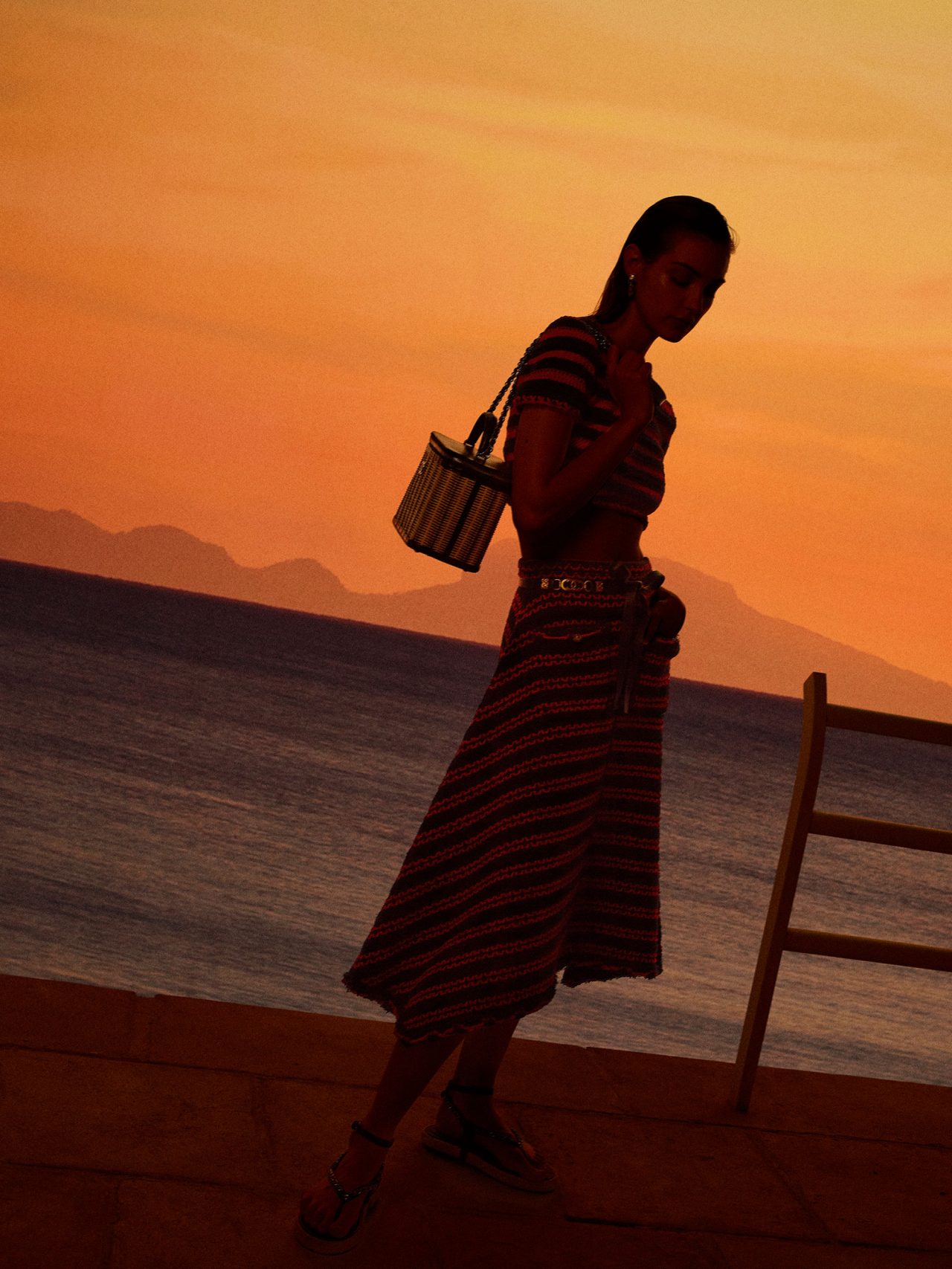 大胆なカッティングやミニスカートから伸びる脚、ブラックのシースルードレスやツイードジャケットにスイムウェアの組み合わせ、開放的でリラックスしたムードが満ちるコレクションには、イタリアやフランスのリヴィエラで休暇を過ごした1960年代の伝説的な女優たちの姿が重なる。「キャスター付きの小さなスーツケースで持ち運べるワードローブ、トートバッグ、そして刺繍をあしらったハンドバッグ」を携えた身軽な旅をイメージしたという本コレクションは、トータルコーディネートで楽しみたいルックが目白押しだ。