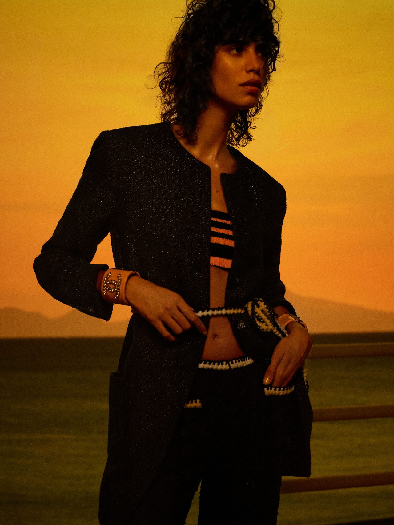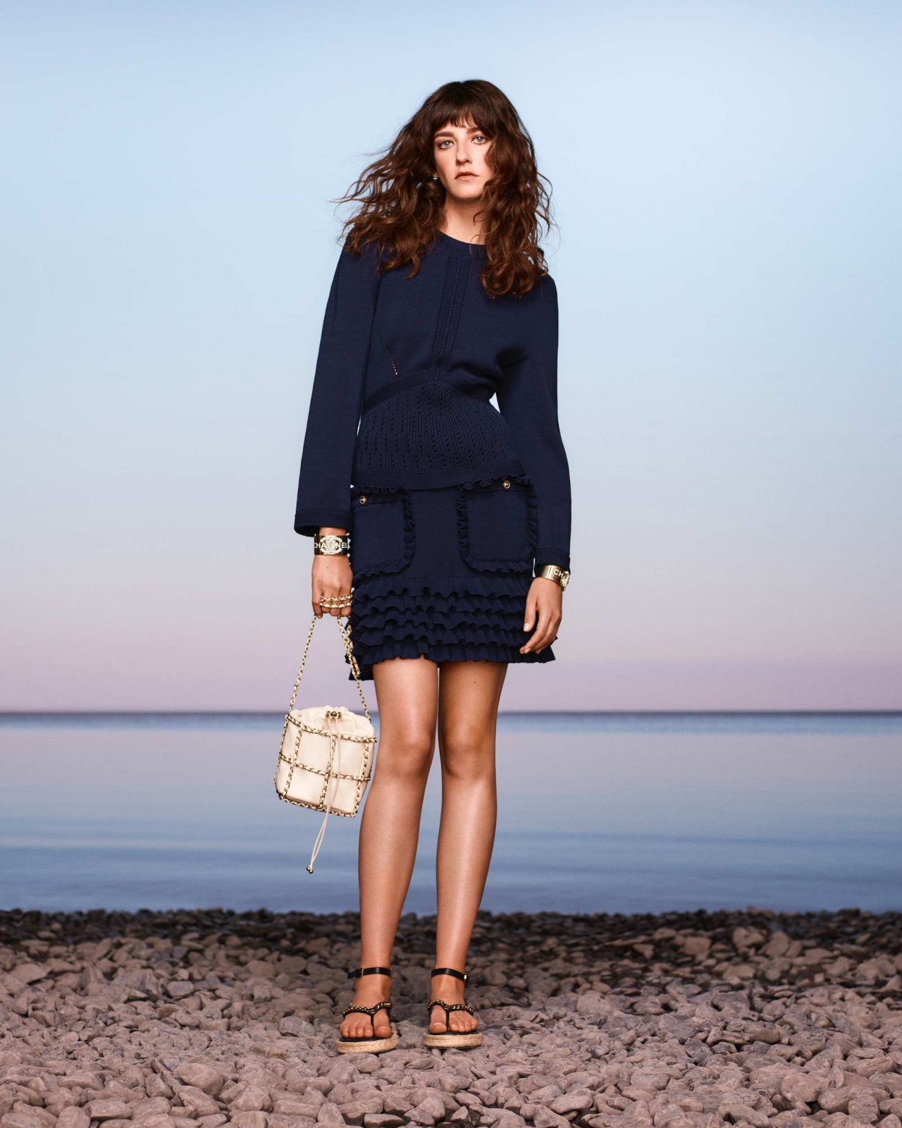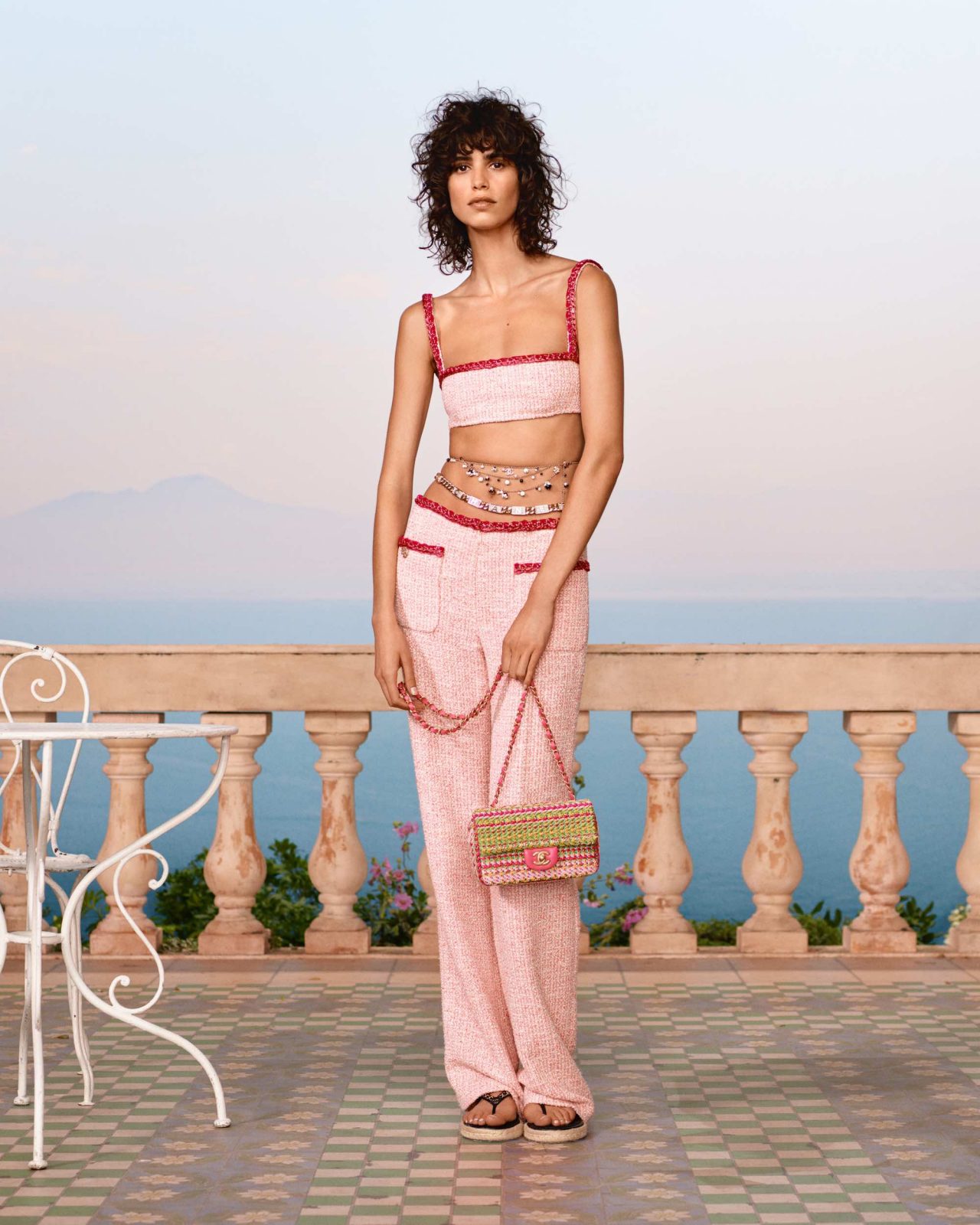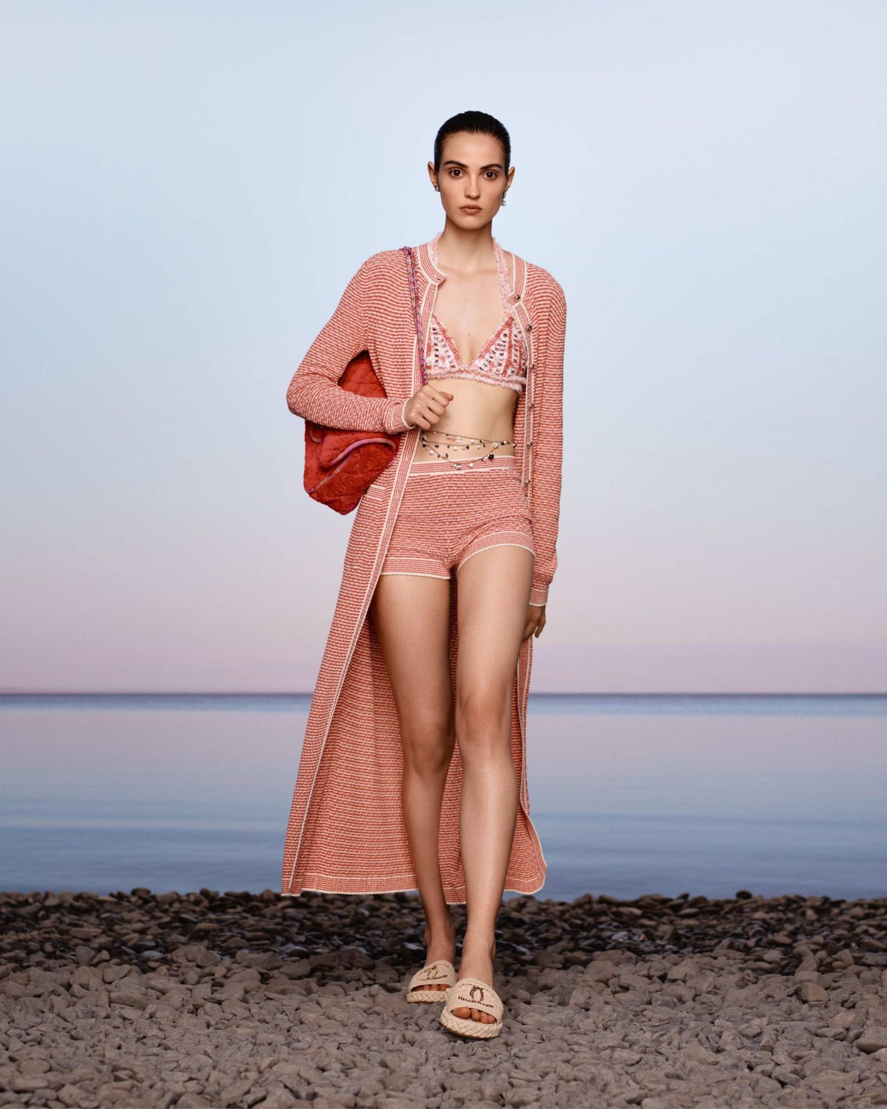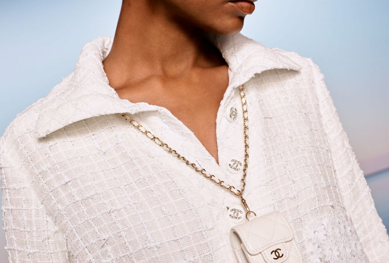 注目したいのが、ウエストでレイヤードされたベルト使いや存在感を放つネックレス、リゾートスタイルにぴったりのバングルといったアクセサリー。Virginie Viard らしい遊び心ある自由な感性が光る。また、スパンコールやビジューをまとったCHANEL のアイコニックなハンドバッグをはじめ、リゾートにぴったりなストロー素材や巾着型、ミニサイズなど様々なバッグが展開されている点も見逃せない。