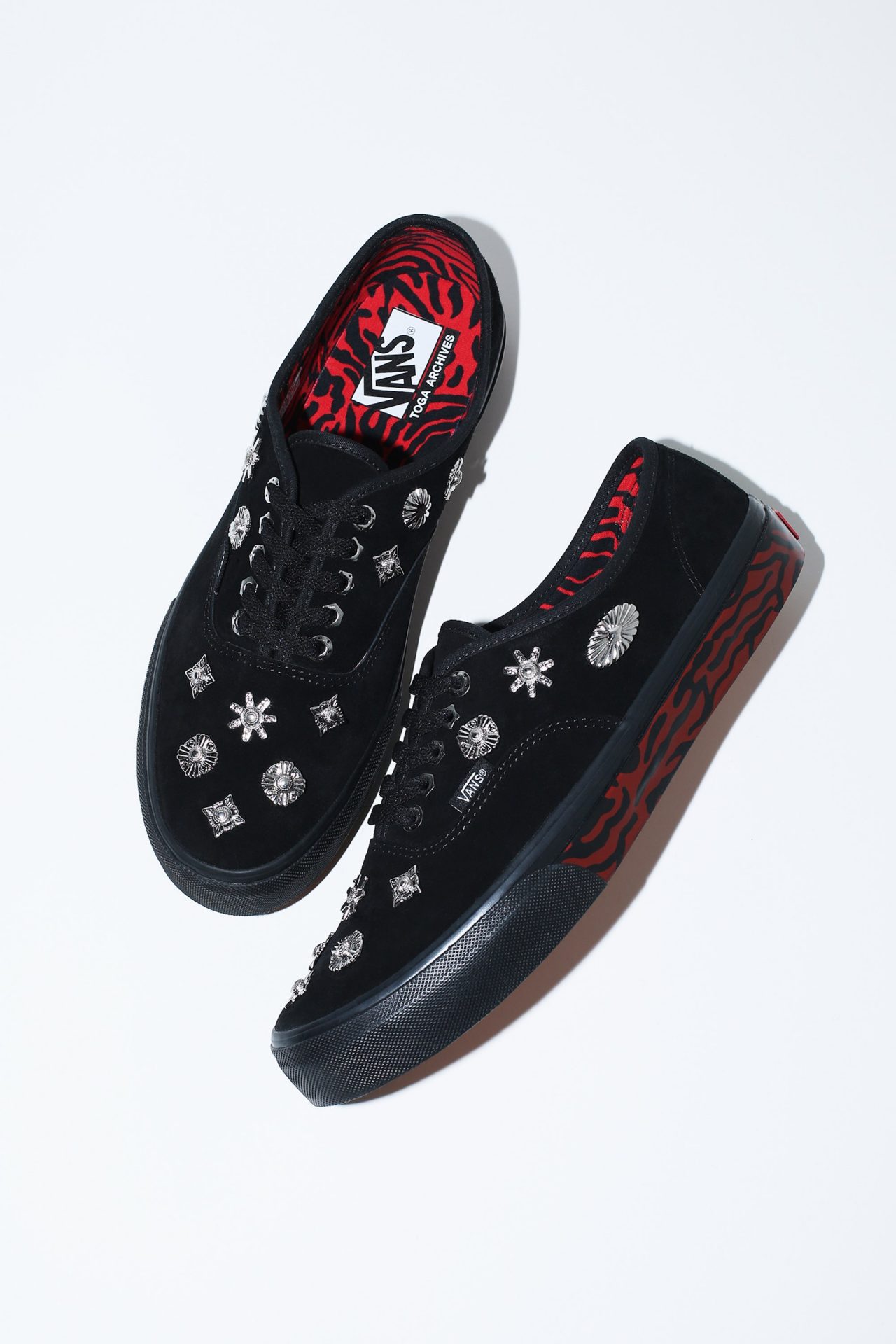 注目したいのは、VANS の歴史を語る上で外すことのできない代表モデル「AUTHENTIC (オーセンティック)」に TOGA のシグネチャーでもあるメタルパーツを落としこんだスニーカー。アッパーにはブラックスエードを採用。ライニングトサイドテープに配されたタイダイプリントがファンの心をくすぐる。