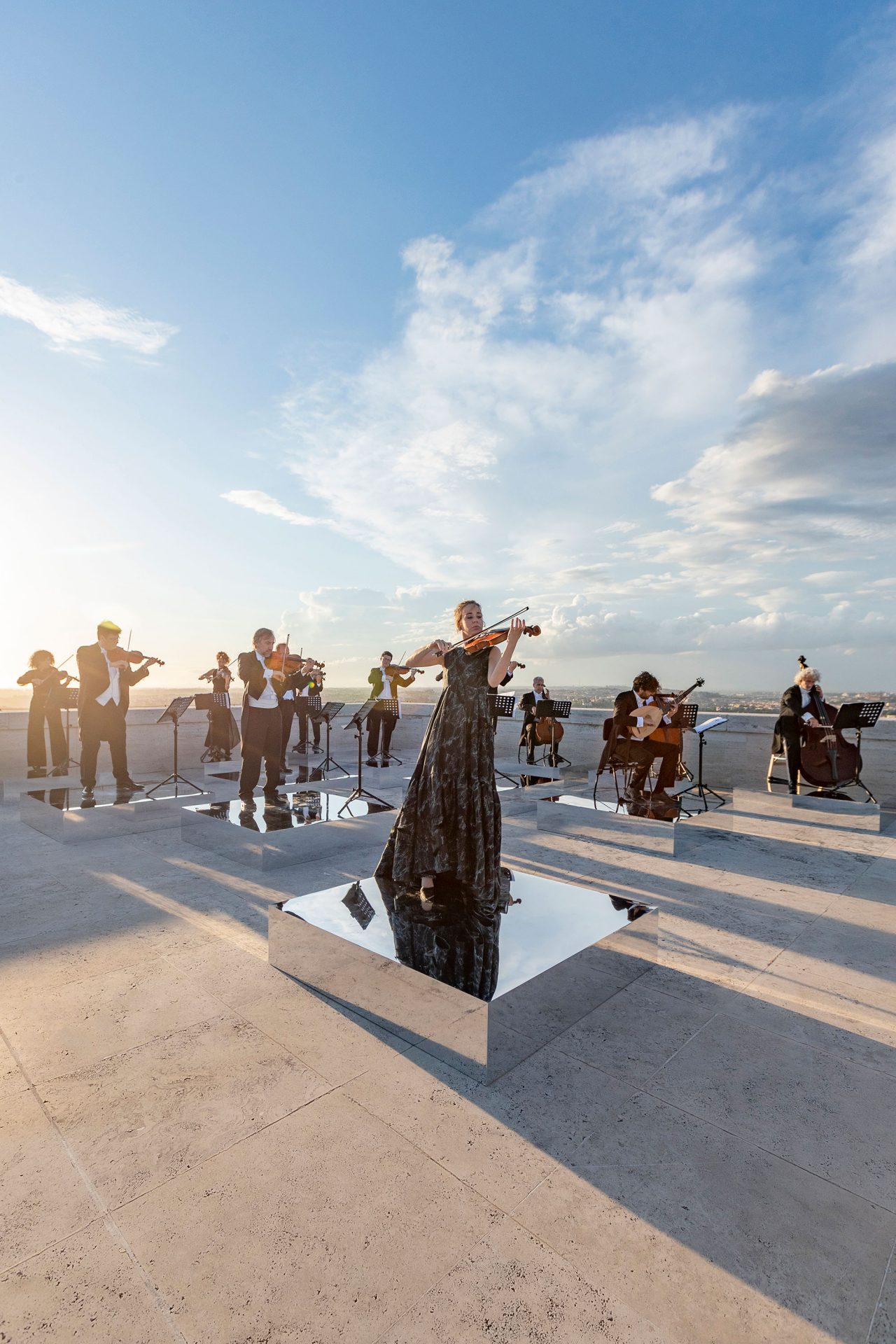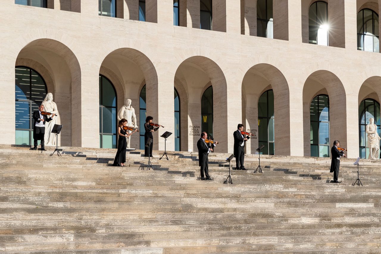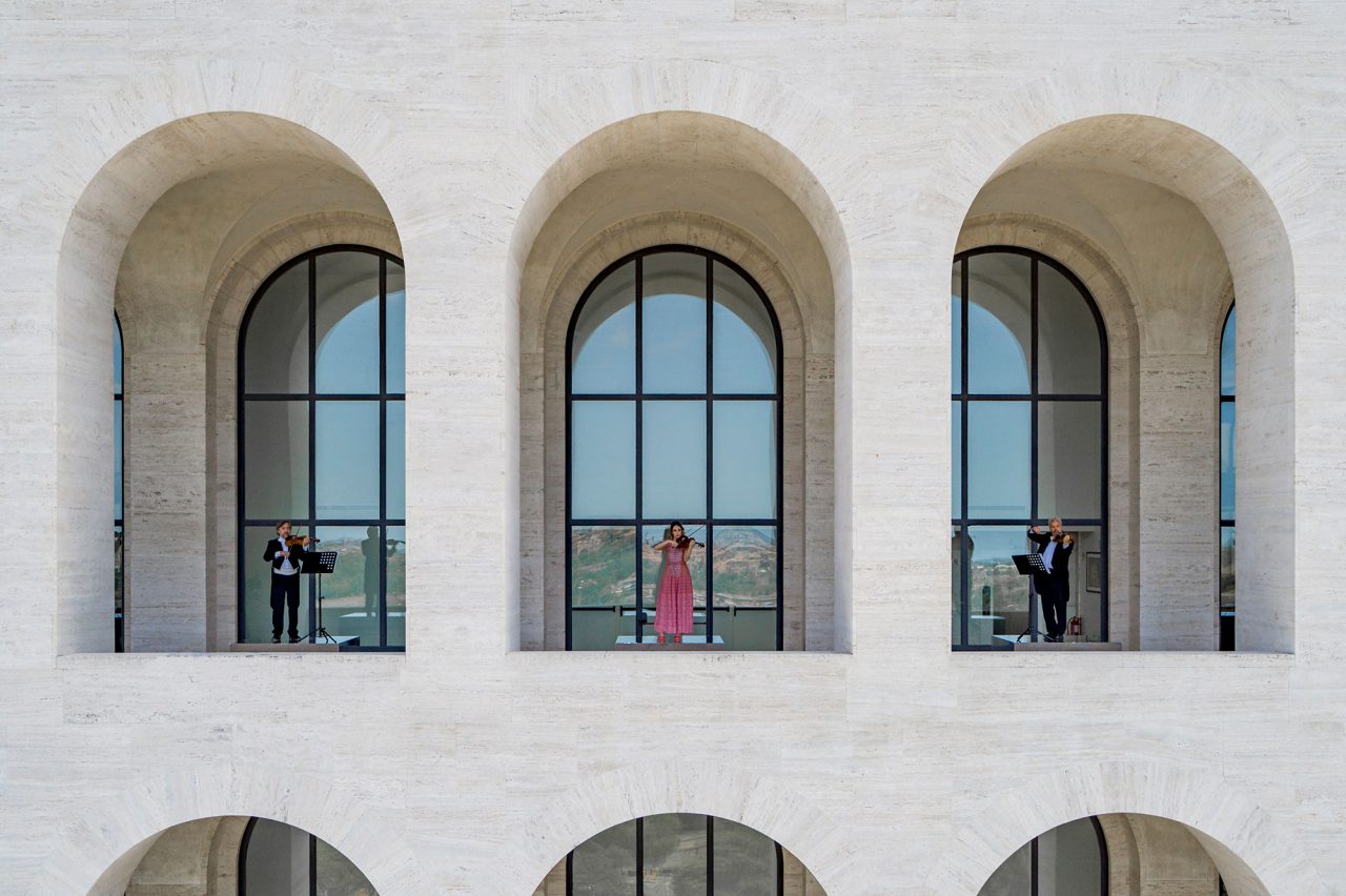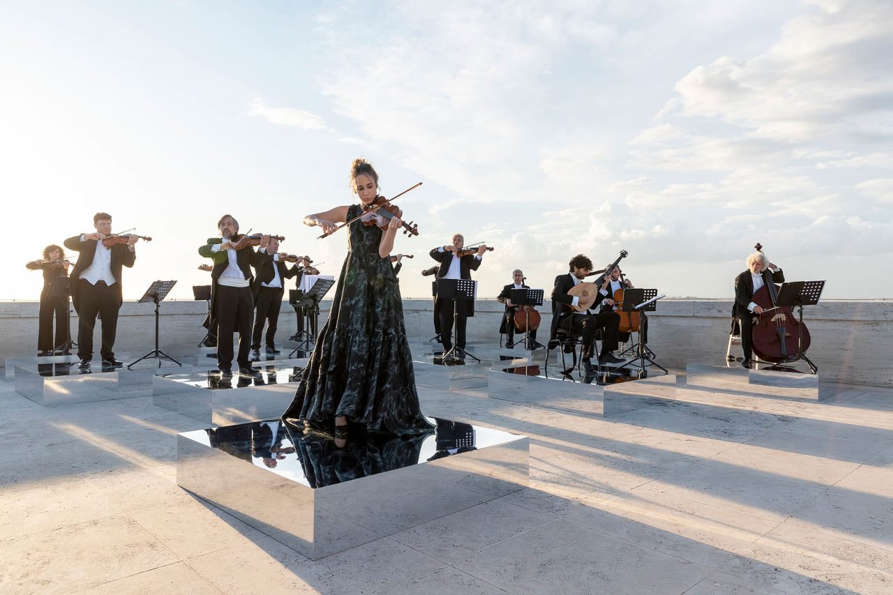 本公演で、Fendi はイタリアを代表するオーケストラのひとつであるサンタ・チェチーリア国立管弦楽団と著名バイオリニストの Anna Tifu (アンナ・ティフ) を招聘。Fendi が本拠を置くローマの「イタリア文明宮」を舞台に Antonio Vivaldi (アントニオ・ヴィヴァルディ) 作曲の「四季」から「夏」が披露された。