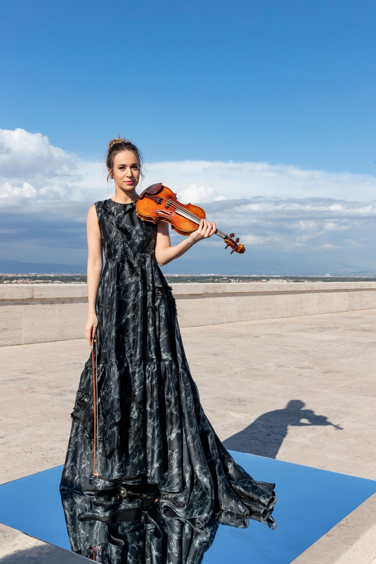 Anna Tifu は、イタリア・サルデーニャ島南部の都市カリアリ出身の女性バイオリニスト。11歳でソリストとしてフランス国立ロワール管弦楽団と共演してデビューを果たし、12歳でミラノスカラ座で演奏を披露した。これまで世界有数のオーケストラや室内楽団、世界的に有名な指揮者と共演を重ね、同世代有数のバイオリニストのひとりとして高い評価を集めている。本公演では、3着の Fendi のクチュールコレクションを纏い、かつてナポレオンが所有していたという史上最高のバイオリン製作者 Antonio Stradivari (アントニオ・ストラディヴァリ) の1716年製の「マレシャル・ベルティエ」を演奏している。