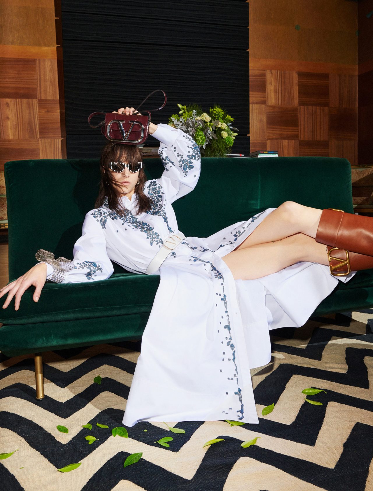 Pierpaolo Piccioli (ピエールパオロ・ピッチョーリ) は今回、このアーカイブをふたたび再解釈し、新たにワードローブへと落とし込んだ。コレクションに並ぶのは、「Valentino Bluegrace」モチーフから60年代、70年代のフローラルプリントやジオメトリックプリントをあしらったドレスやクレープチュールのスカート、シャツやシルクストール。またメゾンの新たなアイコンバッグ「Vスリング」にもフローラルプリントがほどこされた新作もお目見えした。