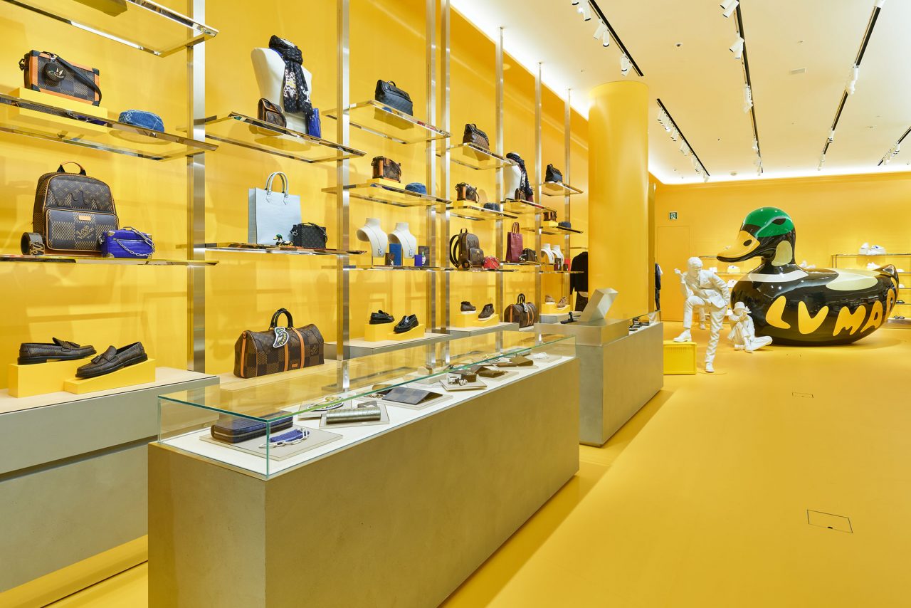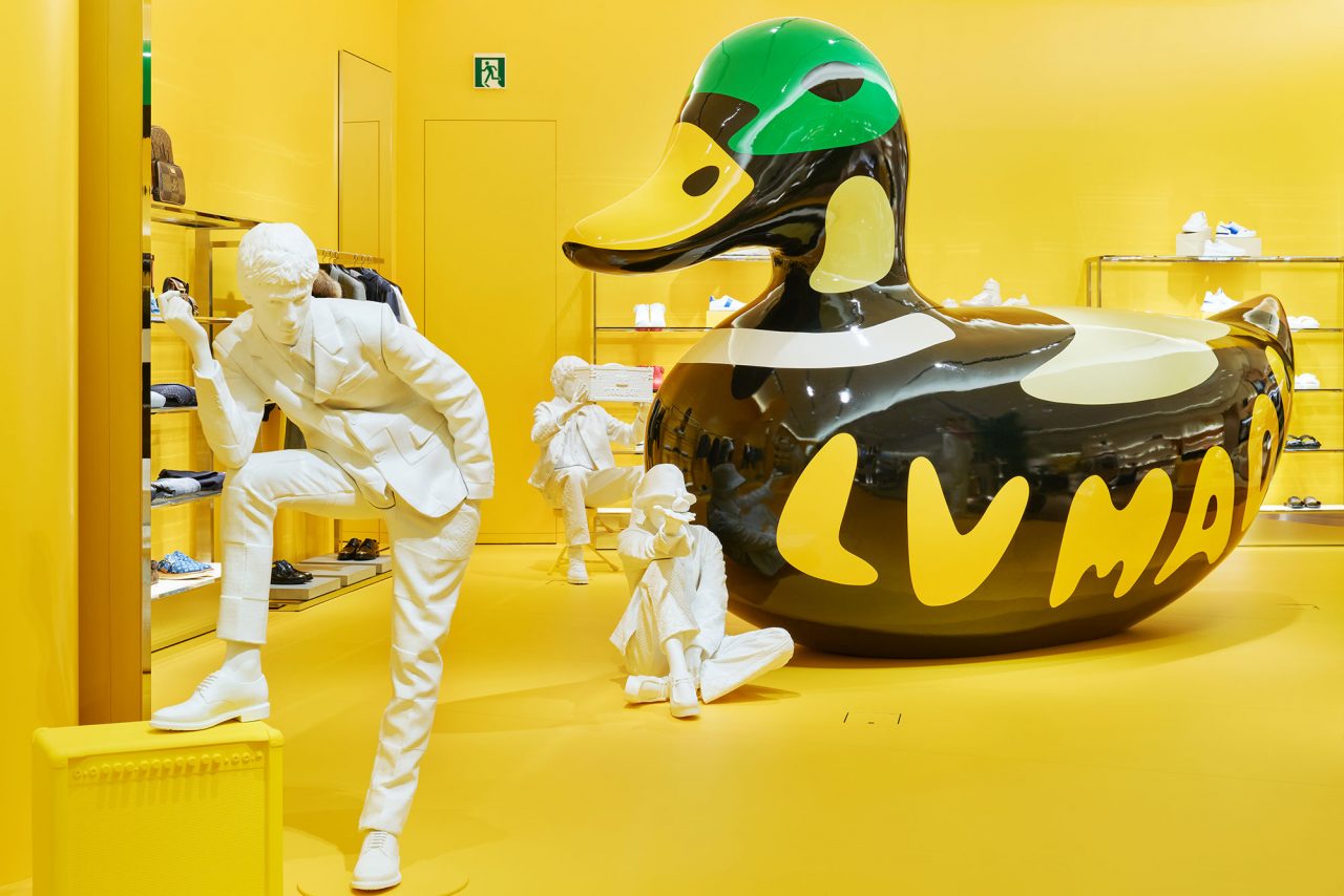 新たにオープンする「ルイ・ヴィトン 渋谷メンズ店」は、2フロアの広々とした店内に Virgil Abloh (ヴァージル・アブロー) が手掛けるメンズコレクションからプレタポルテ、レザーグッズ、シューズ、アクセサリー、サングラス、フレグランス、トラベル、ウォッチ&ファインジュエリーなど全ラインナップが一堂に集結。明るく照らし出されたファサードが目印となっており、オープンを祝して Virgil Abloh と NIGO® がコラボレーションした話題の「ルイ・ヴィトン LV スクエアード コレクション」の世界観を表現したツイストメタルとガラスによるアイコニックなダミエ・パターンに彩られる。エントランスを抜けると、すぐ目に入ってくるのは高さ3mほどの「LV Made (LVメイド)」ダックのスカルプチャー。NIGO® が手掛ける「Human Made (ヒューマン・メイド)」のシグネチャーを Louis Vuitton 風に再解釈したモチーフで、コレクションの象徴となっている。