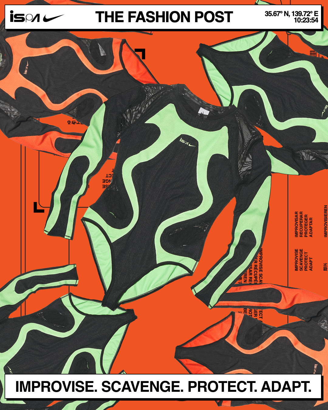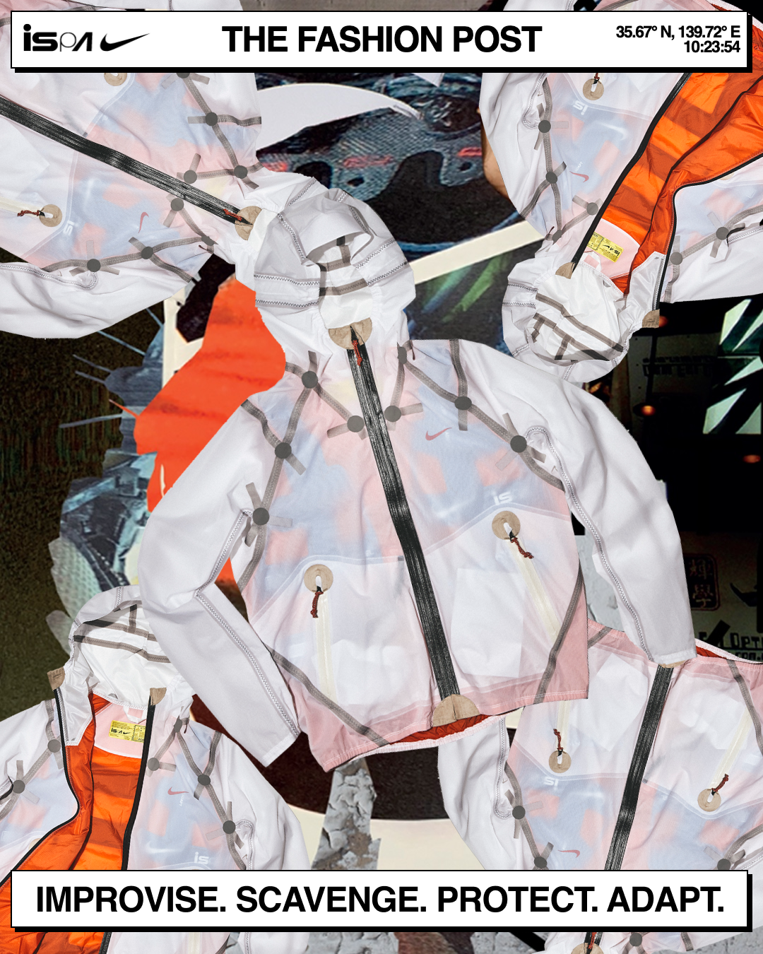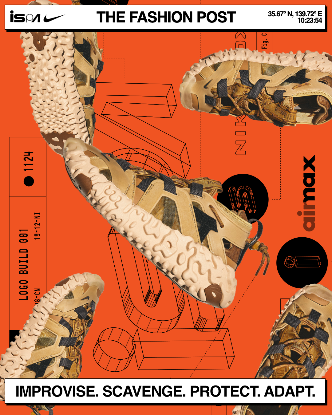 NIKE ISPA を形成するのは、Improvise (即興的工夫)、Scavenge (徹底的な素材の活用)、Protect (守る)、Adapt (応用する、適用させる) という4つの哲学。その目的は、人工的な環境の中にあるユニークかつ変化を続ける課題に対応できる画期的なプロダクトを開発することとし、実験を進めながら、日常で直面する問題を解決する先進的なソリューションとして、機能性と実用性を優先させた適応力の高いフットウェアやアパレルを開発している。
