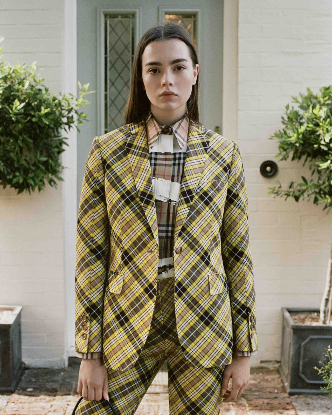 Burberry のハウスカラーであるベージュをはじめ、バーチブラウンやグレー、ブラックといったベーシックカラーを基調にしながらも、マリーゴールドイエローやシトラス、ピンクといった華やかな色合いがコレクションにコントラストをプラス。チェック×チェックのレイヤードやウエストを絞るスポーツストライプ、アウターウェアにあしらわれたオーバーサイズのポケットなどそれぞれギミックが効いたルックの数々は見ているだけで楽しい。