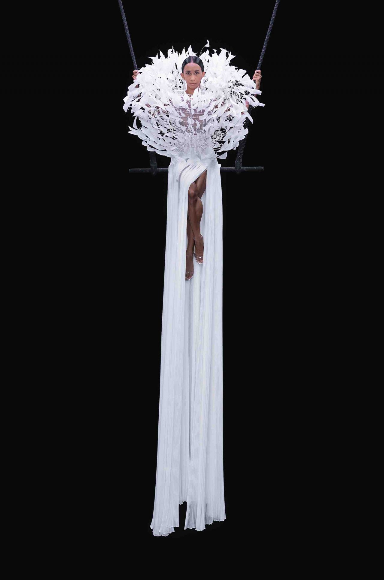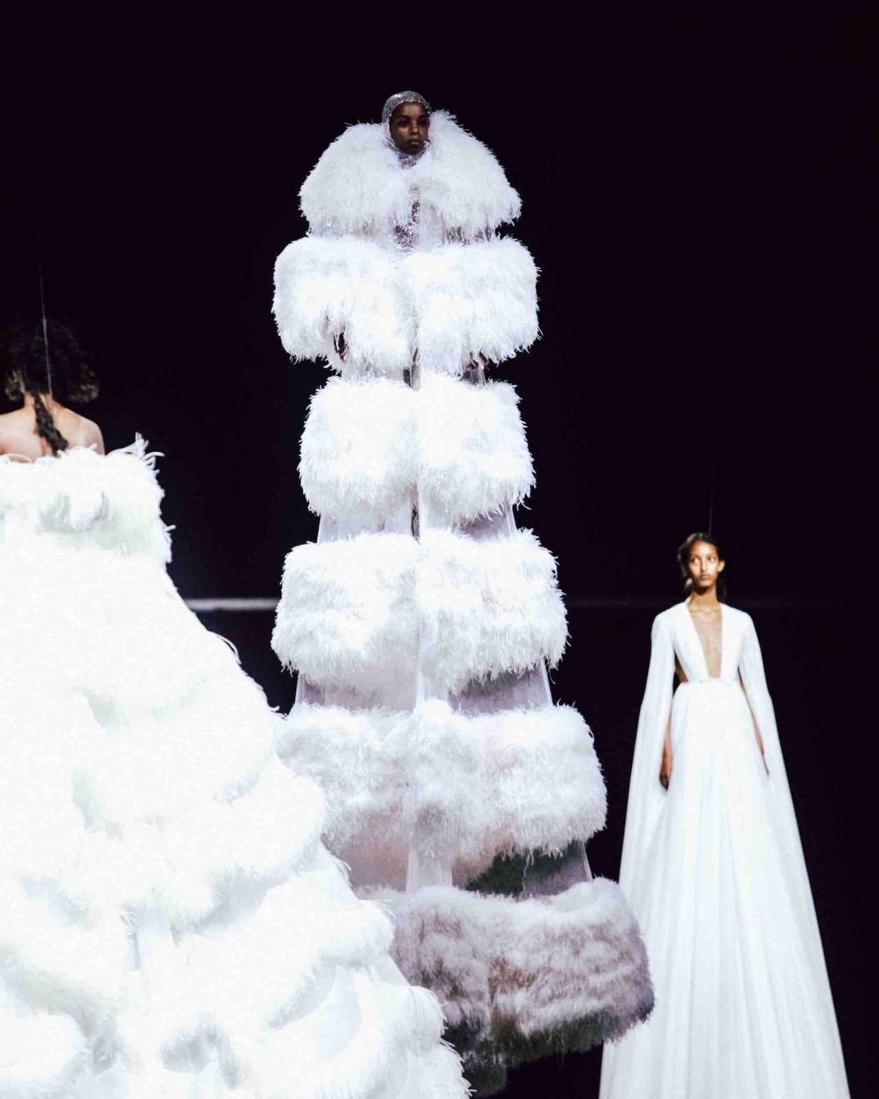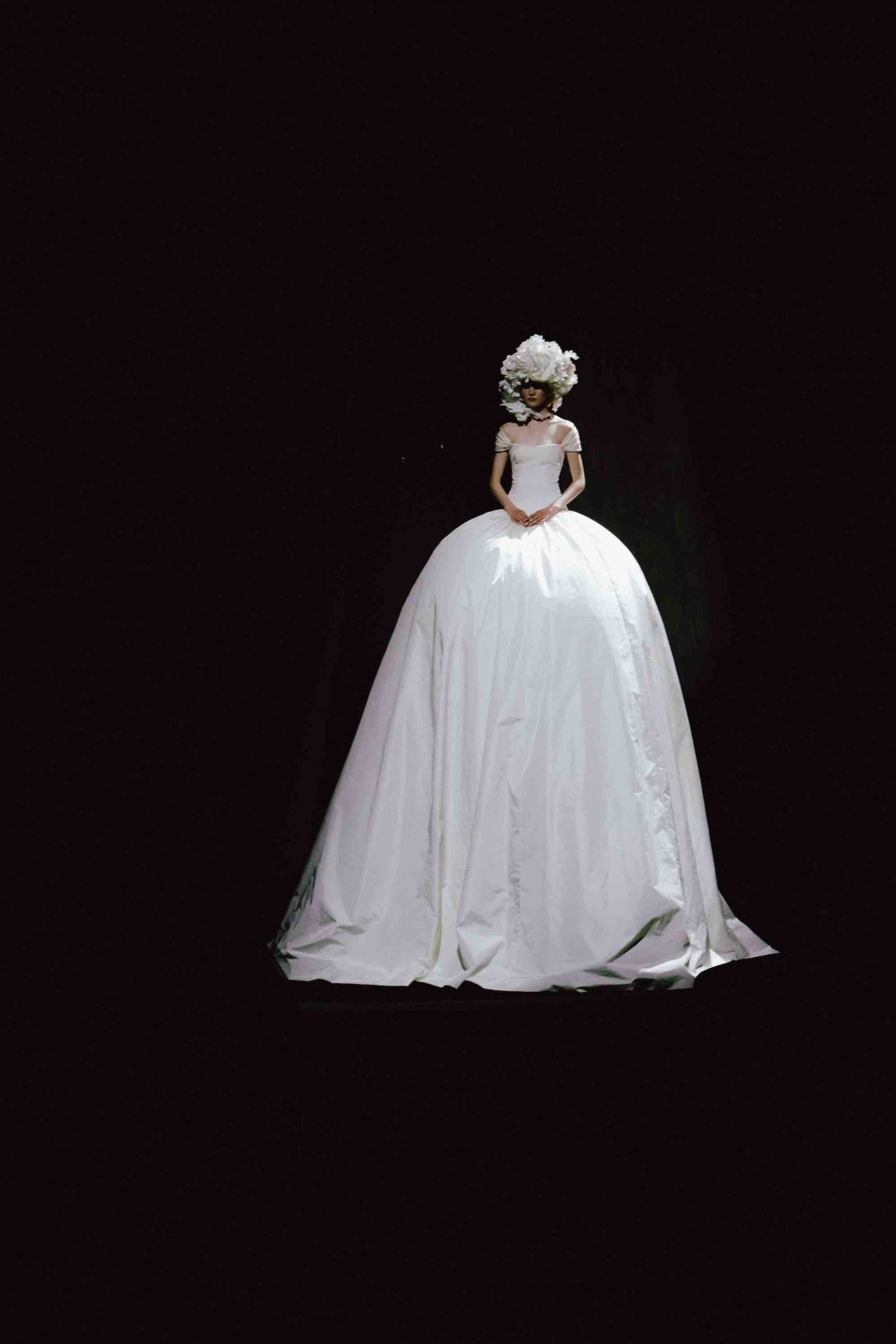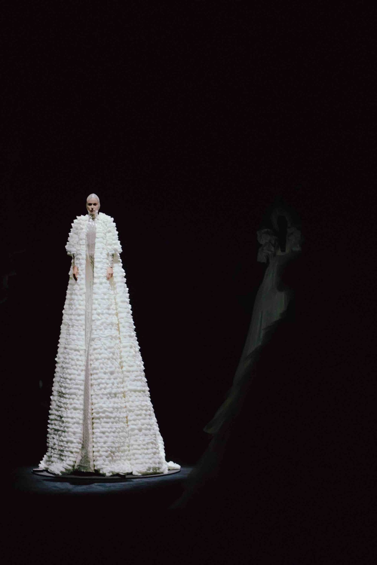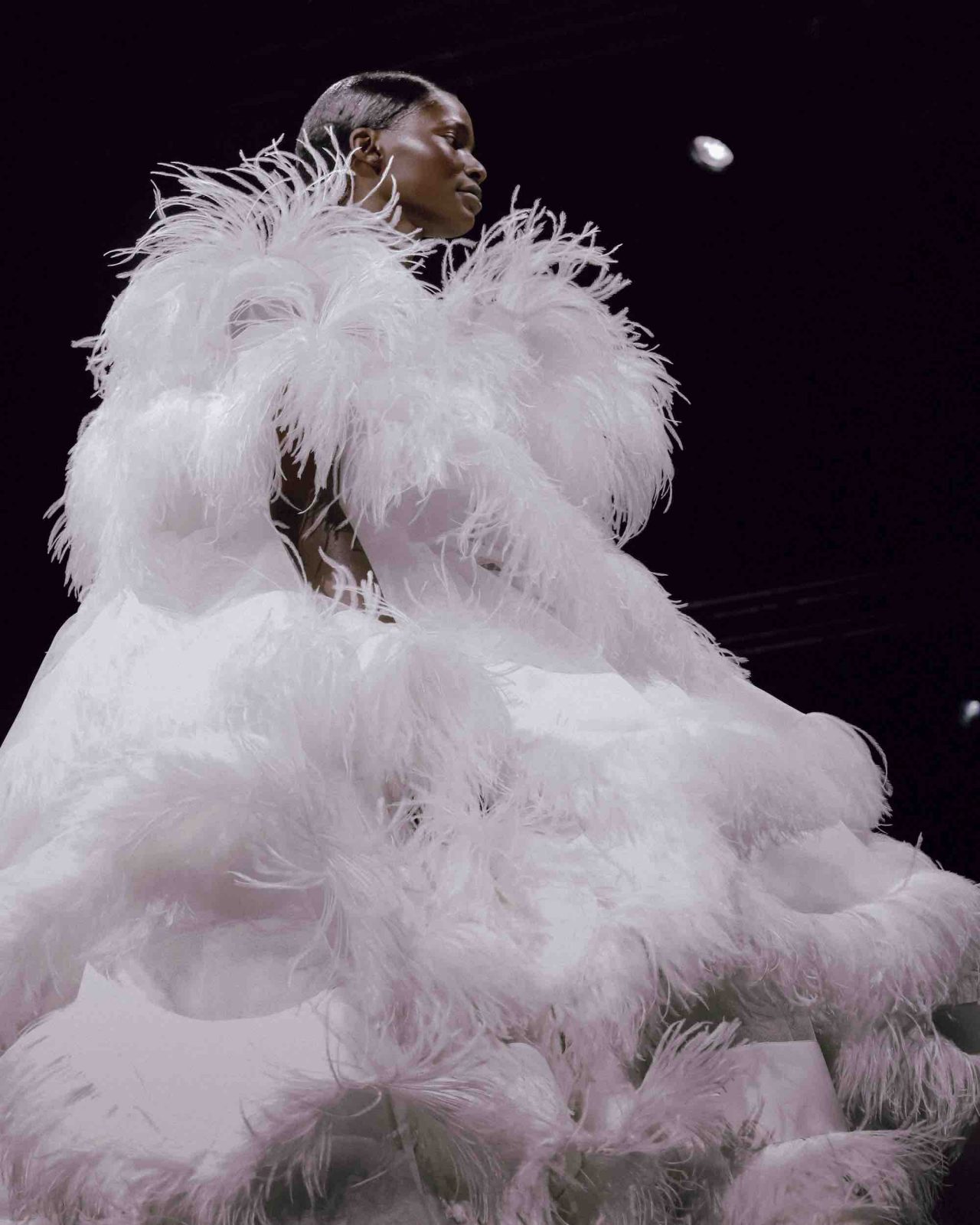 真っ黒な空間の中、光に照らしだされたシルエットの影から始まったライブパフォーマンス。贅沢にフェザーをあしらったドレスかと思いきや、モデルが宙にどんどん浮かび上がると、なんとモデルの背丈の2倍ほどのガウンであることが判明。Nick Knight の映像と相まり、現実に行われていることとは思えない幻想的なショーが幕を開ける。