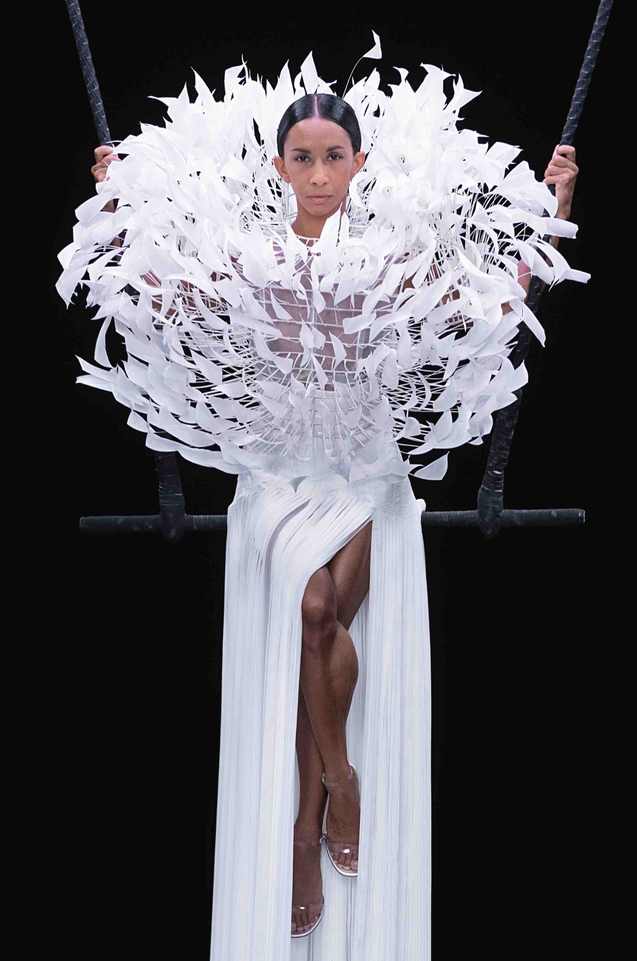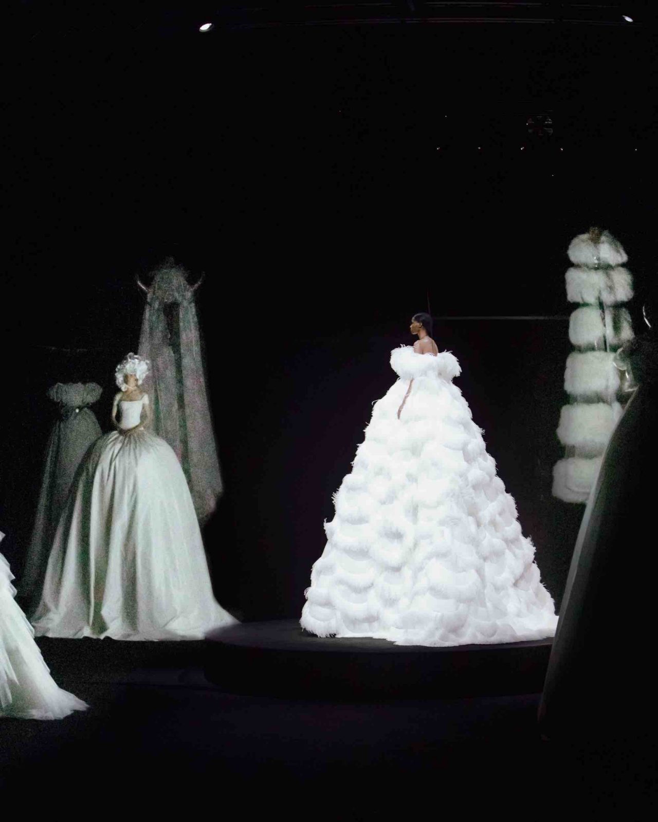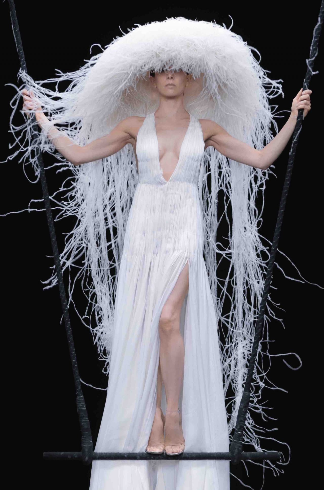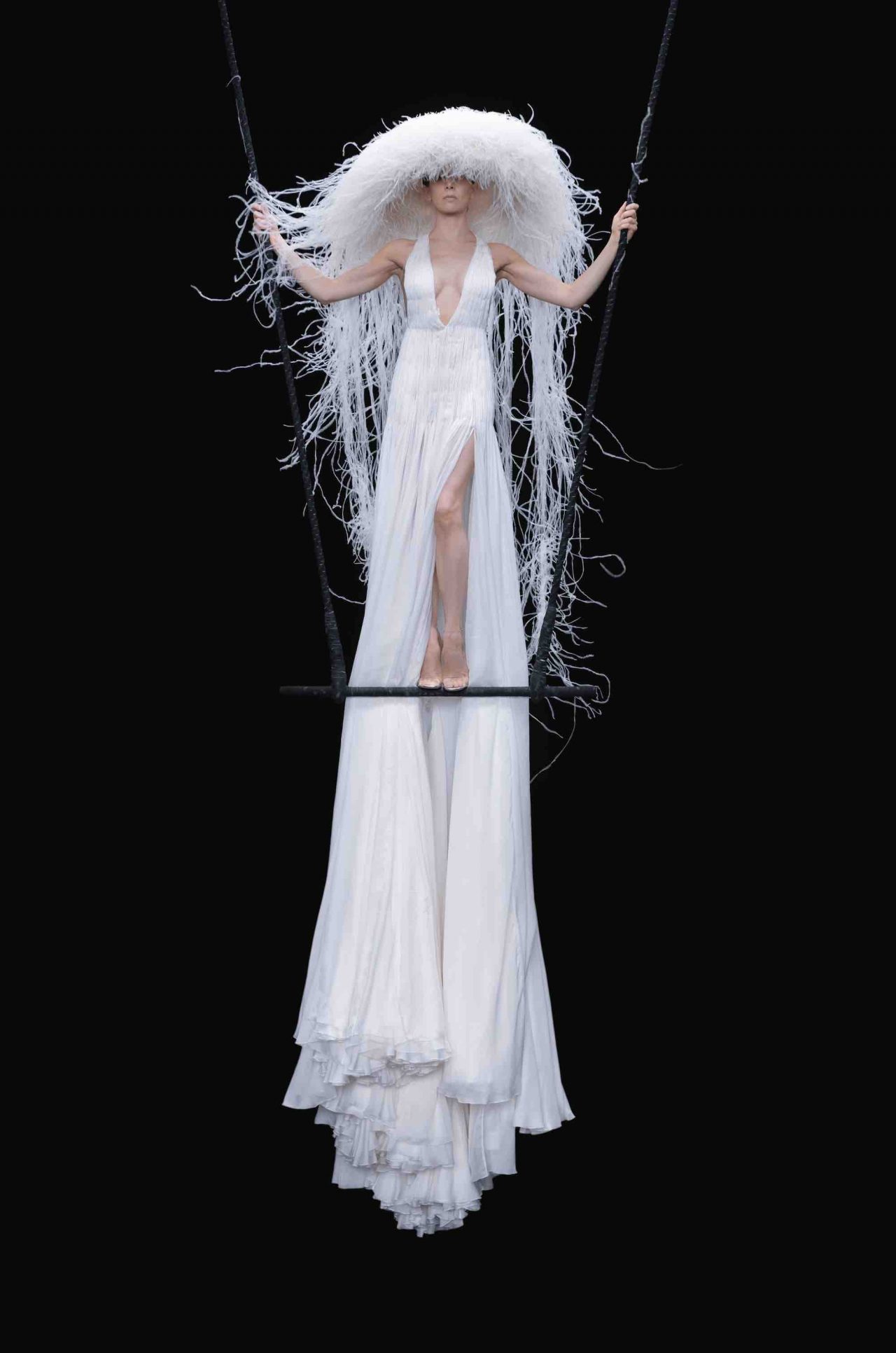真っ黒な空間の中、光に照らしだされたシルエットの影から始まったライブパフォーマンス。贅沢にフェザーをあしらったドレスかと思いきや、モデルが宙にどんどん浮かび上がると、なんとモデルの背丈の2倍ほどのガウンであることが判明。Nick Knight の映像と相まり、現実に行われていることとは思えない幻想的なショーが幕を開ける。