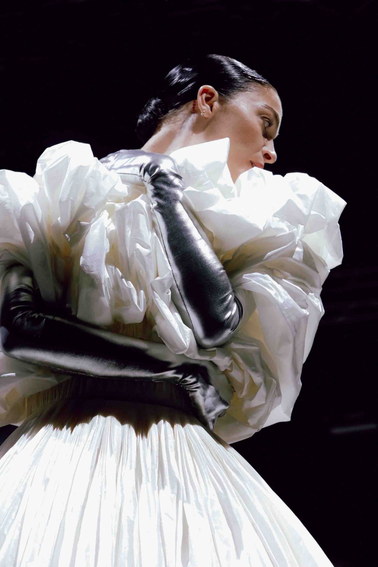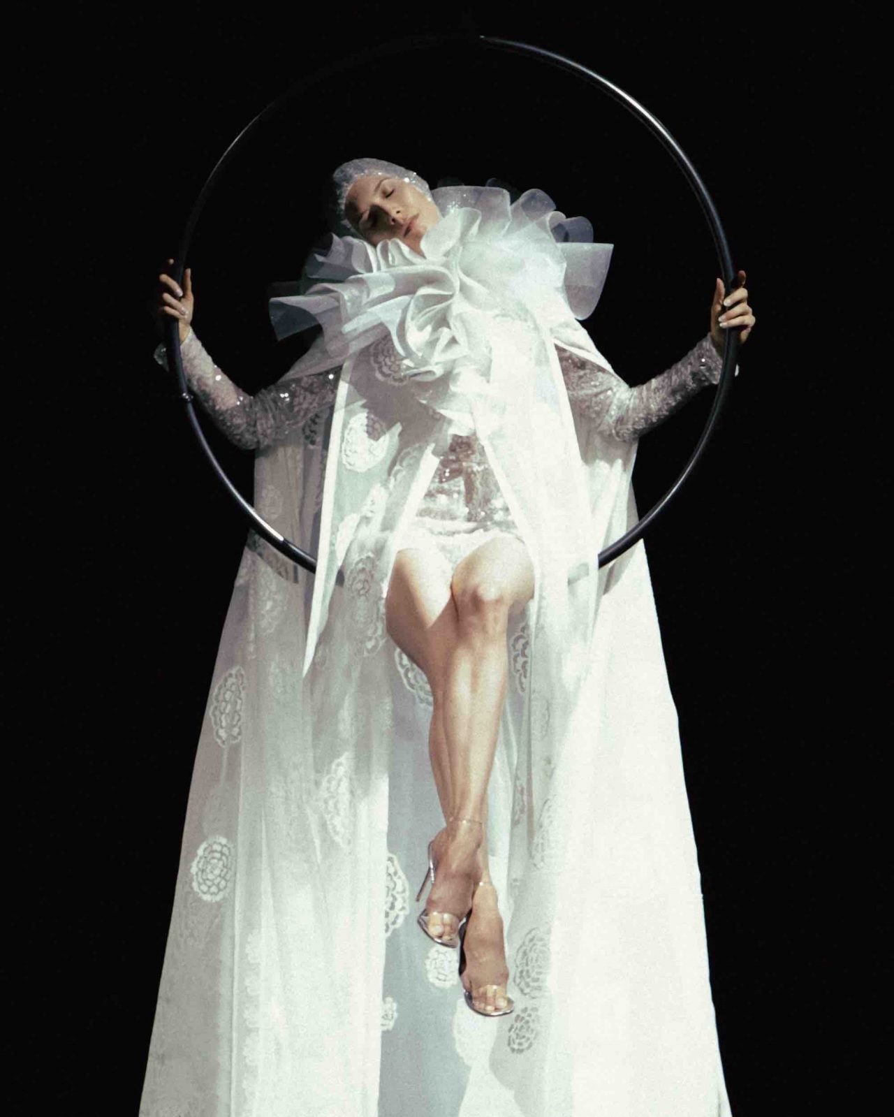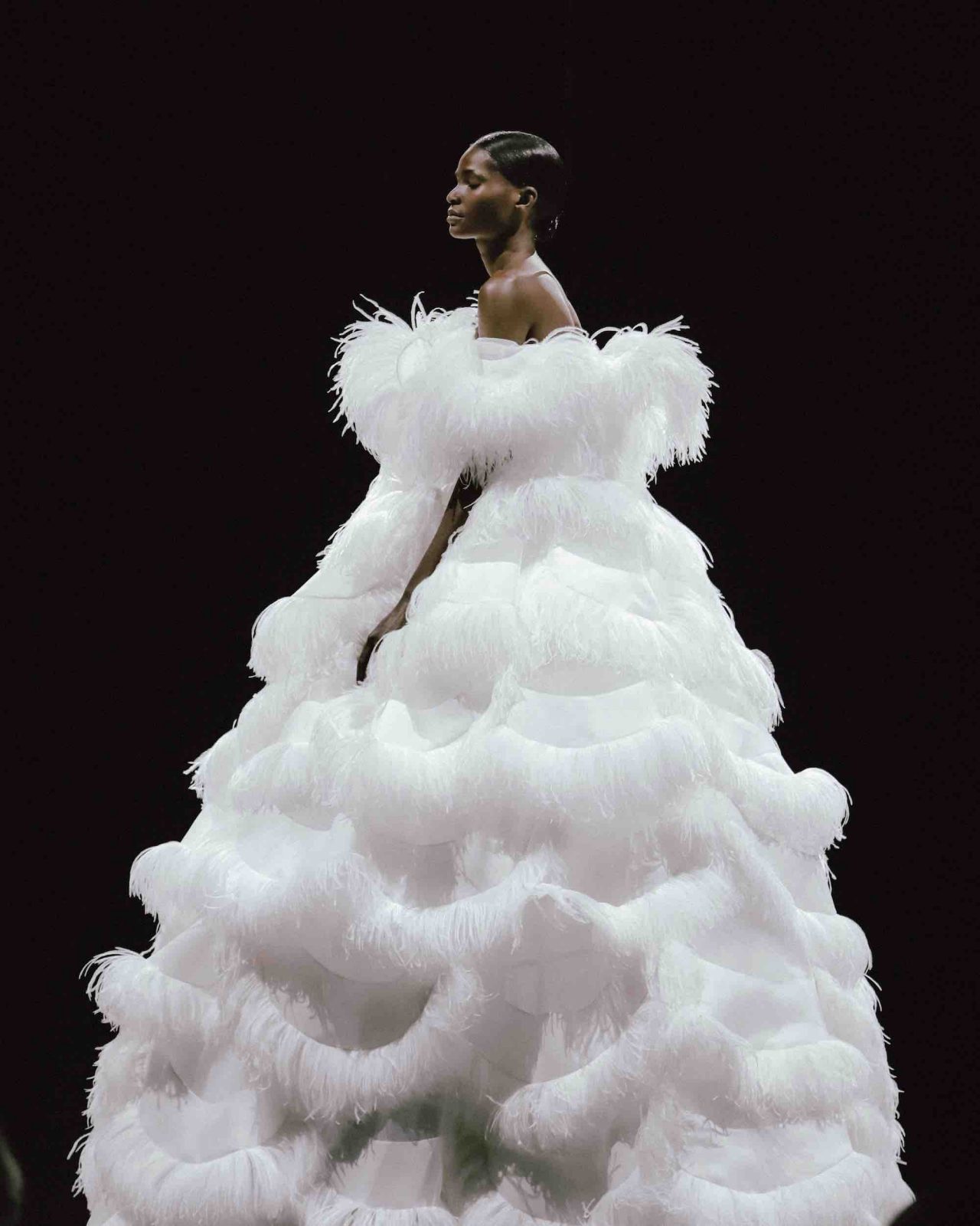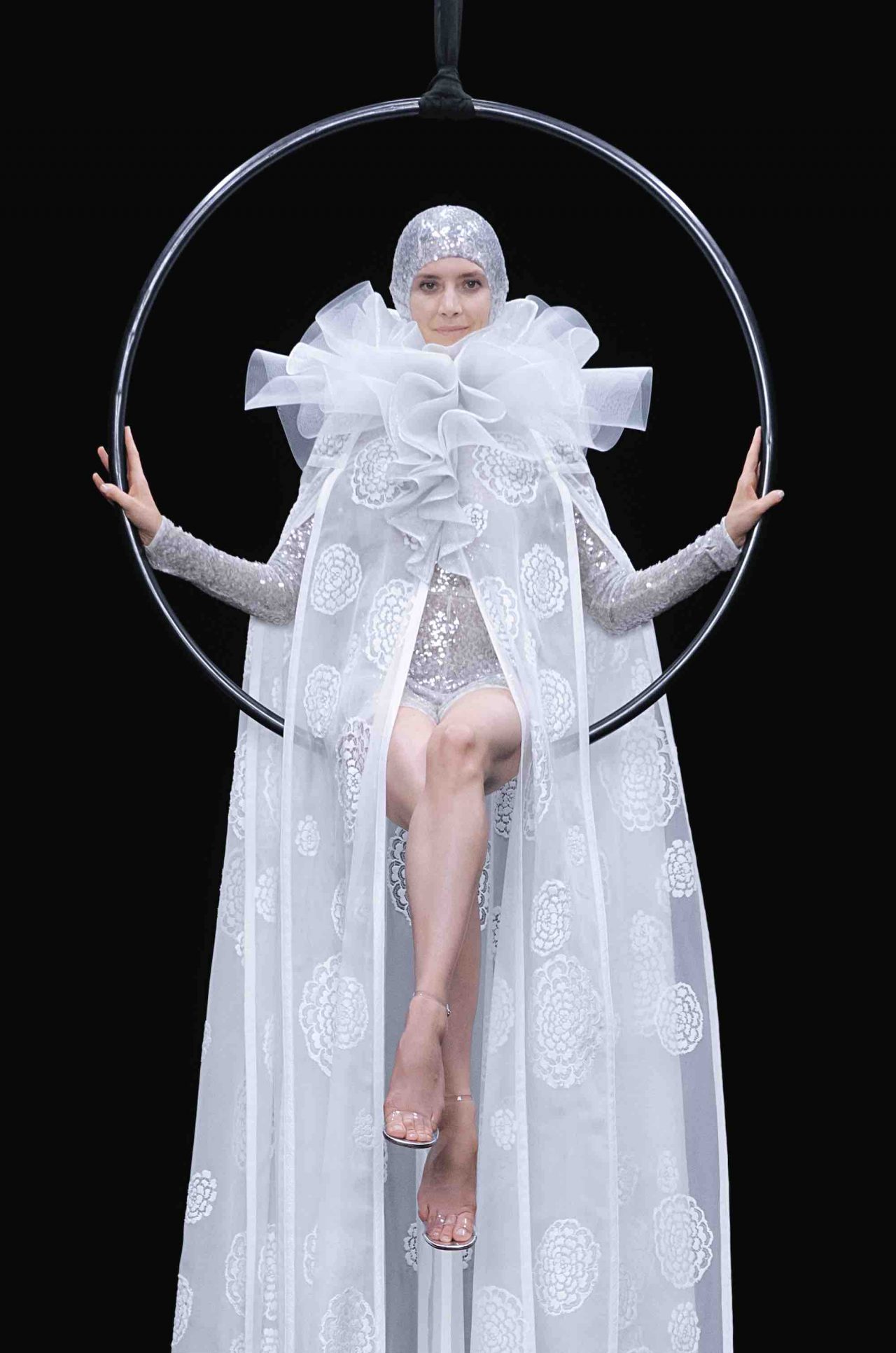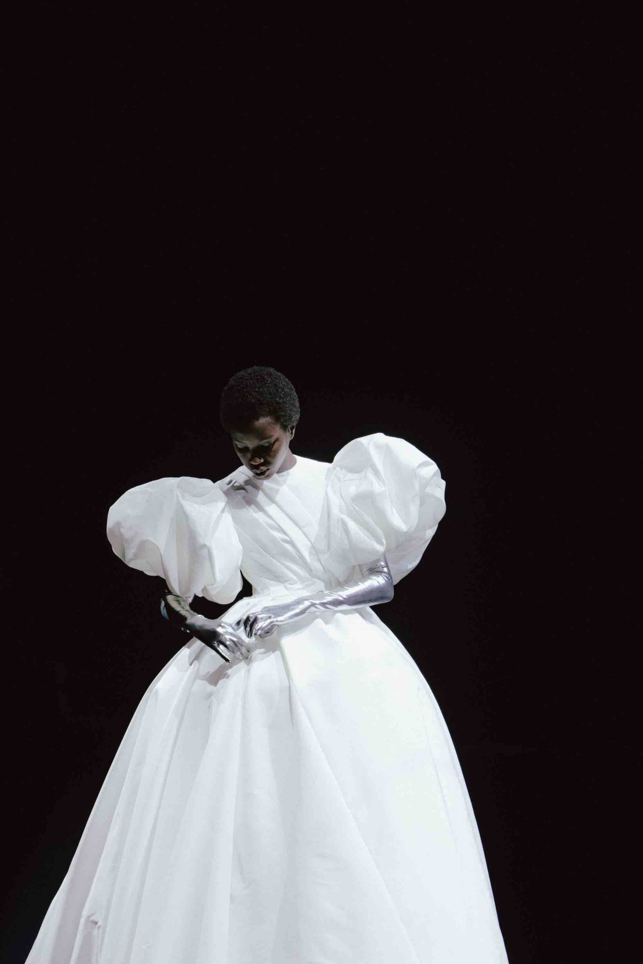 真っ黒な空間の中、光に照らしだされたシルエットの影から始まったライブパフォーマンス。贅沢にフェザーをあしらったドレスかと思いきや、モデルが宙にどんどん浮かび上がると、なんとモデルの背丈の2倍ほどのガウンであることが判明。Nick Knight の映像と相まり、現実に行われていることとは思えない幻想的なショーが幕を開ける。