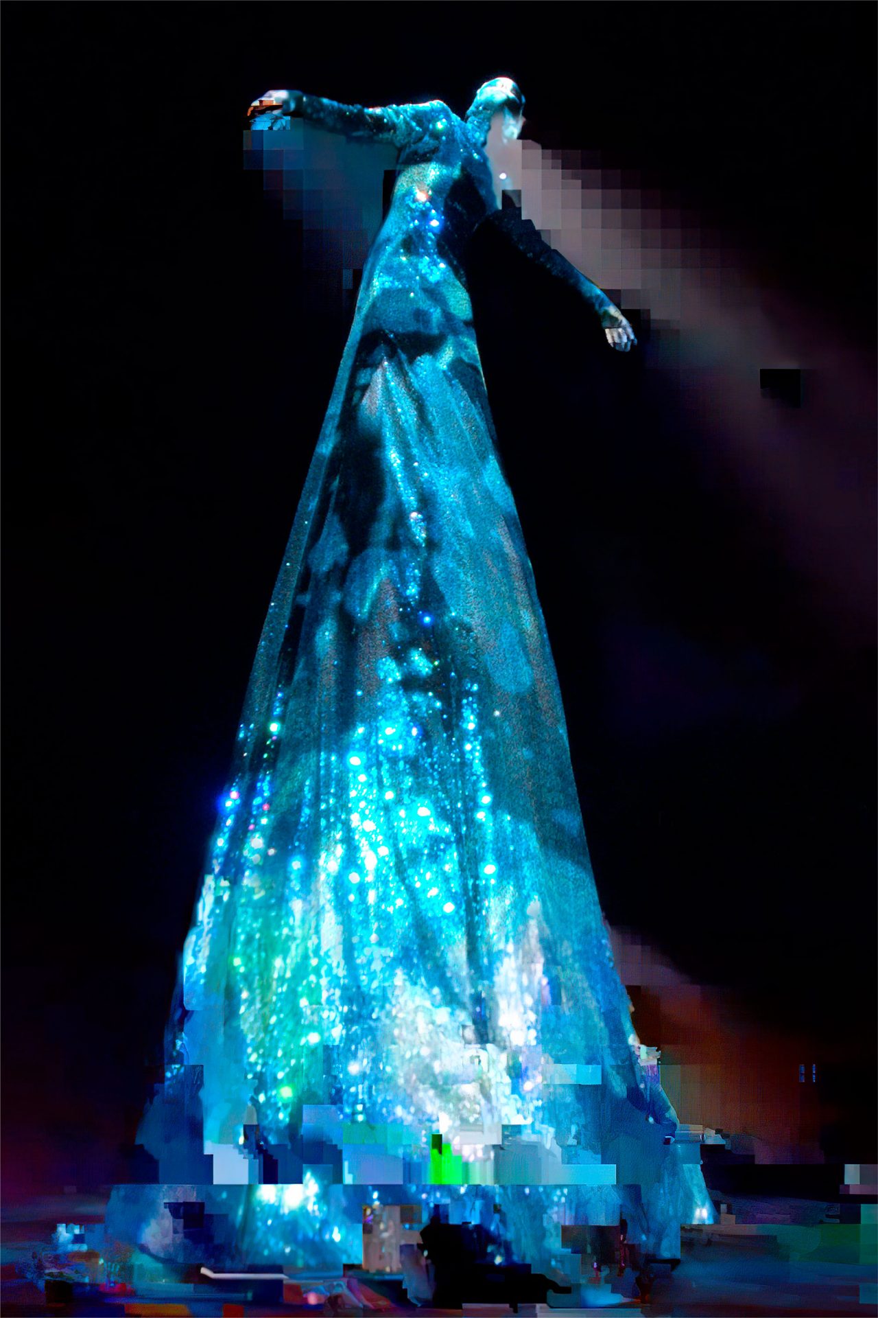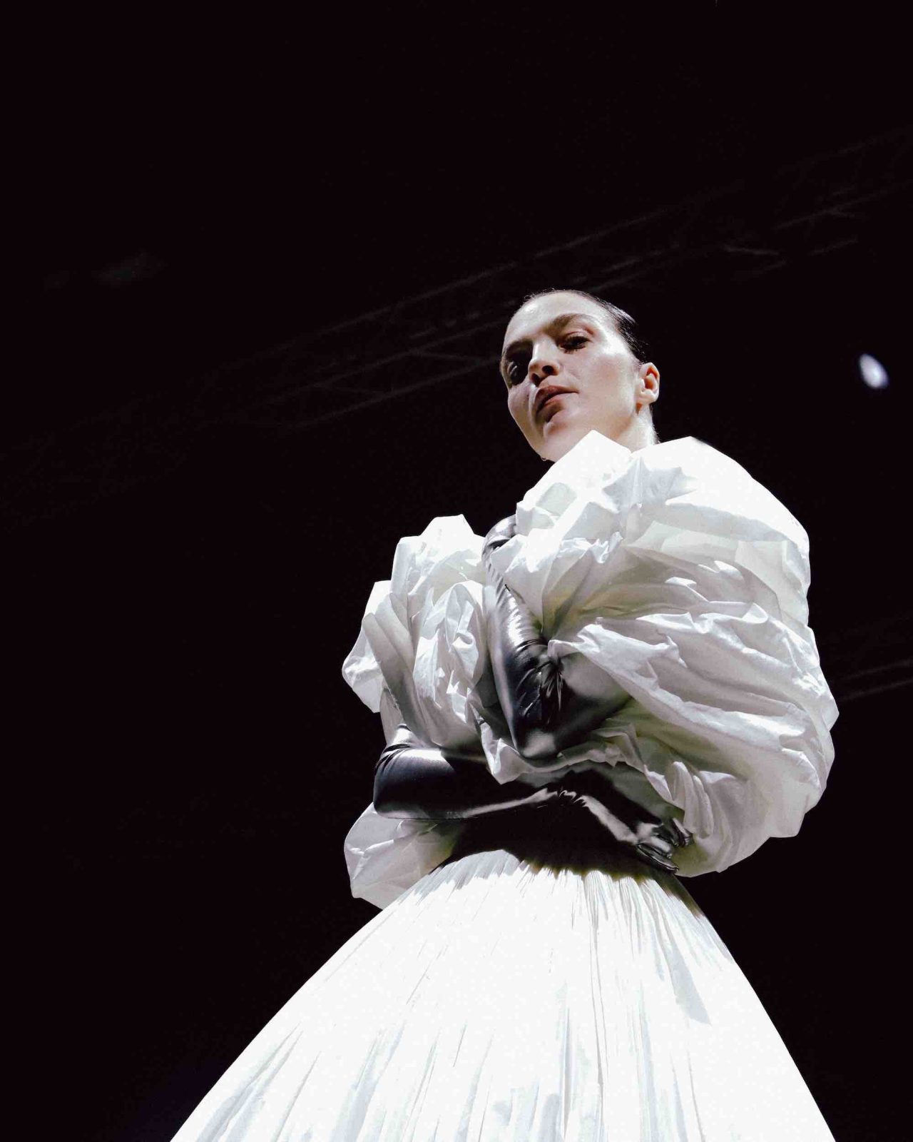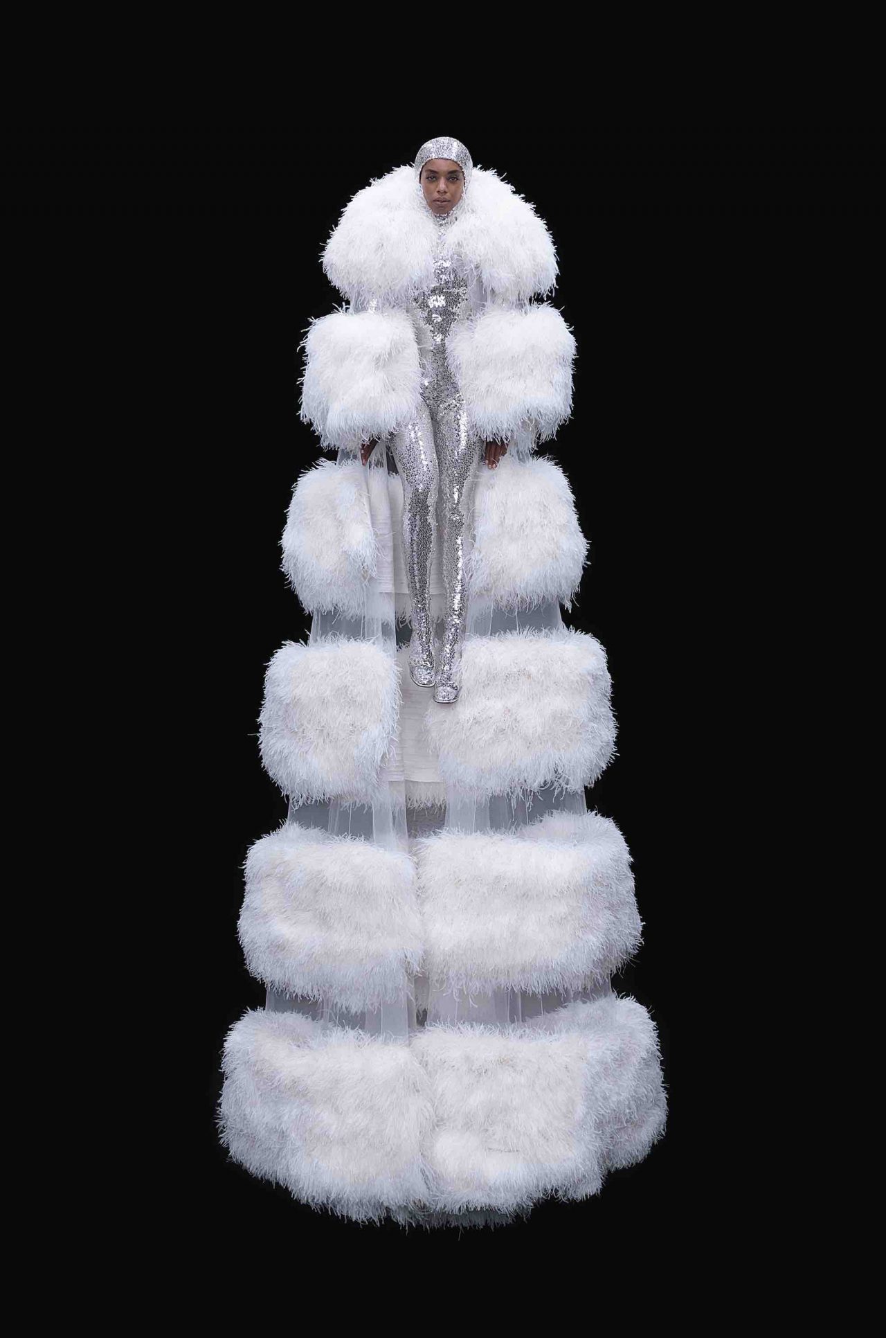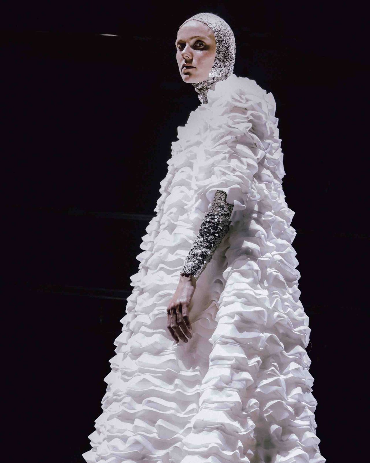 真っ黒な空間の中、光に照らしだされたシルエットの影から始まったライブパフォーマンス。贅沢にフェザーをあしらったドレスかと思いきや、モデルが宙にどんどん浮かび上がると、なんとモデルの背丈の2倍ほどのガウンであることが判明。Nick Knight の映像と相まり、現実に行われていることとは思えない幻想的なショーが幕を開ける。