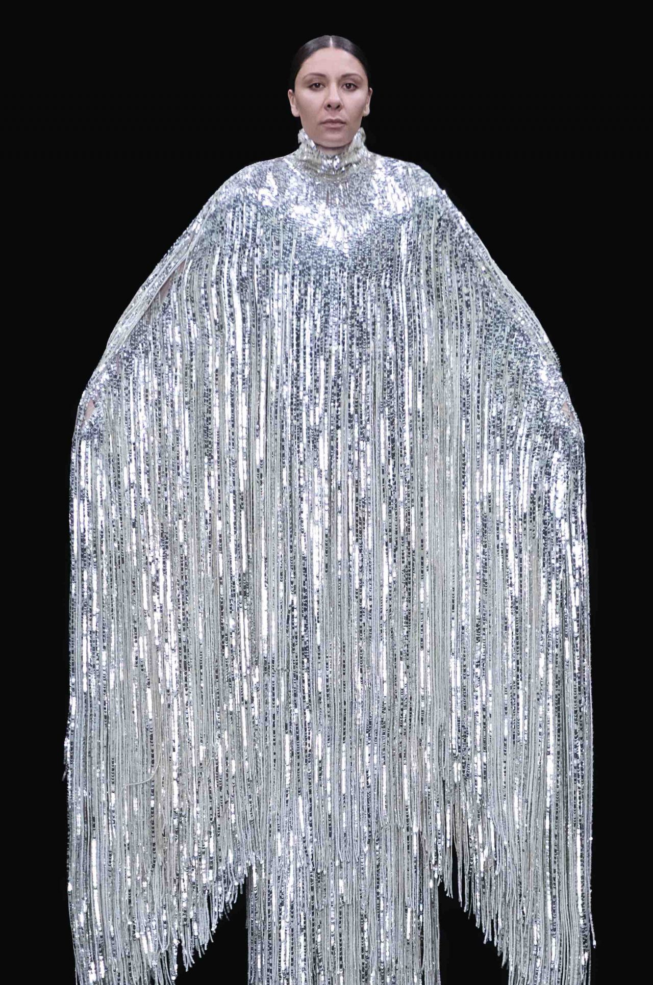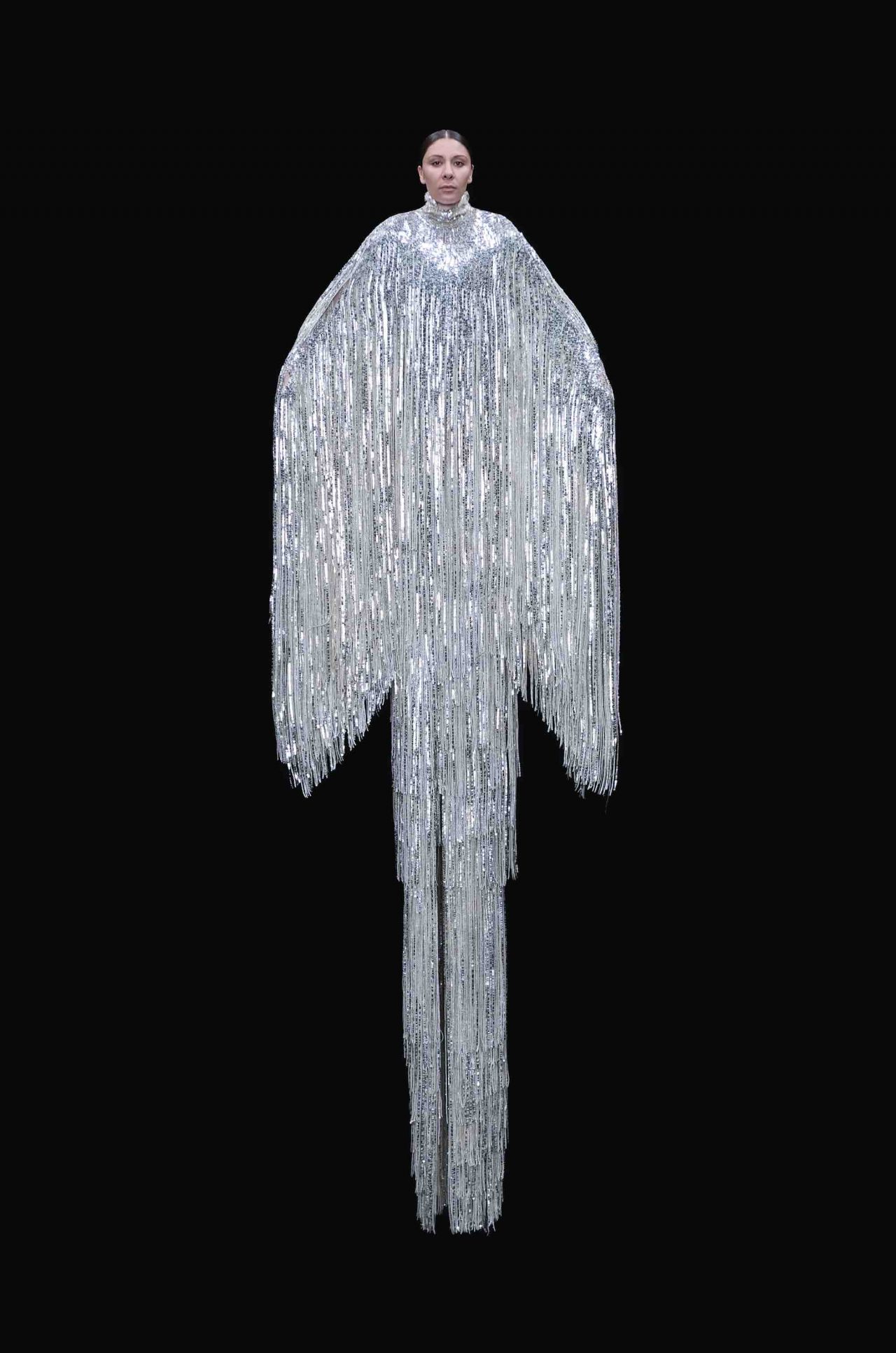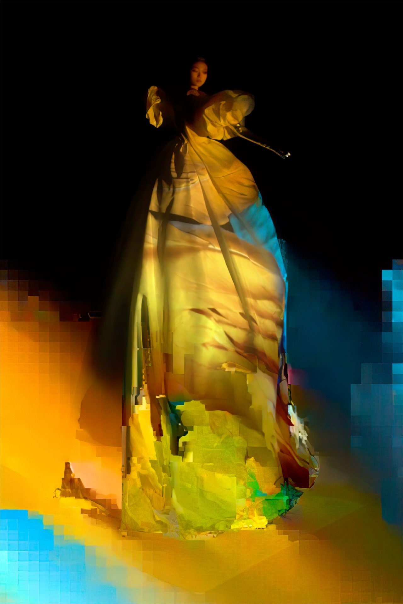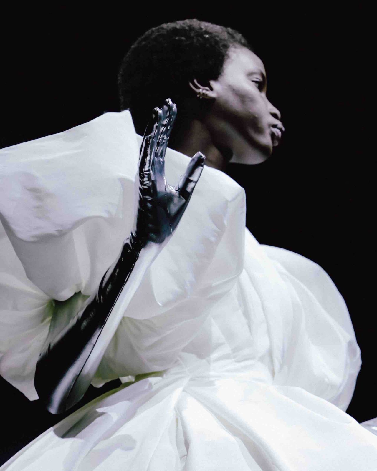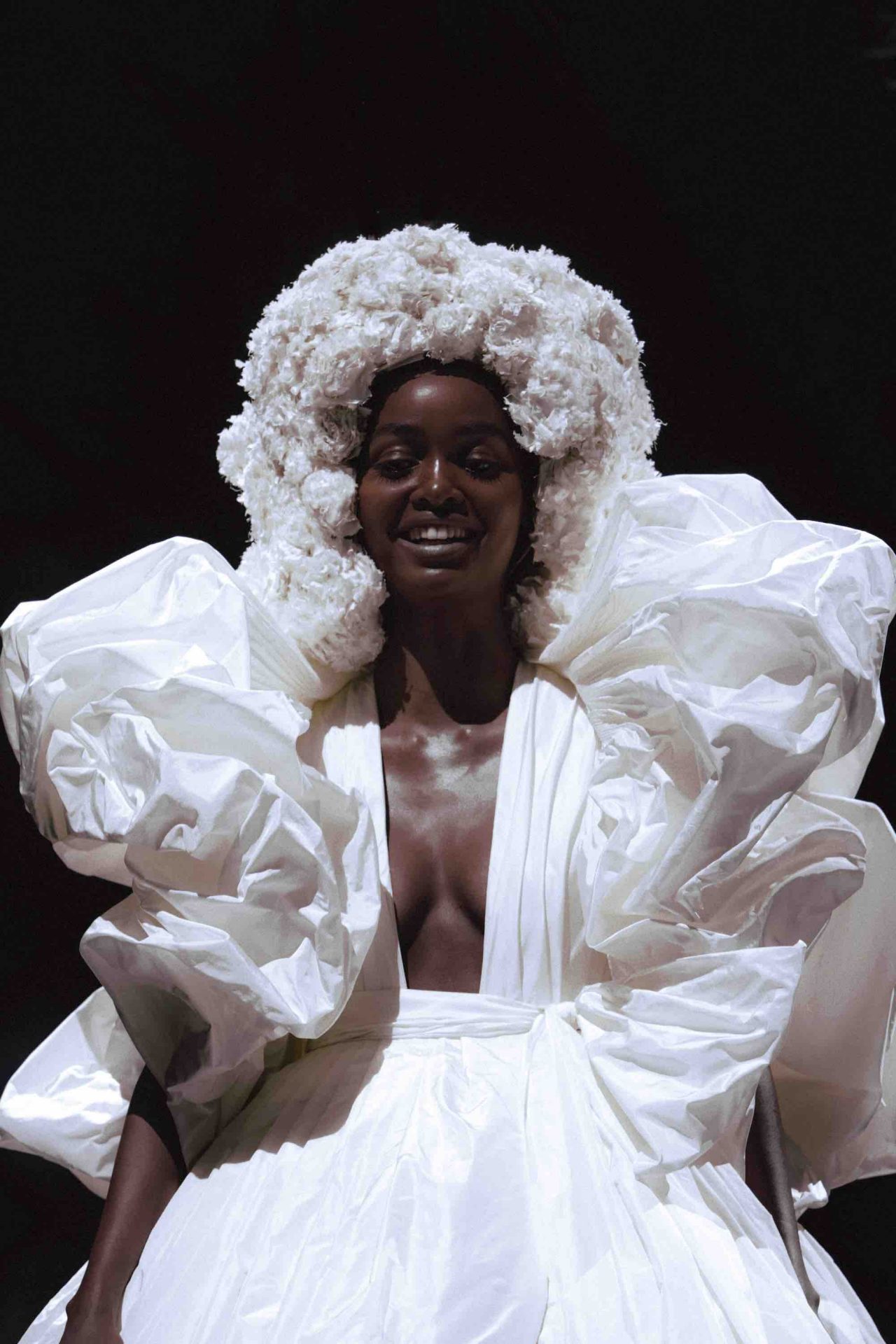 真っ黒な空間の中、光に照らしだされたシルエットの影から始まったライブパフォーマンス。贅沢にフェザーをあしらったドレスかと思いきや、モデルが宙にどんどん浮かび上がると、なんとモデルの背丈の2倍ほどのガウンであることが判明。Nick Knight の映像と相まり、現実に行われていることとは思えない幻想的なショーが幕を開ける。