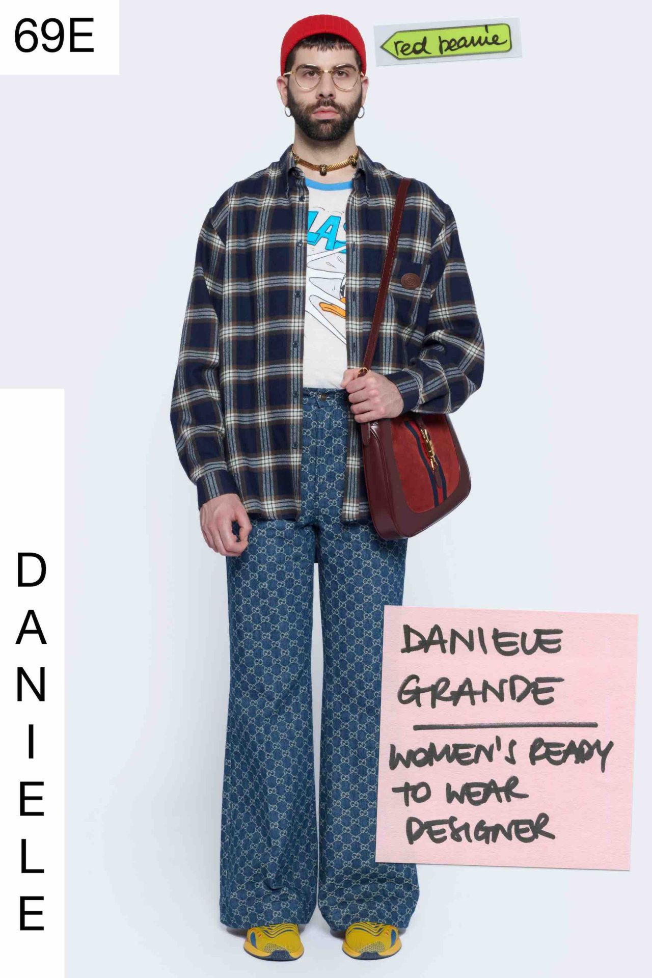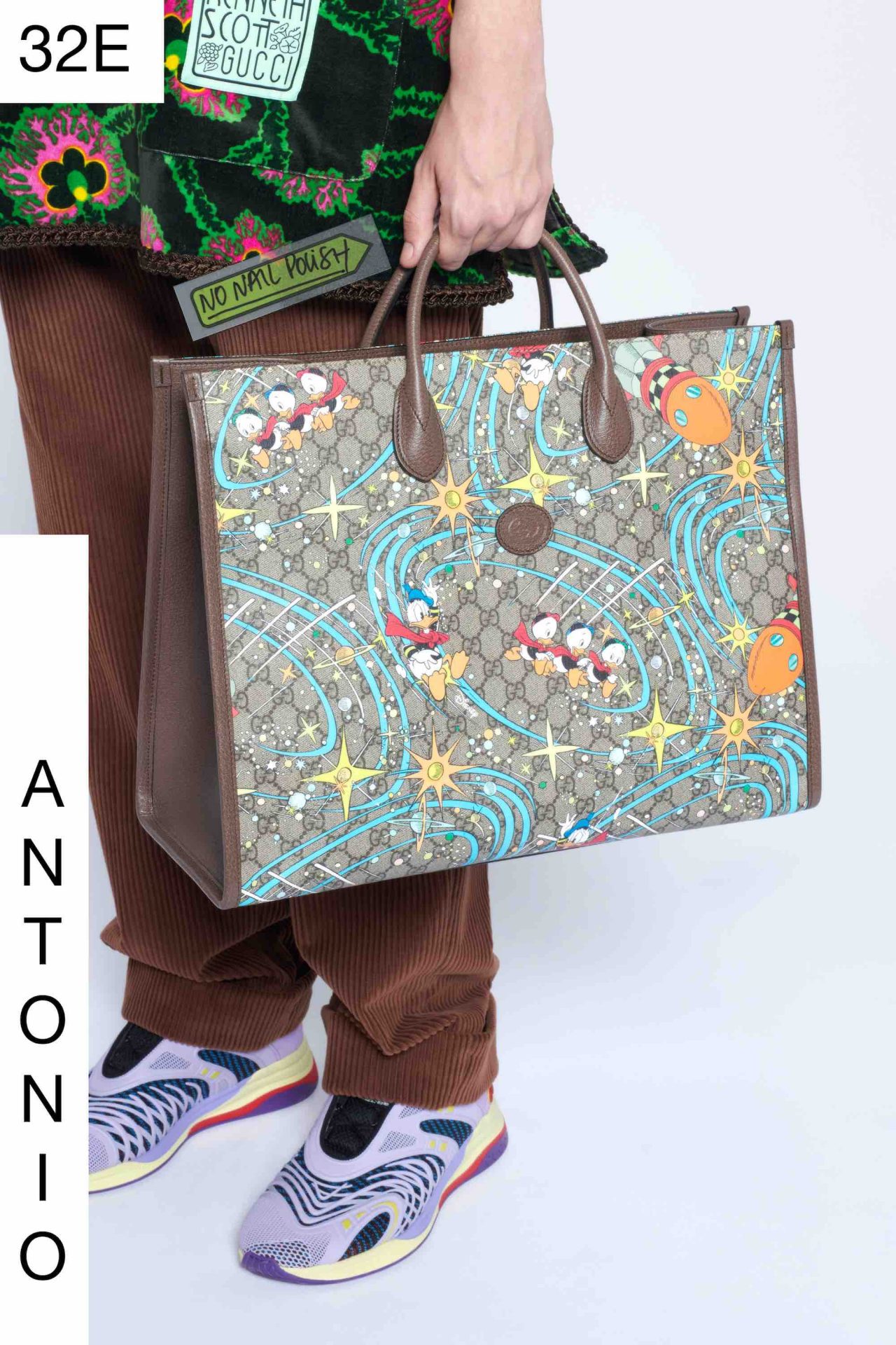 また、本コレクションで注目を集めたのが、ドラえもんをプリントしたGGパターンのトートバッグ。加えて、ドナルドダックがトートバッグの他、ジャケットのバックスタイルにもプリントされている。男性にもリップメイクを施すなど、ディテールを見れば見るほど、Alessandro Michele の遊び心を発見することができる。