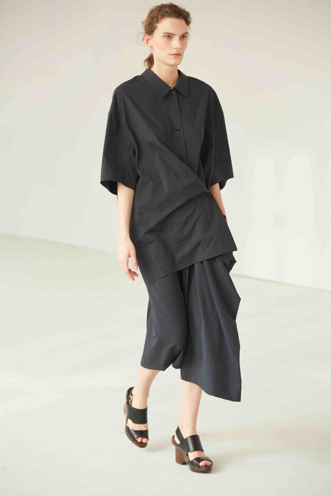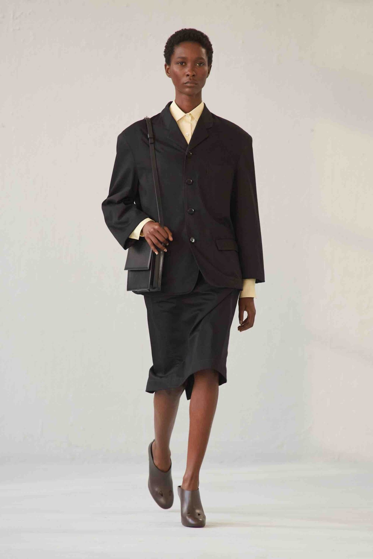 ファーストルックはダブルポケットのコットンシャツに直線的なボックススカート。一見しただけではわからないが、このスカート実はコットンデニム製。デニムならではのシルエットとハリ感が活かされている。ベーシックだからこそマテリアルやディテールにごまかしが効かないスタイルを LEMAIRE はさりげなくやってのける。コレクションは美しいグラデーションを描いて、パターンや差し色でコントラストを演出。デニムにコットン、サテンといった厳選された良質なマテリアルをデイリーに着られるルックに落とし込んでいく、安定の LEMAIRE 節は今回も健在だ。