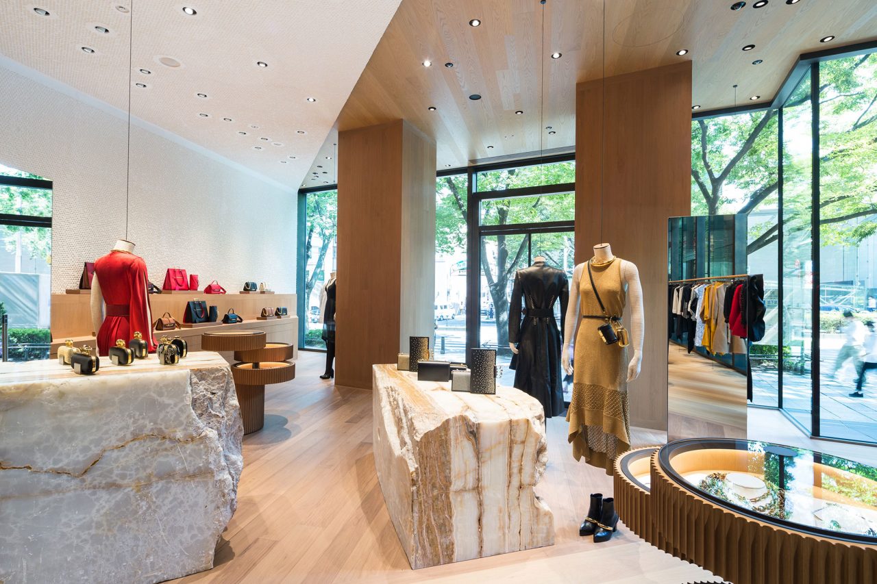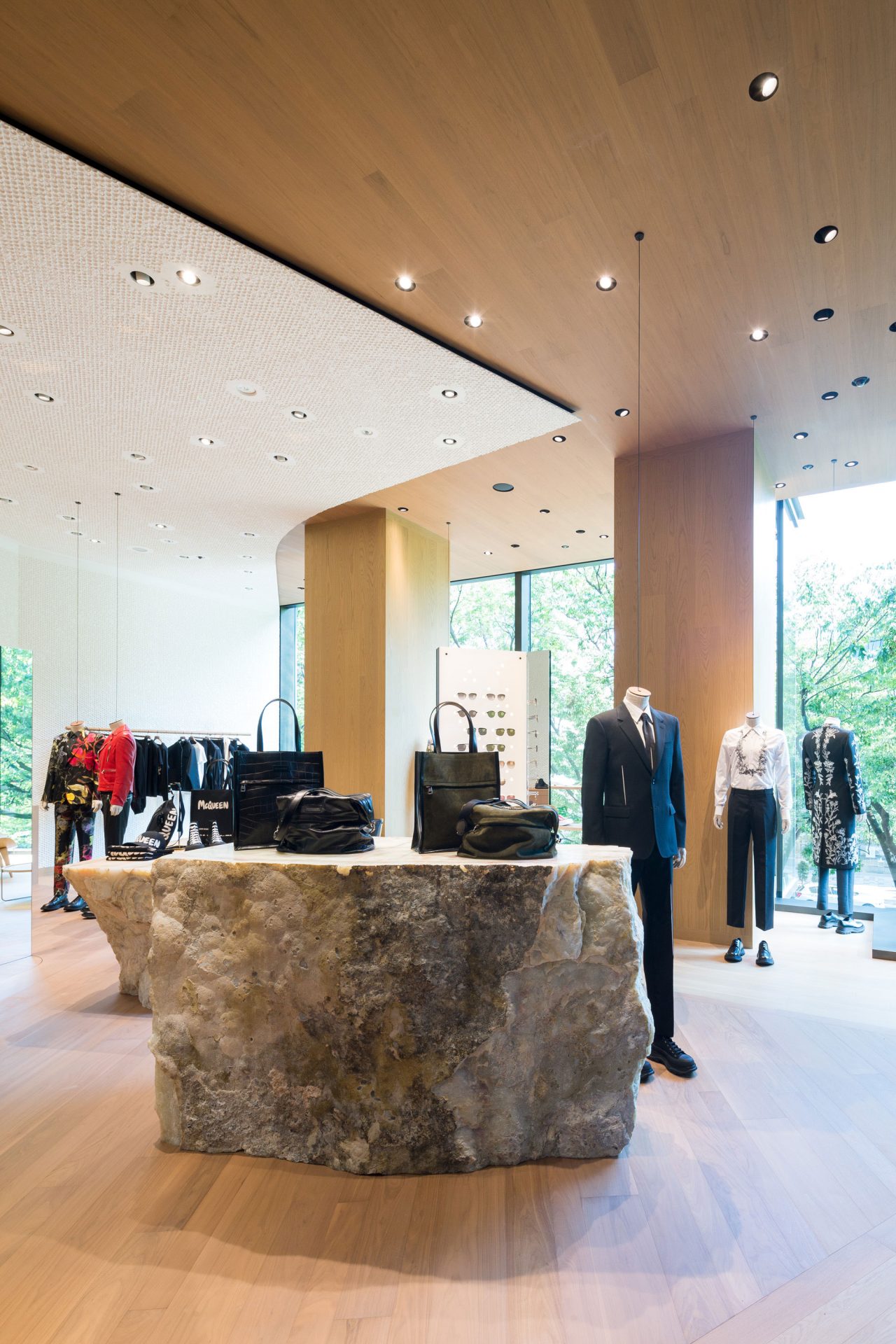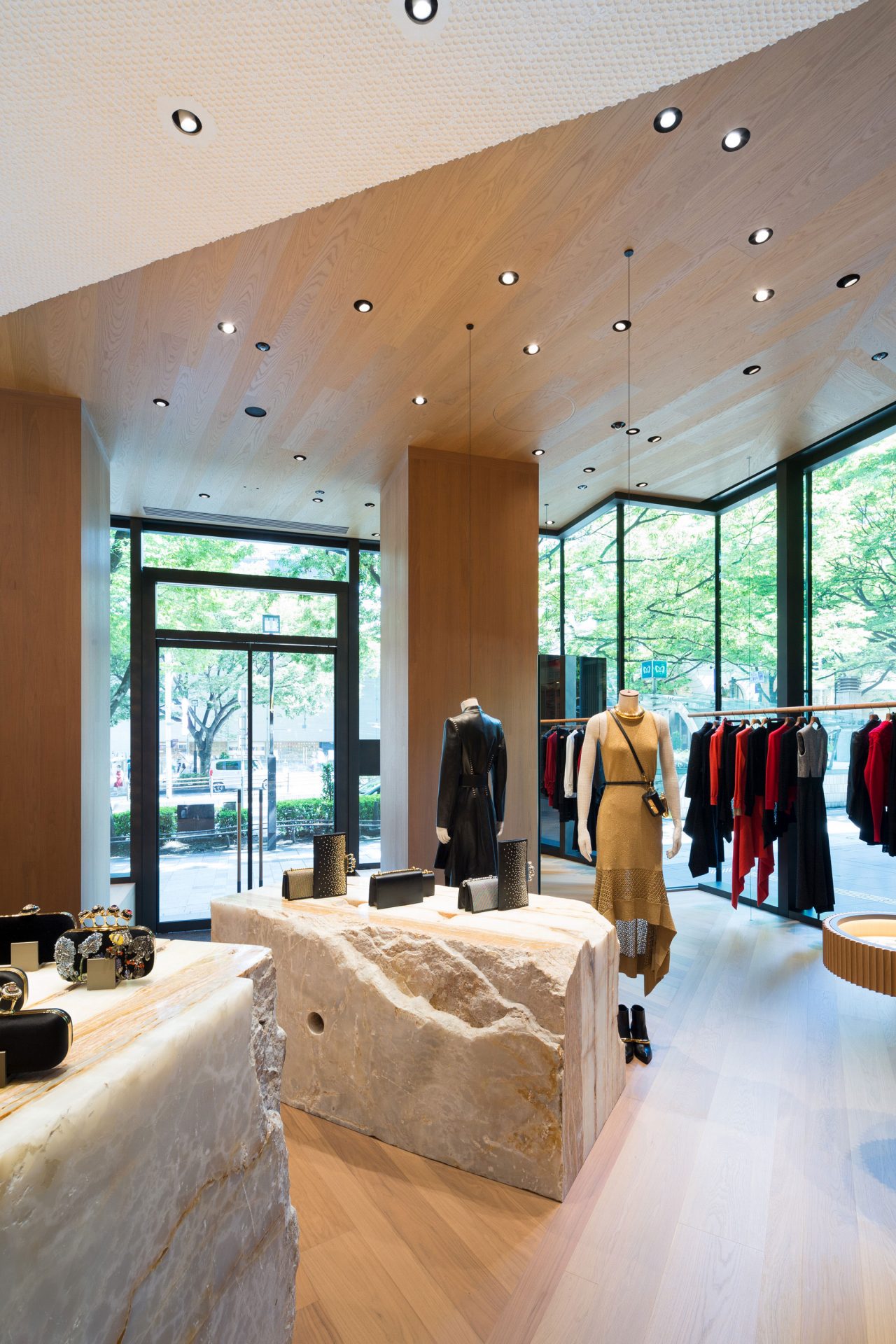表参道の一等地にオープンした Alexander McQueen の新しい旗艦店は、ウィメンズとメンズのウェアやアクセサリーを展開。Alexaner McQueen のルックをまとったマネキンたちが出迎え、ランウェイコレクションのストーリーを伝える他、店内にはオークやウォールナットといった様々なトーンの木材がメインに使用され、Alexander McQueen が大切にする自然への敬意が表現されている。彫刻のような天然石と磨かれたオニキスが設置され、ディスプレイされたバッグやアクセサリー類と見事に調和。また、この空間のために開発されたというコットンをベースにした新しいクラッディング「cotton-crete」が内装にさらなる温もりを添えている。