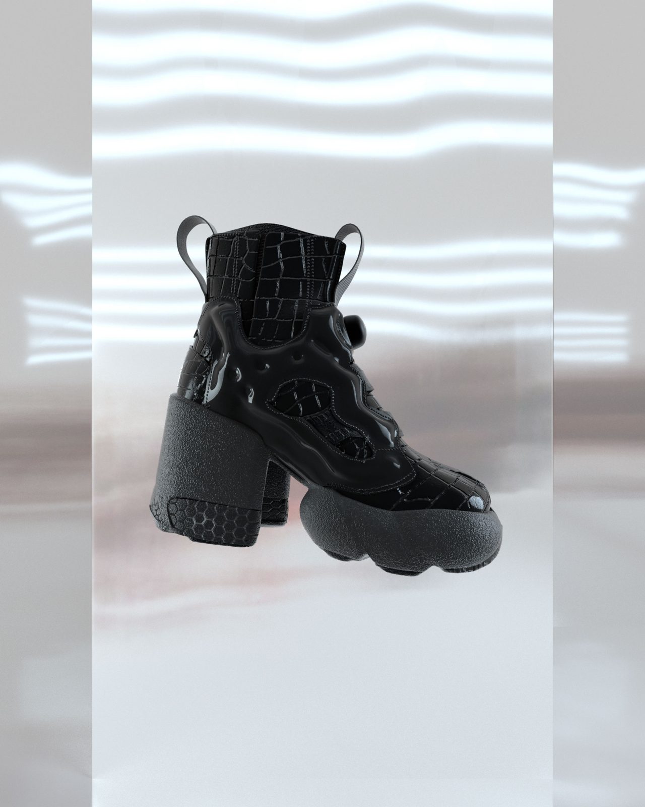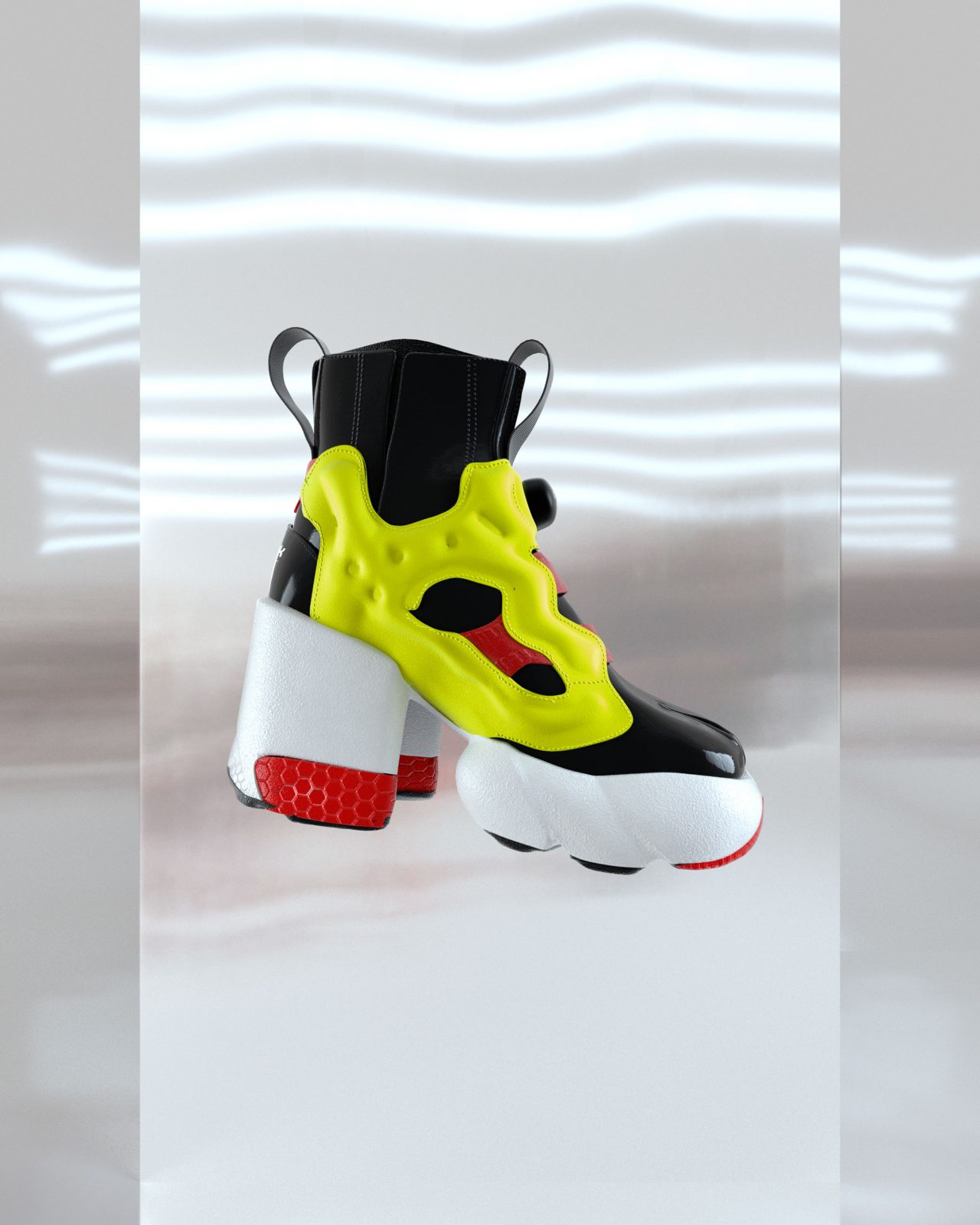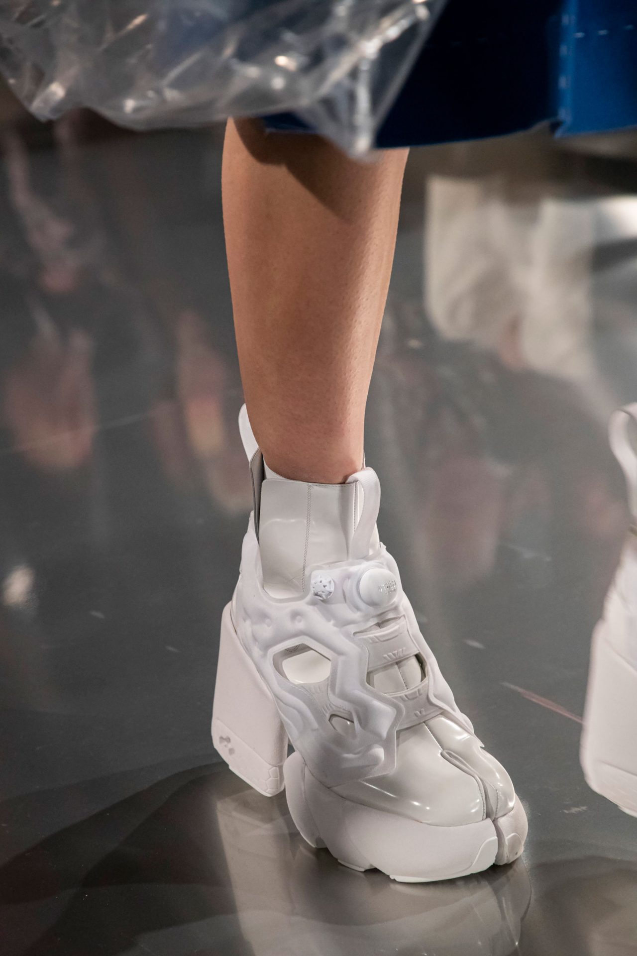 話題の Maison Margiela と Reebok のコラボレーションシューズは、2020年春夏「アーティザナル」Co-ed ショーで初披露され、2020年秋冬「デフィレ」Co-ed ショーでは様々なカラーコンビネーションがお目見えした。Maison Margiela のアイコンシューズである「Tabi (タビ)」と Reebok の定番モデル「Instapump Fury (インスタポンプ フューリー)」を融合したこのシューズは、フラットとヒールの2型で展開される。