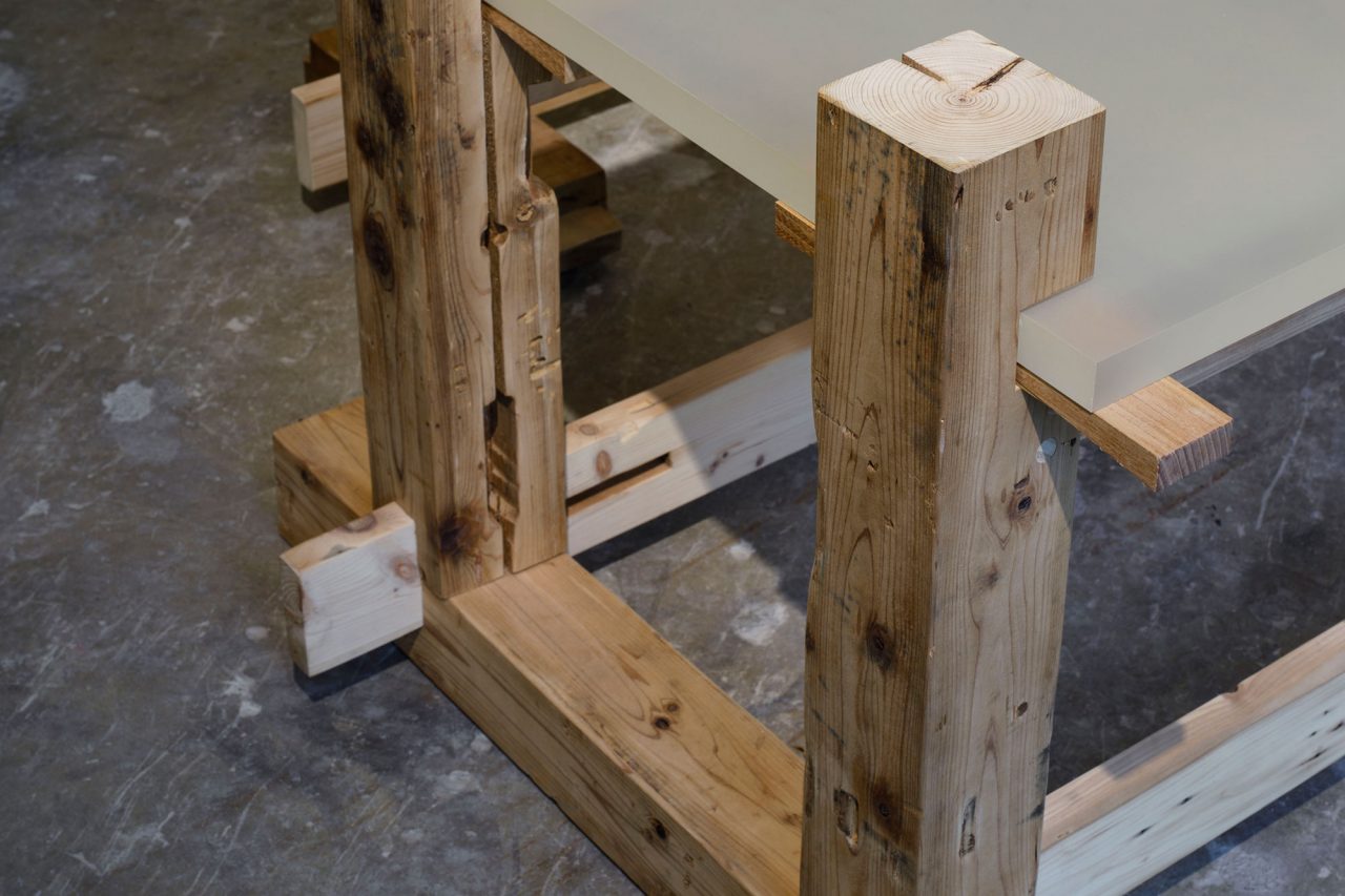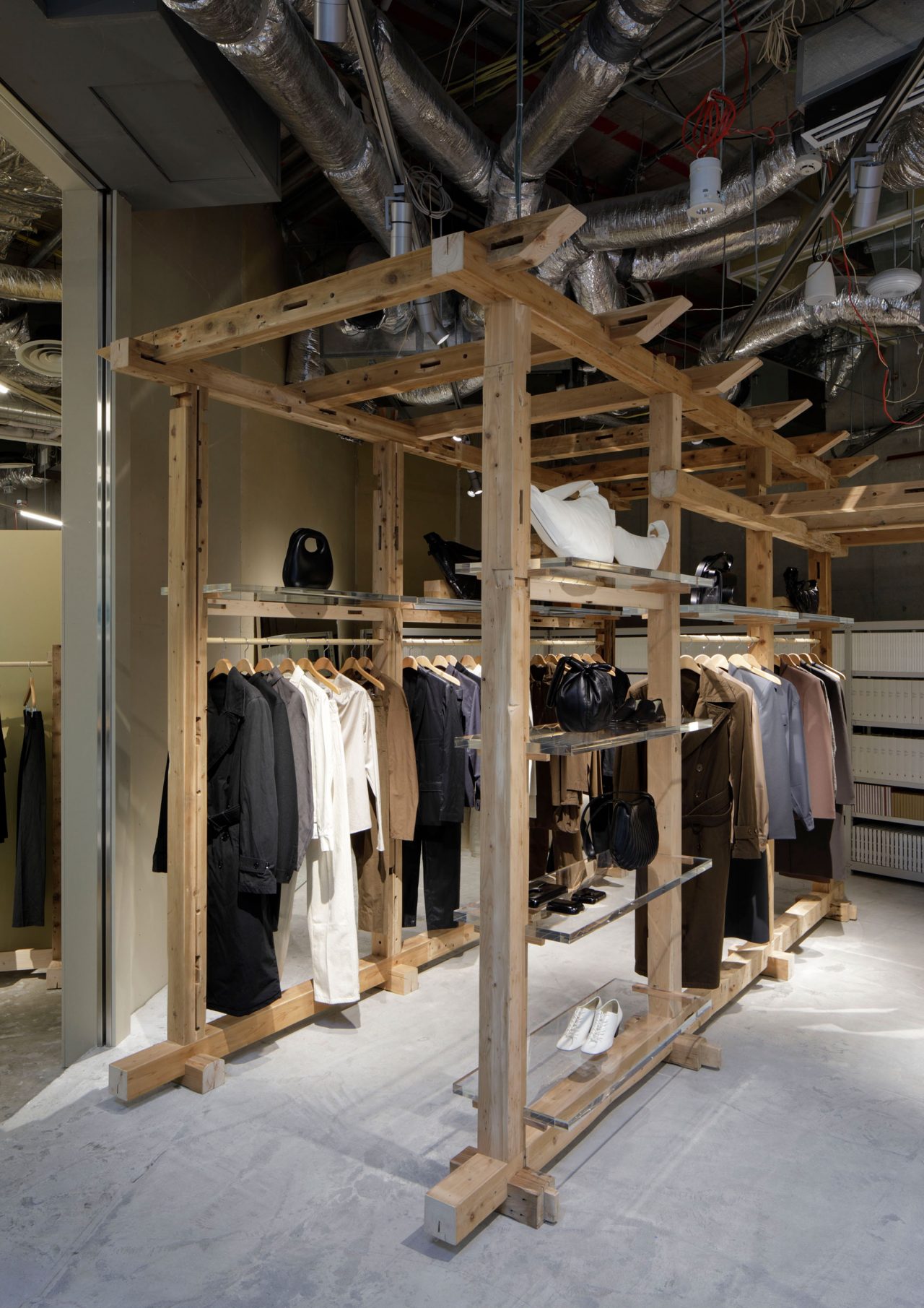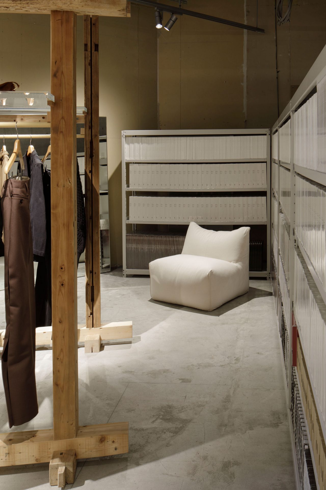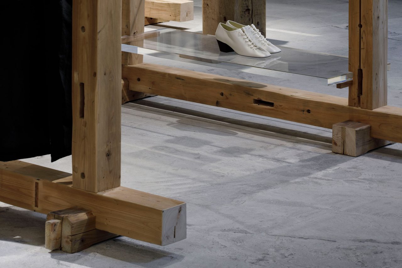 SKWAT の空間デザインは、単管パイプや中古の家具などを用いながら、最小限の操作によって、空き物件の空間のキャラクターを最大限に生かすことに重点を置いており、Lamaire の期間限定ストアも同様のアプローチを採用。内装と什器には、築100年の日本の古民家の廃材を再利用。日本が誇る恵まれた森林資源と優れた大工仕事によって成され、数世紀に渡って寺や神社などの宗教建築に用いられてきた接着剤や釘を使わない木工の伝統技法である木組みを取り入れ、Lemaire の日本への敬意と関心を体現した空間に仕上げられている。