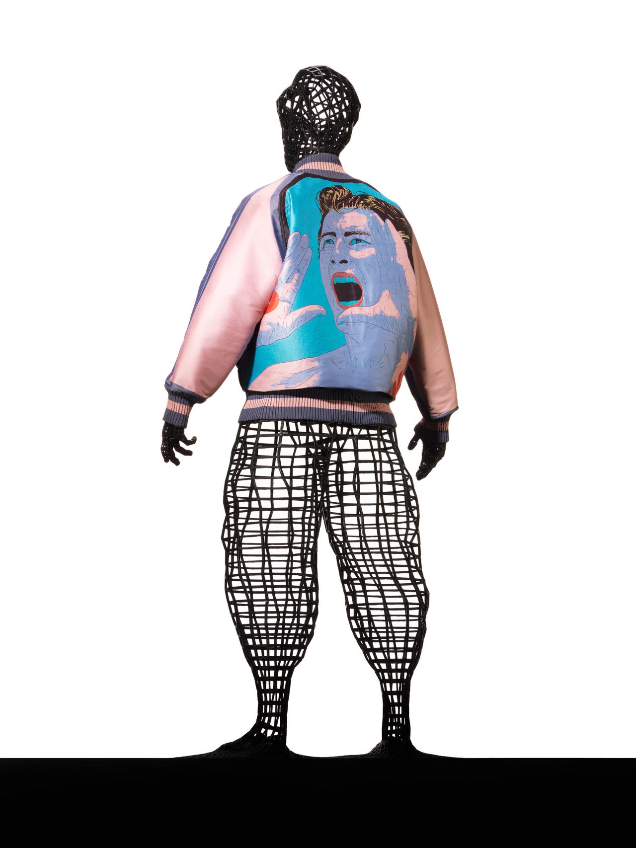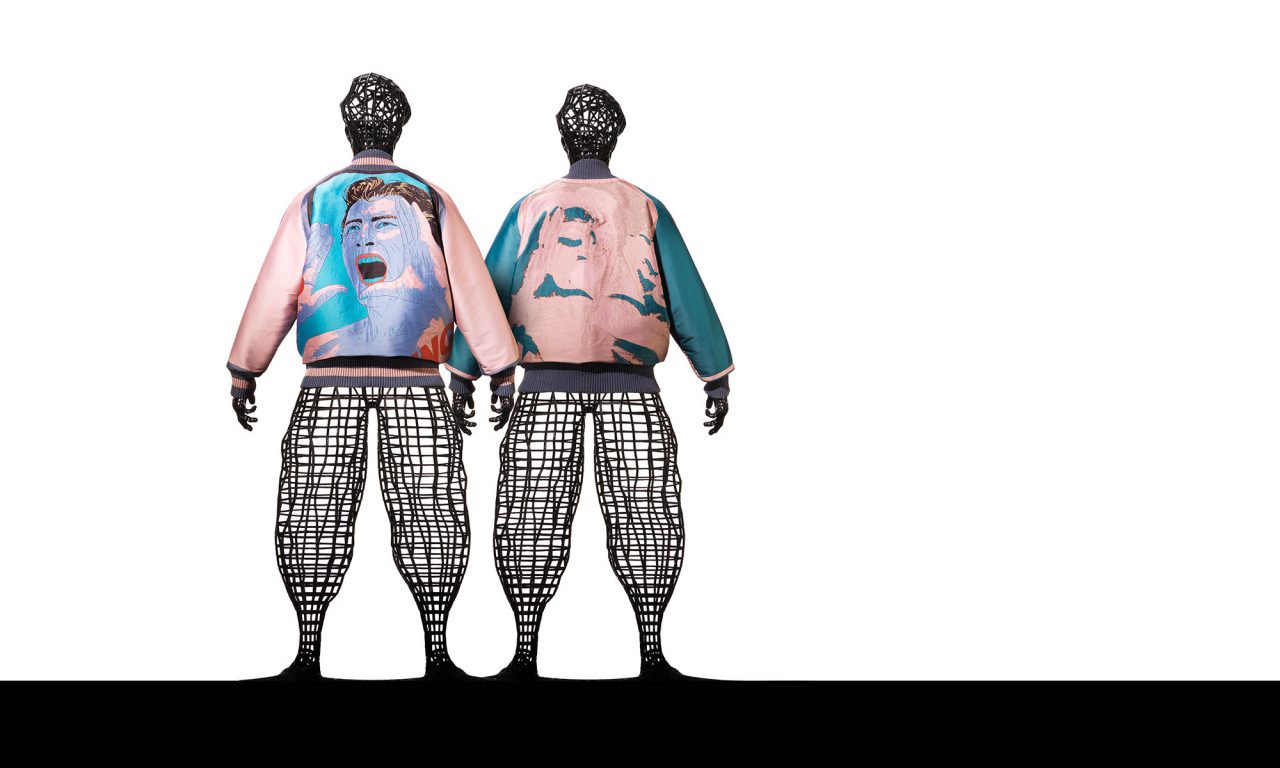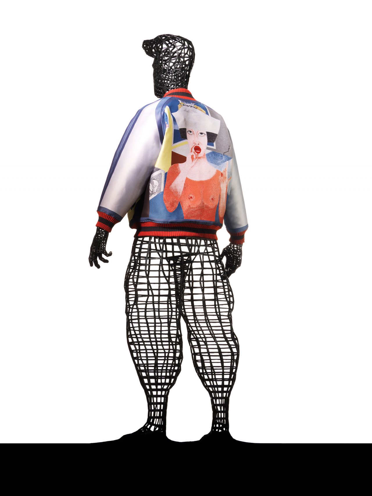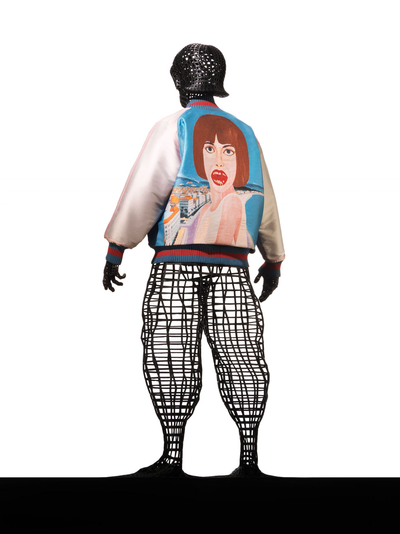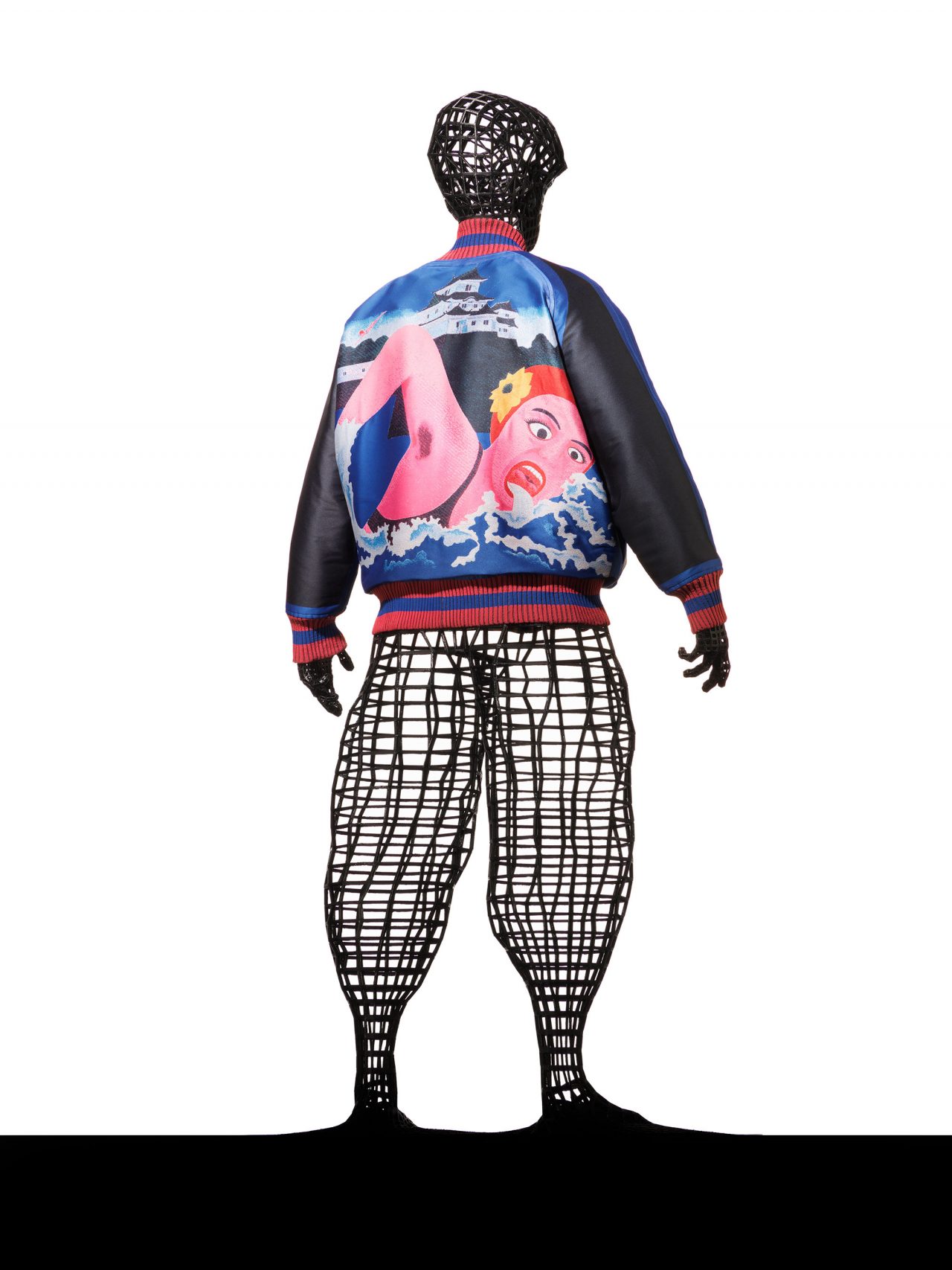 注目したいのは、ブルゾンの裏側。生地を織るとき、表面で使われない色の糸が裏側に表出することから、左右反転した横尾の作品が思いがけない色彩で出現しているのだ。