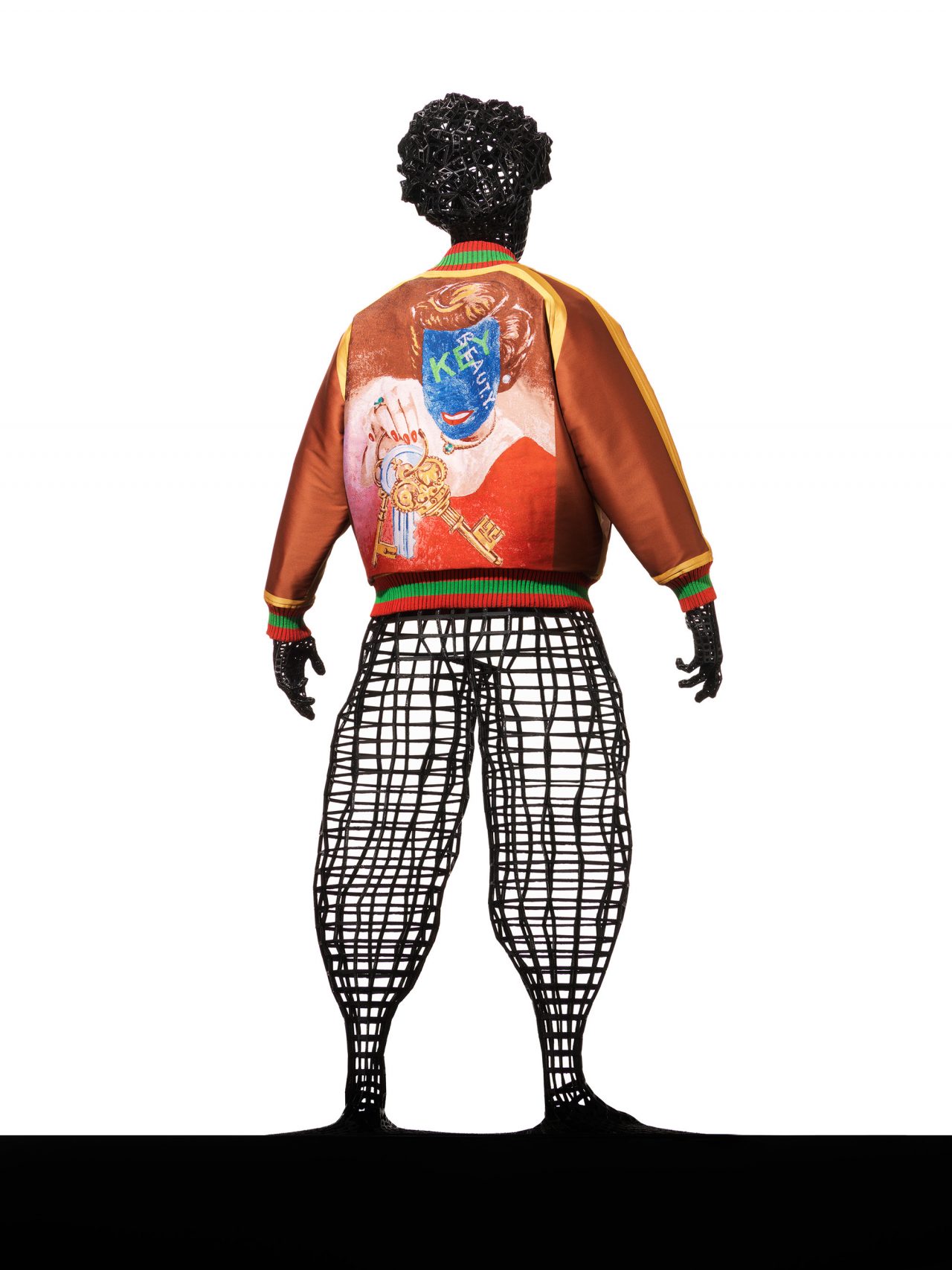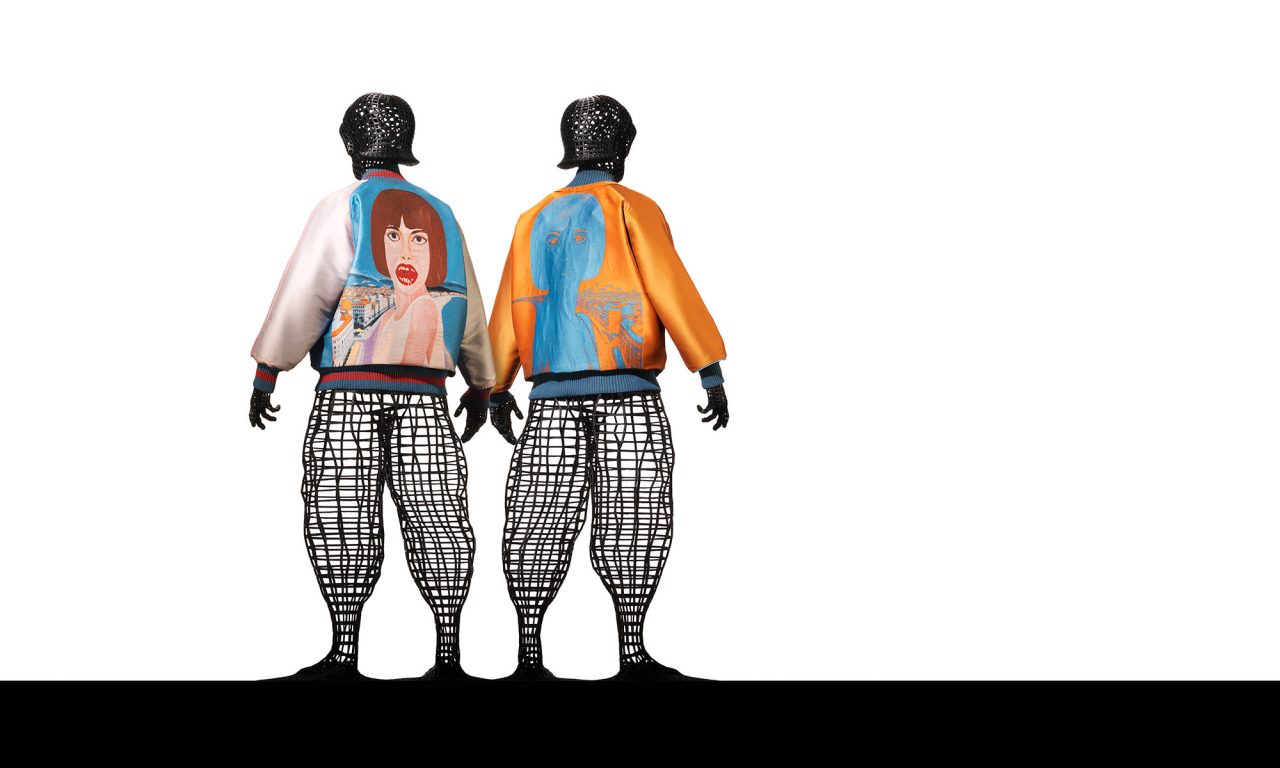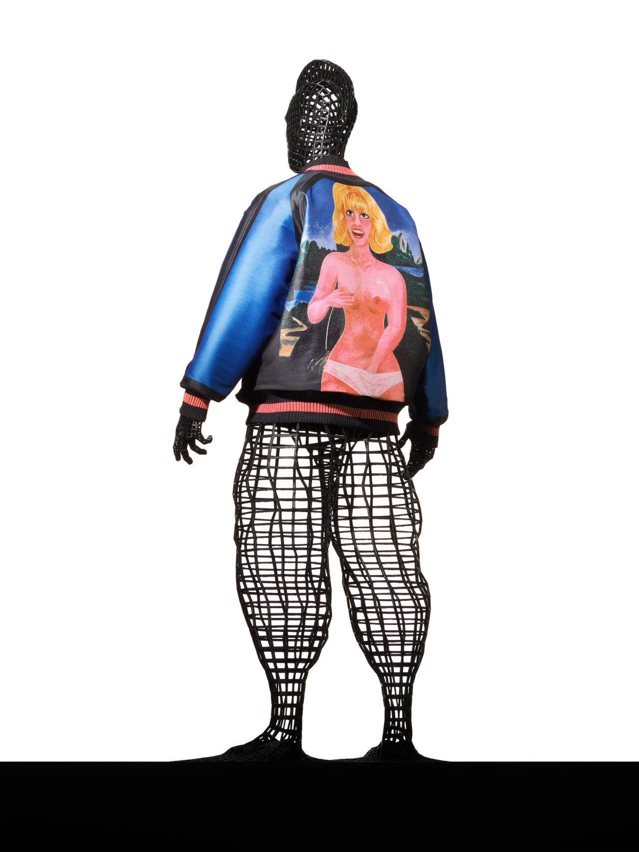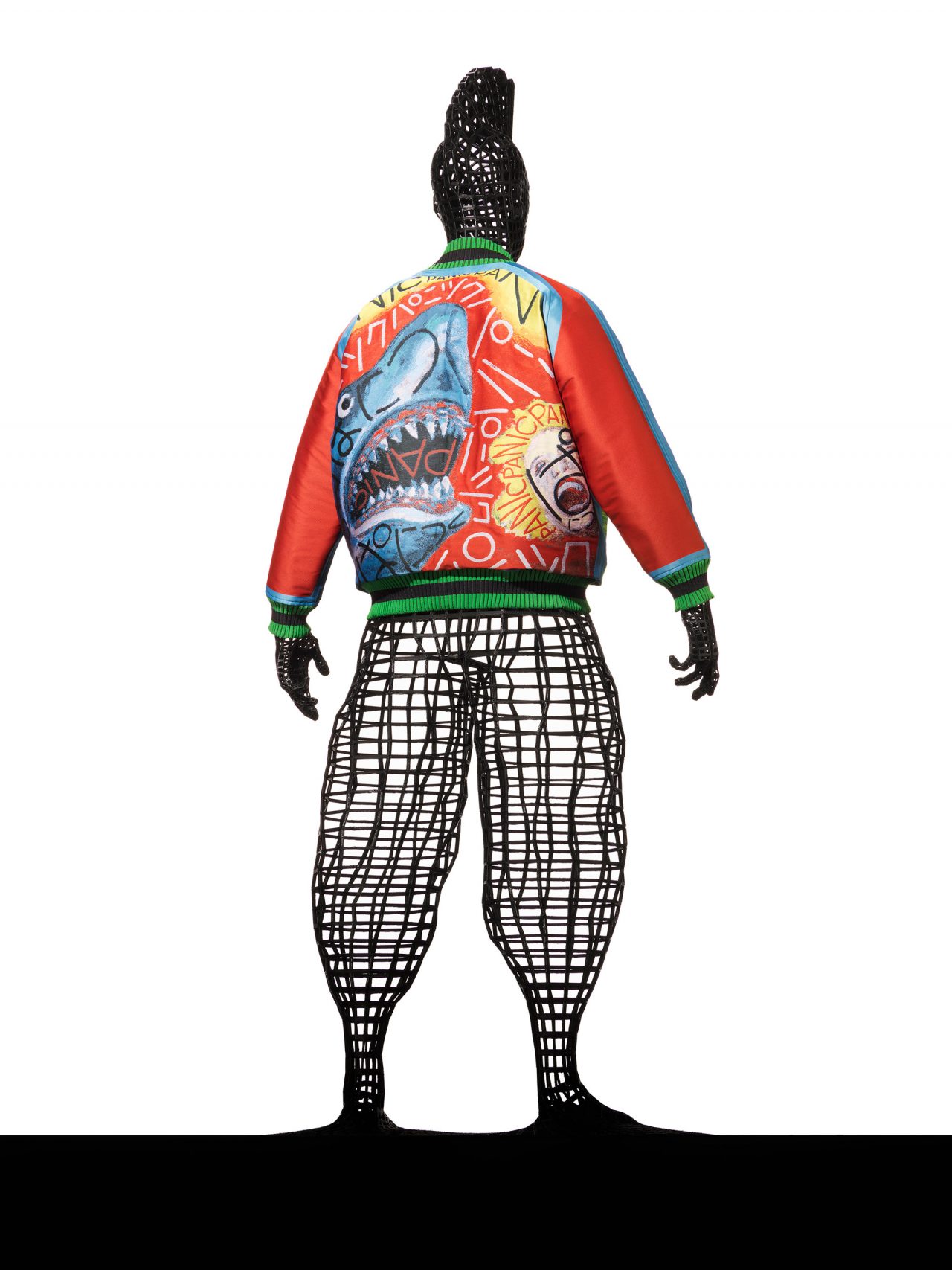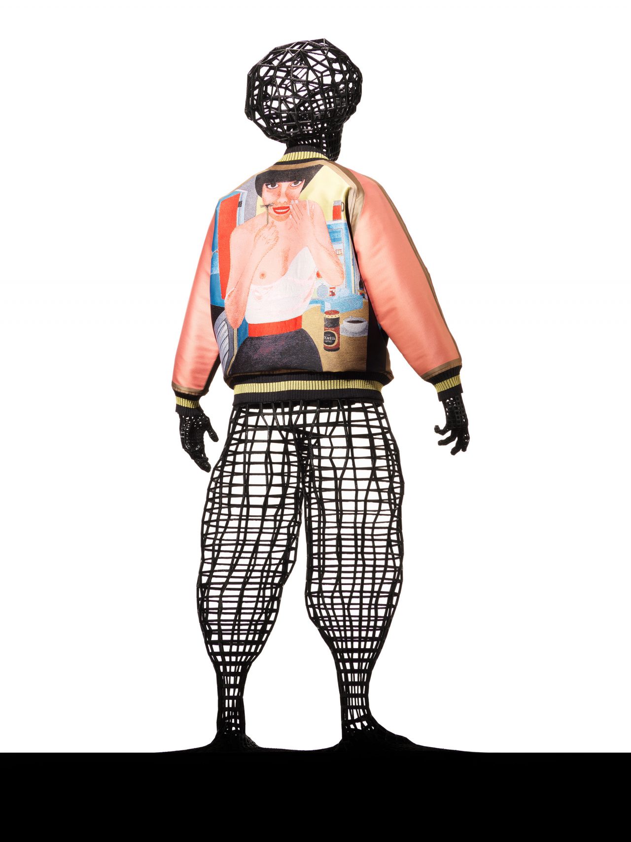 注目したいのは、ブルゾンの裏側。生地を織るとき、表面で使われない色の糸が裏側に表出することから、左右反転した横尾の作品が思いがけない色彩で出現しているのだ。