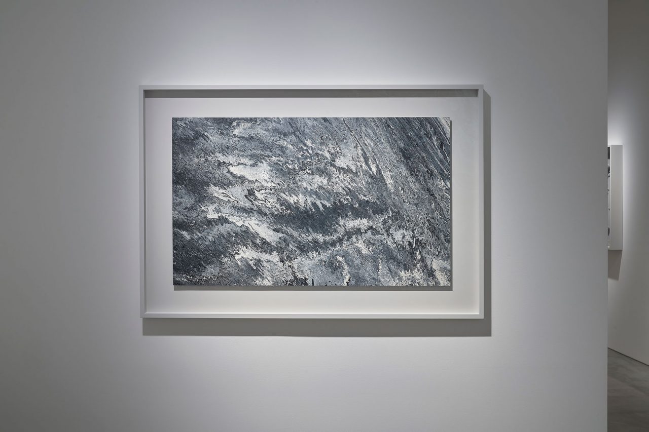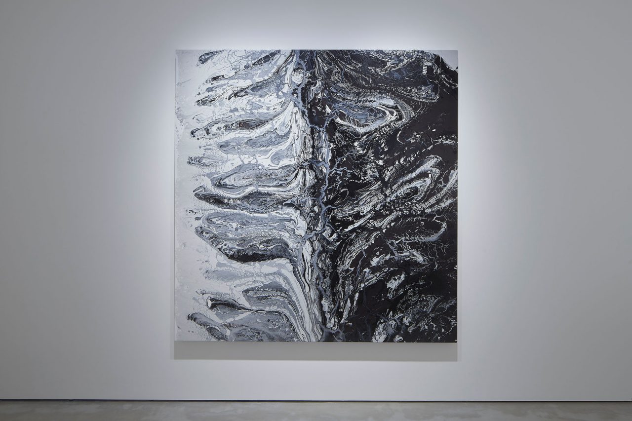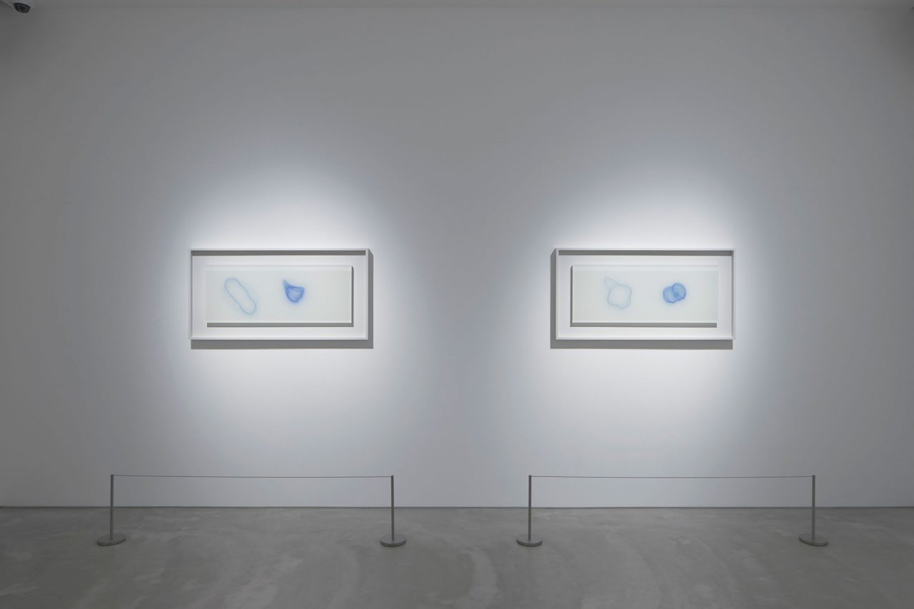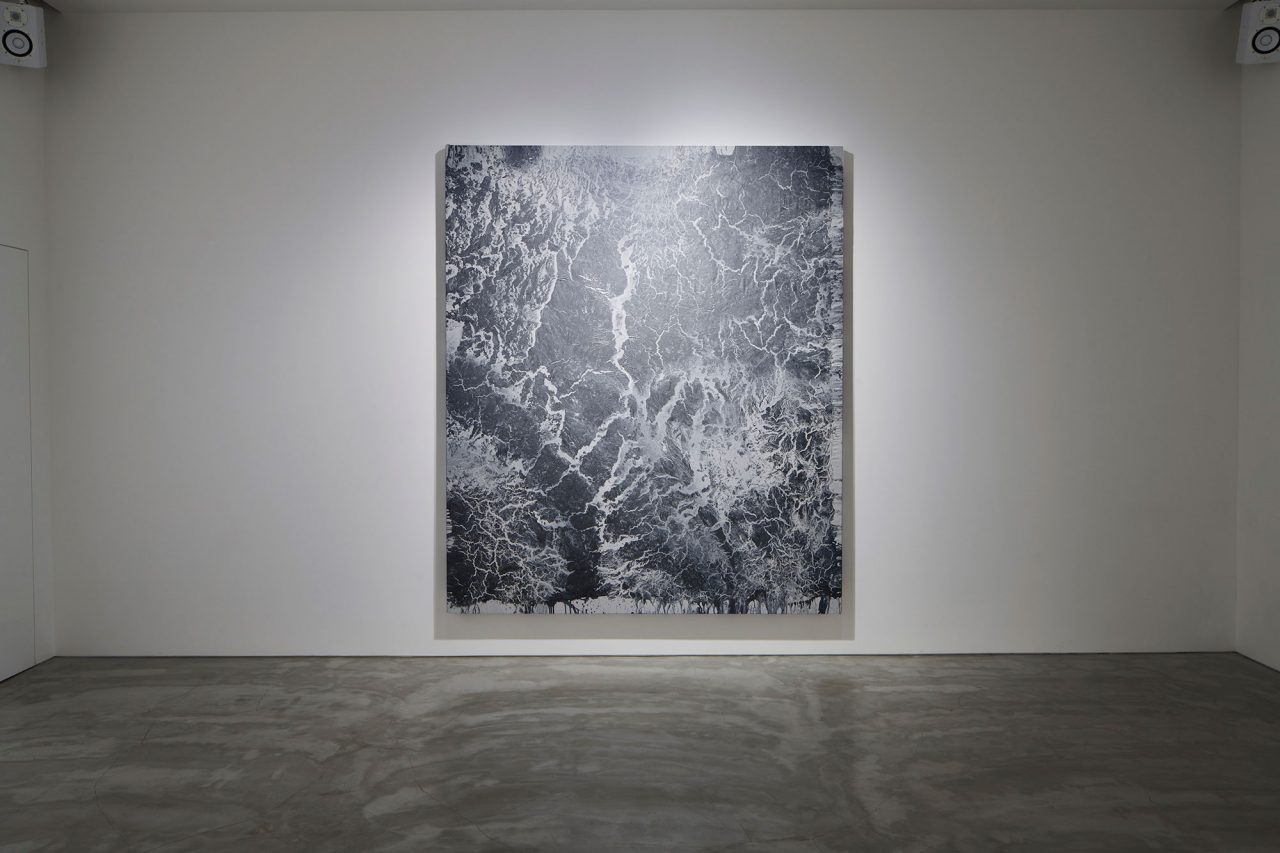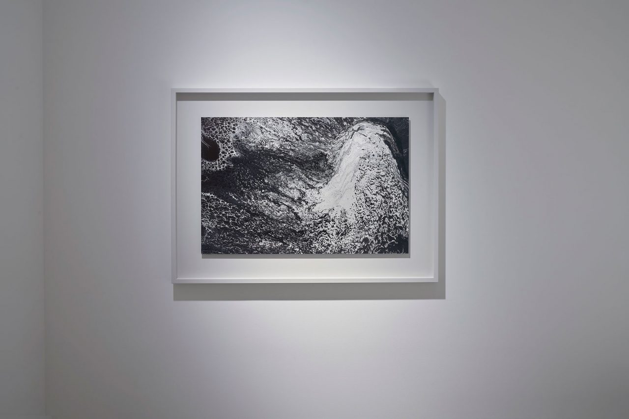 そこで生み出されたのは、廃液となったメディウムと粒子の違う絵の具と水などを混合し、流し広げることで、変容するランドスケープを表現した「Dune」や油絵の具と油を組み合わせることで、数ヶ月間かけて状態変化が続き、本個展開催中も変化していく「Black Field」といった実験作品。また、粘度調整した絵の具が入ったタンクに一定の圧力をかけ、ノズルから出る絵の具によって描かれた「Moment」や特殊顔料が塗布された半透過性の板の表面に、UVレーザーを照射して描いた植物の種子や胚珠をテーマにした3Dモデルの断面が紫外線によって現れては消滅していく「Blue Seed」といった、制作過程を知るほど興味深くなる作品が並ぶ。