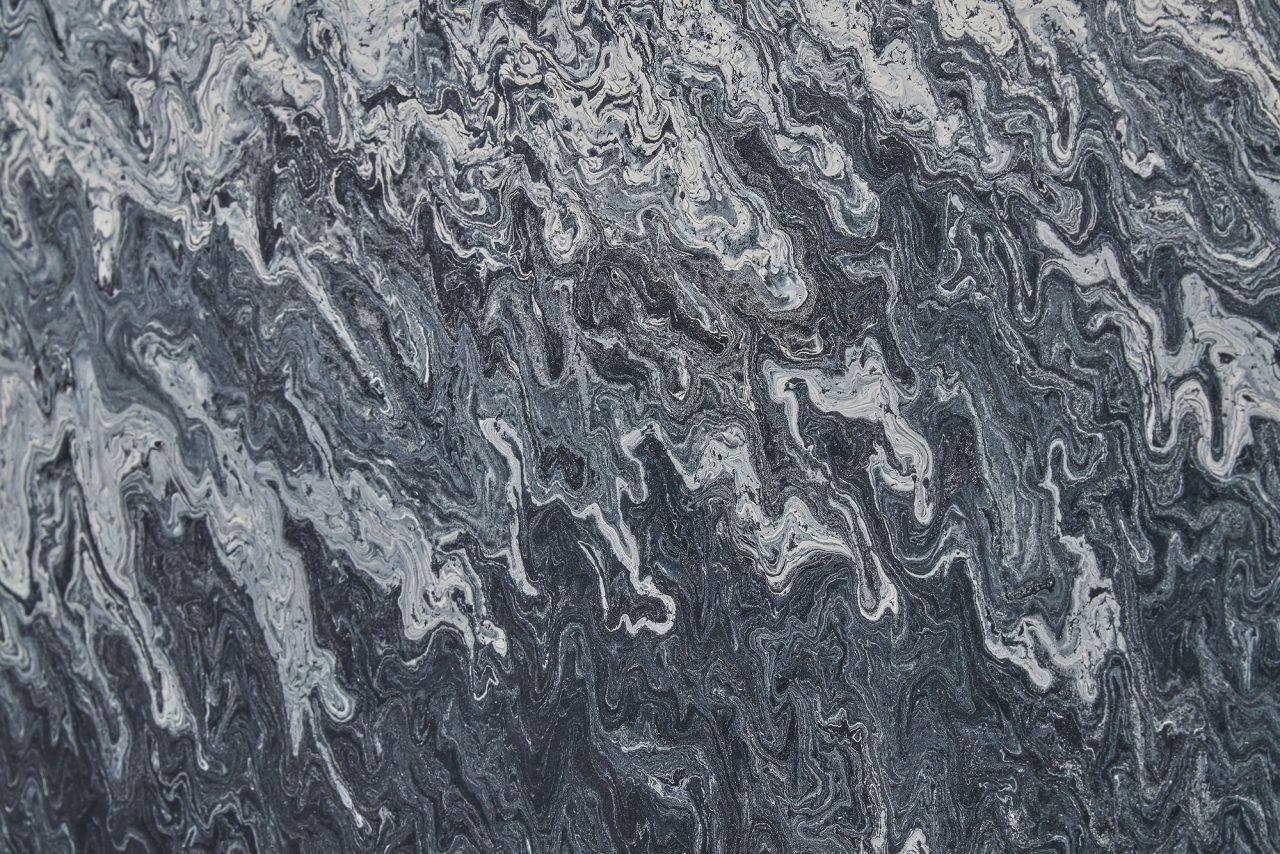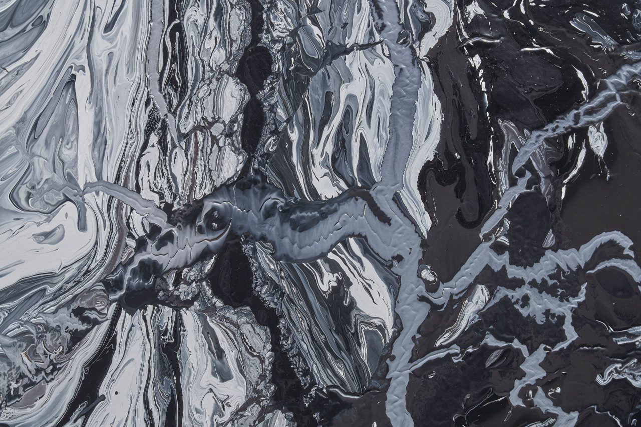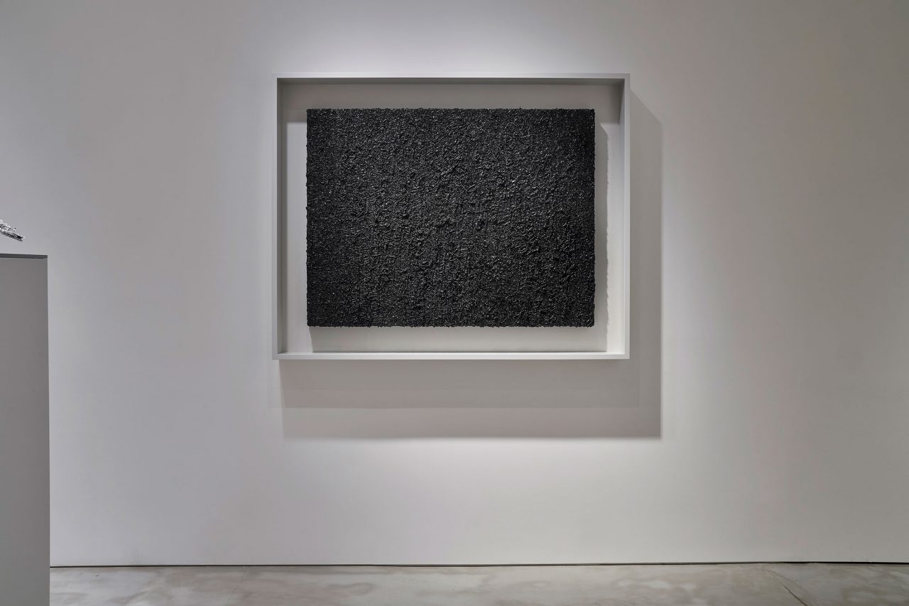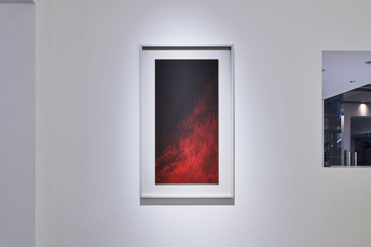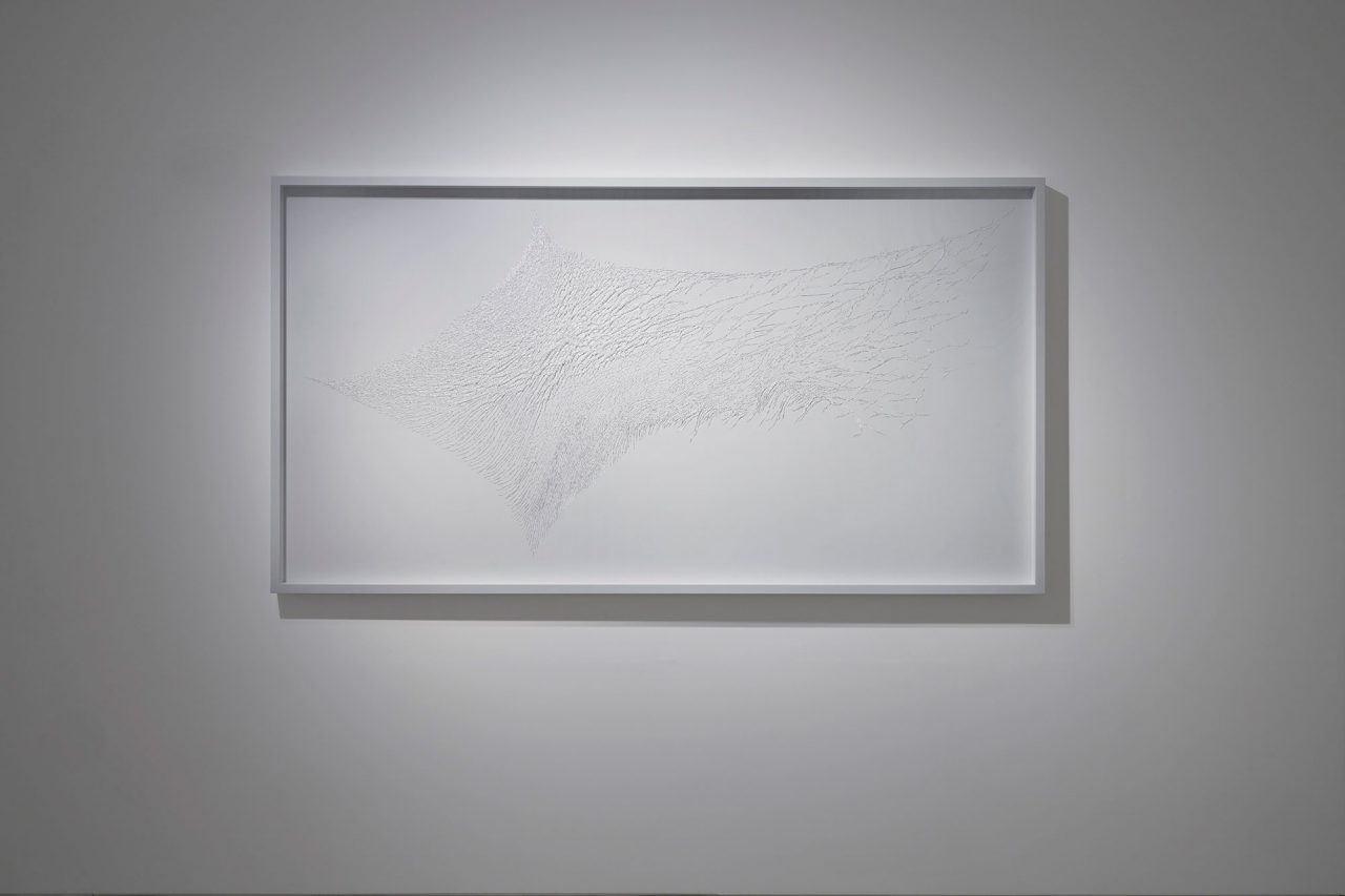 そこで生み出されたのは、廃液となったメディウムと粒子の違う絵の具と水などを混合し、流し広げることで、変容するランドスケープを表現した「Dune」や油絵の具と油を組み合わせることで、数ヶ月間かけて状態変化が続き、本個展開催中も変化していく「Black Field」といった実験作品。また、粘度調整した絵の具が入ったタンクに一定の圧力をかけ、ノズルから出る絵の具によって描かれた「Moment」や特殊顔料が塗布された半透過性の板の表面に、UVレーザーを照射して描いた植物の種子や胚珠をテーマにした3Dモデルの断面が紫外線によって現れては消滅していく「Blue Seed」といった、制作過程を知るほど興味深くなる作品が並ぶ。