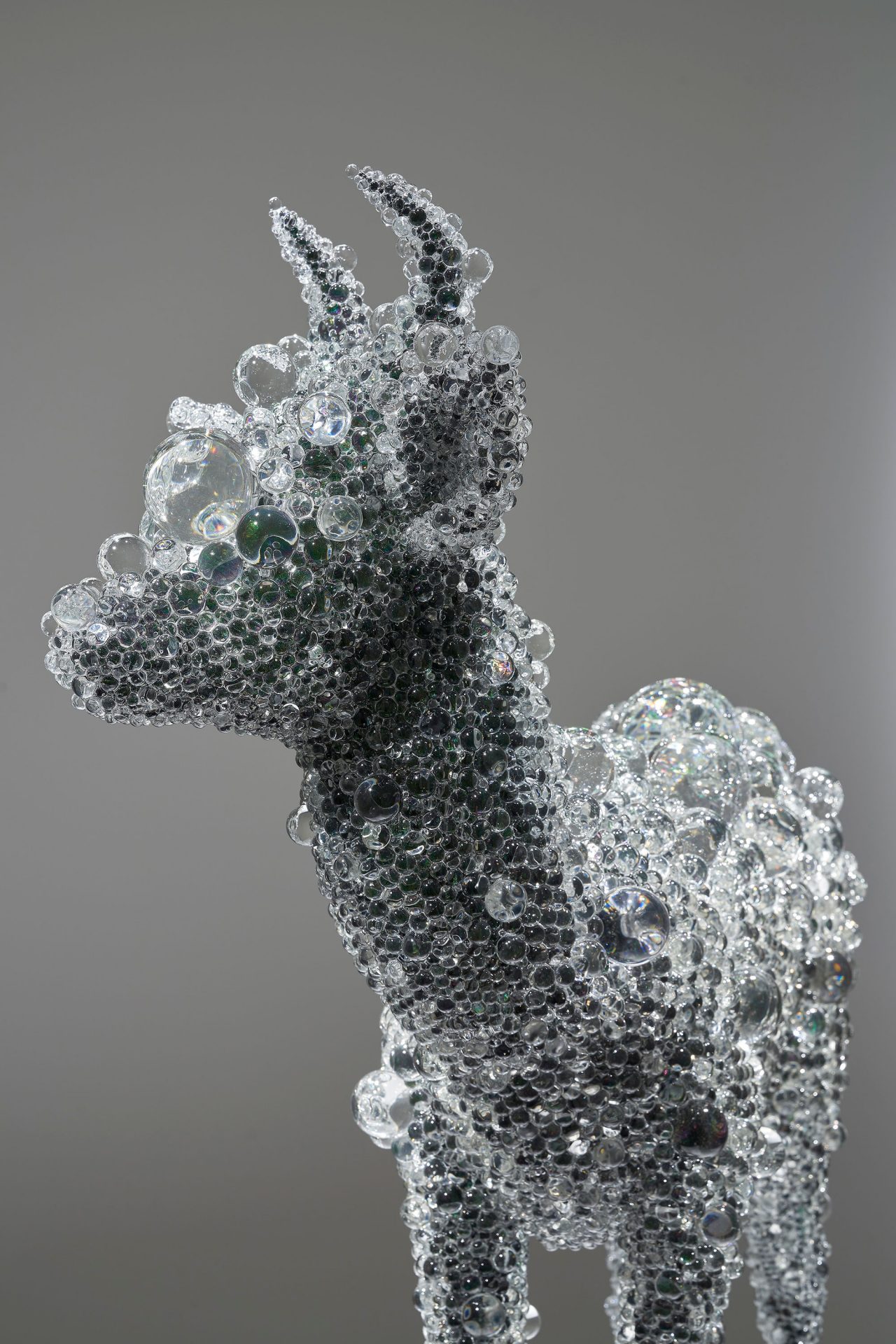 加えて、オブジェクトを透明の球体で多い、その存在を「映像の細胞」に置き換えるという名和の彫刻作品「PixCell」の新作や鎌倉時代の「春日神鹿舎利厨子」をモチーフに京都の伝統工芸復興プロジェクトとして伝統的技法を用いた木彫漆箔仕上げの「Trans-Sacred Deer」も展示されている。