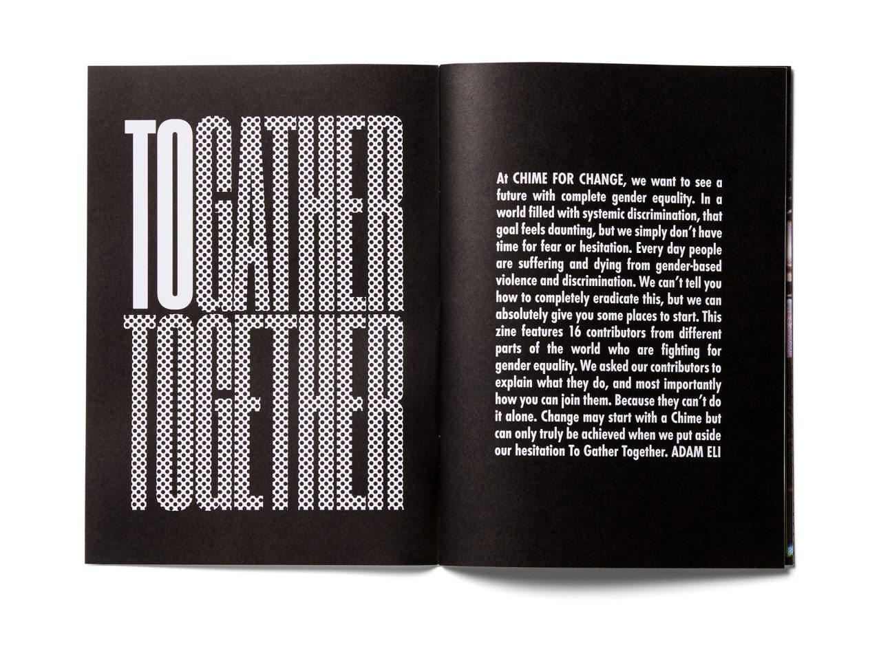 ”To Gather Together”というスローガンのもと2号目では深刻な国際問題のひとつである児童婚に焦点を当てた『CHIME』。最新号では、児童婚をはじめ、障害を持つ女性と少女たち、インターセクショナル・フェミニズム、トランスジェンダー同士の交流、難民、女性性器切除(FGM)といった様々なトピックをフィーチャー。コミュニティオーガナイザーでありライターの Adam Eli (アダム・イーライ) が編集を、イタリアのビジュアルアーティスト MP5 がアートディレクションを引き続き手がけている。