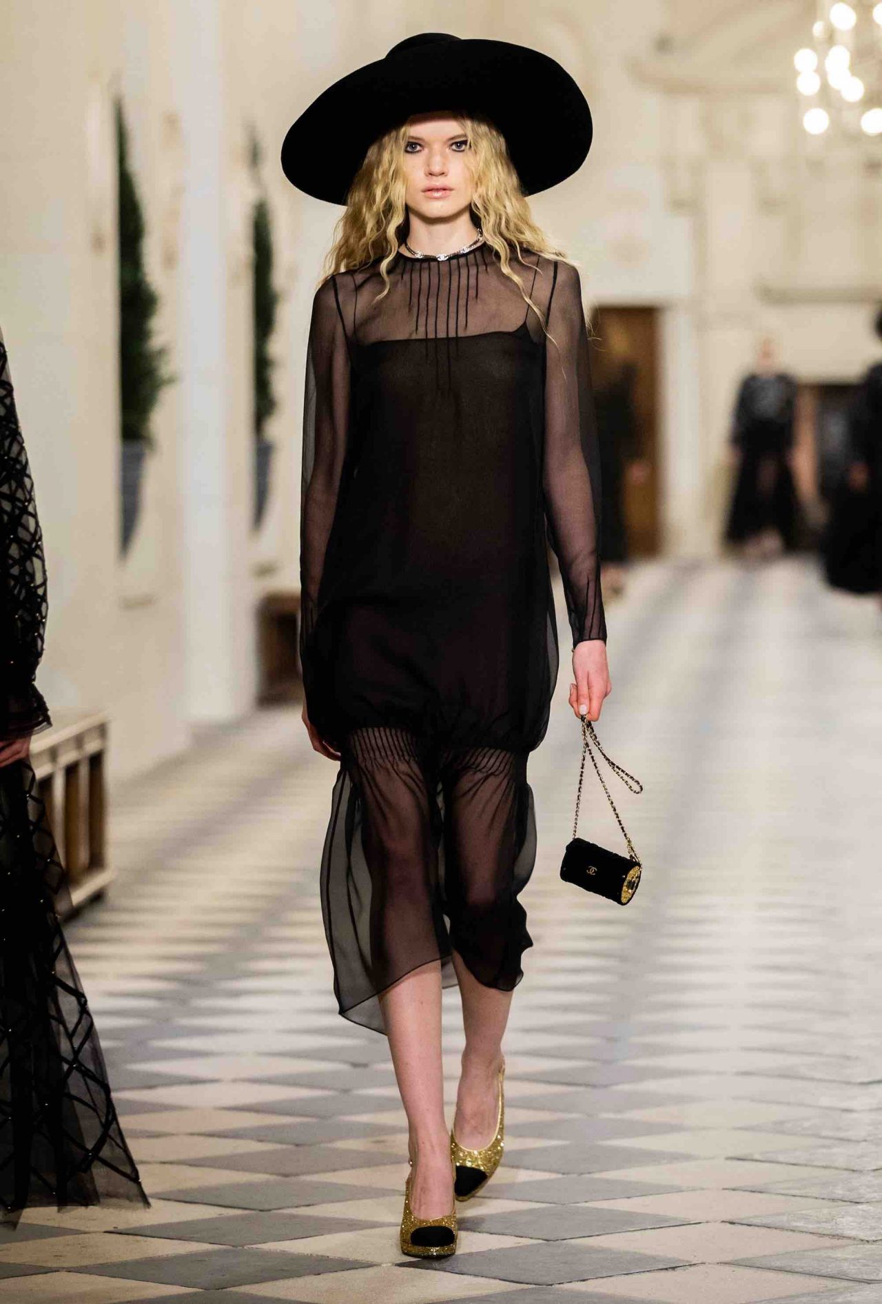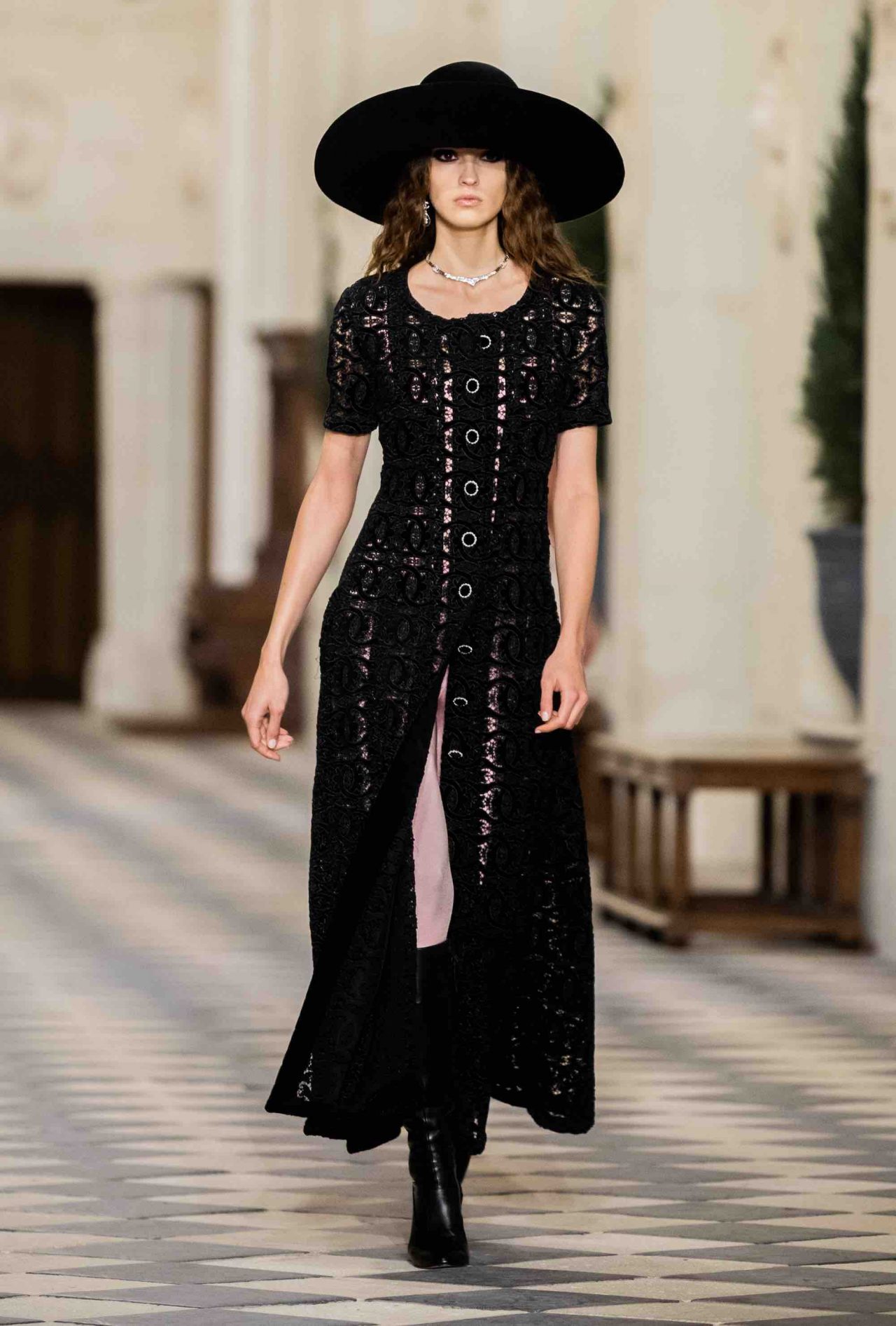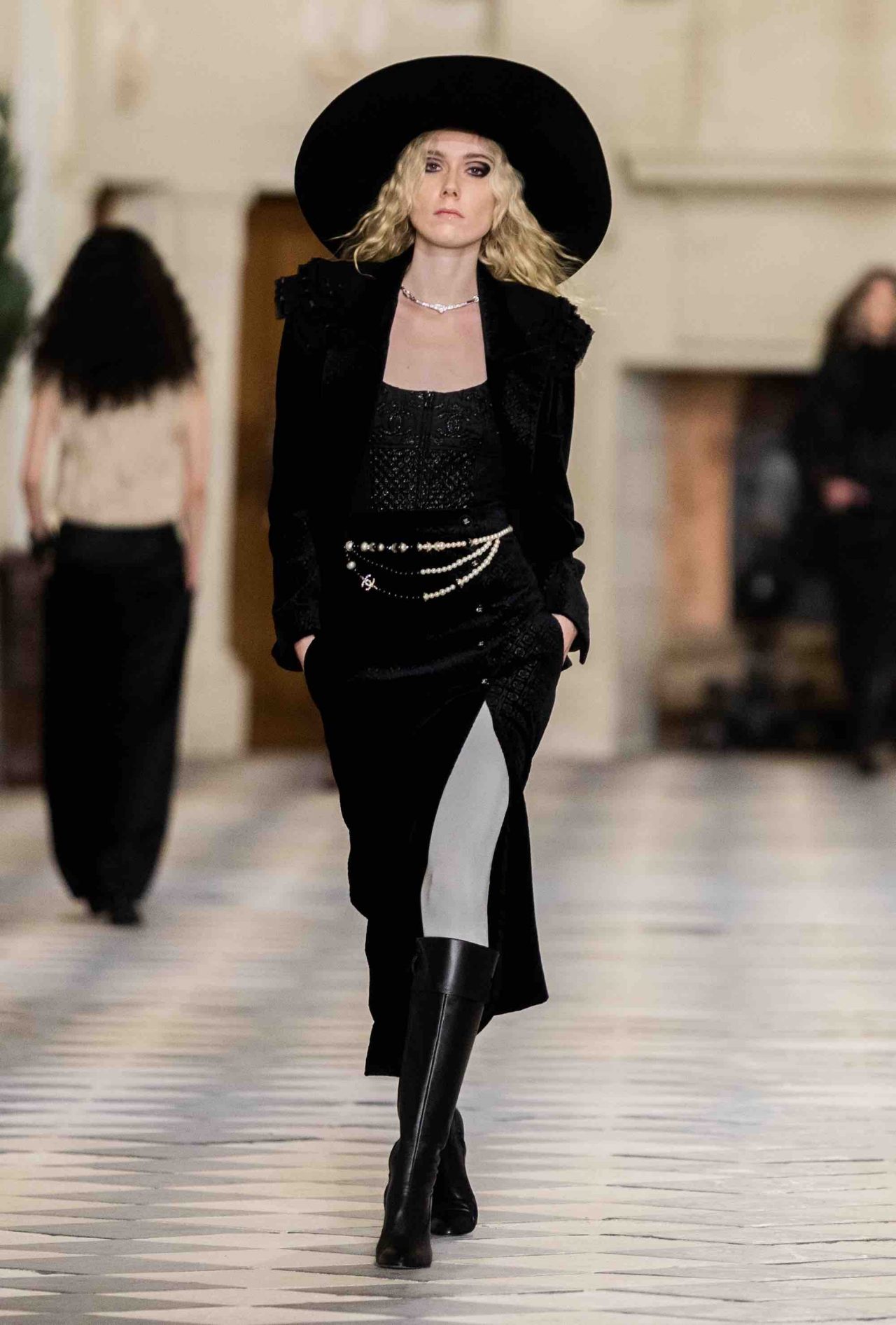 「メゾン ミッシェルが手掛けた大きなブラックのハットは、まさに貴婦人のような雰囲気!アトリエ モンテックスには、ストラスを取り入れながら子供のおもちゃのような城の刺繍を施すよう依頼しました。私は、ルネサンス期からロマン主義という異なった時代や、ロックテイストからガーリーなものまで、 あらゆるものをミックスするのが好きです。それこそが、まさにシャネルなのです。」
