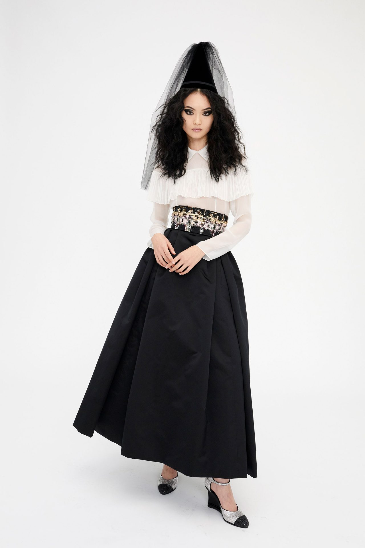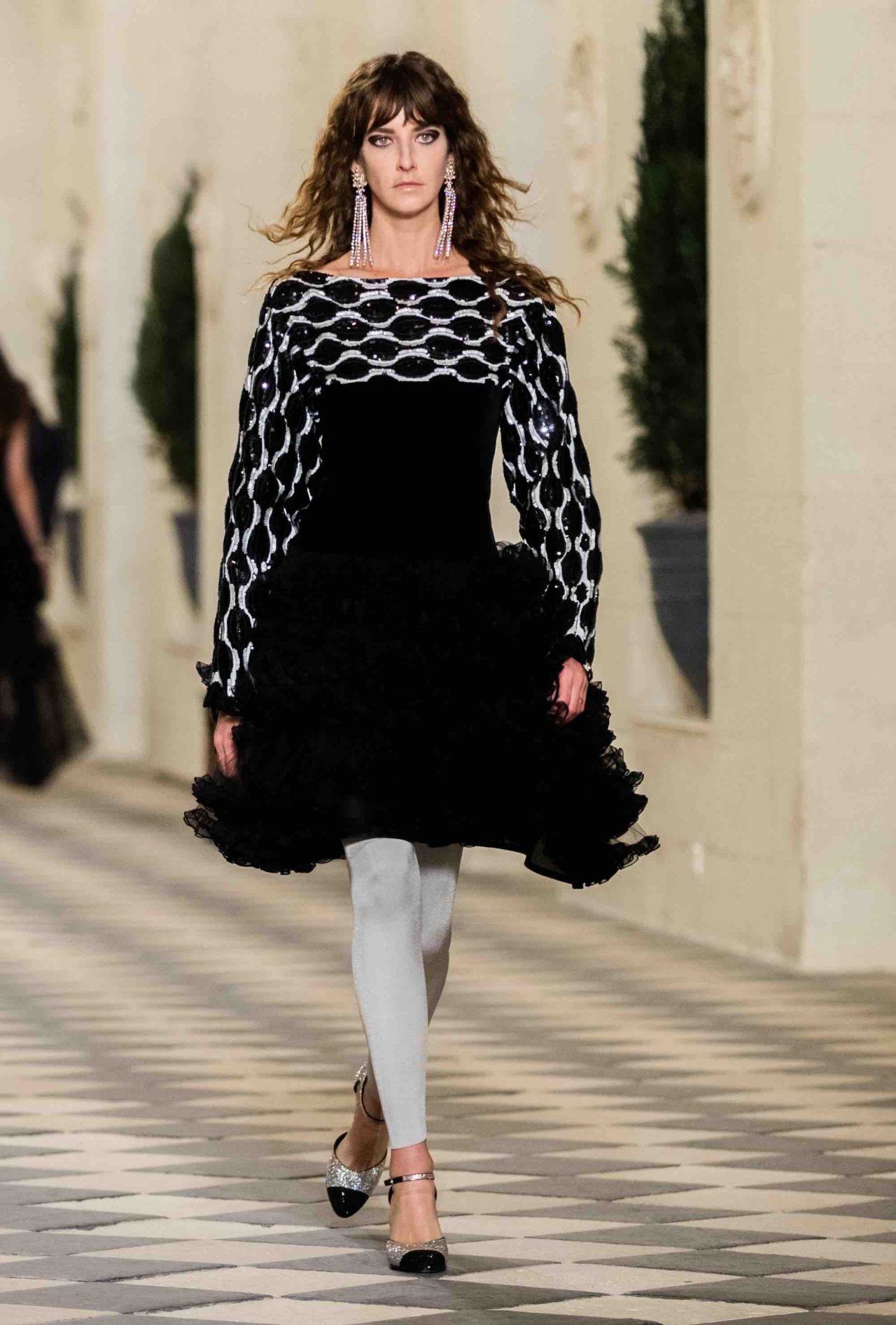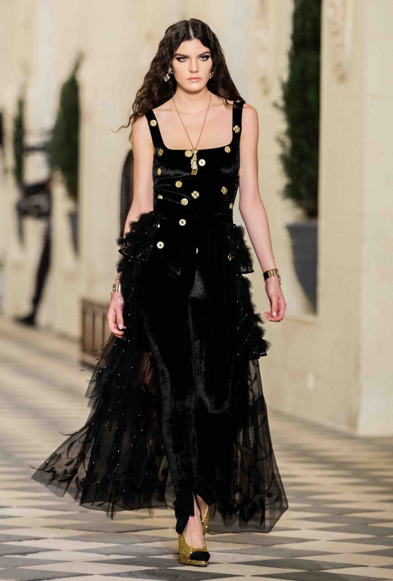 「メゾン ミッシェルが手掛けた大きなブラックのハットは、まさに貴婦人のような雰囲気!アトリエ モンテックスには、ストラスを取り入れながら子供のおもちゃのような城の刺繍を施すよう依頼しました。私は、ルネサンス期からロマン主義という異なった時代や、ロックテイストからガーリーなものまで、 あらゆるものをミックスするのが好きです。それこそが、まさにシャネルなのです。」