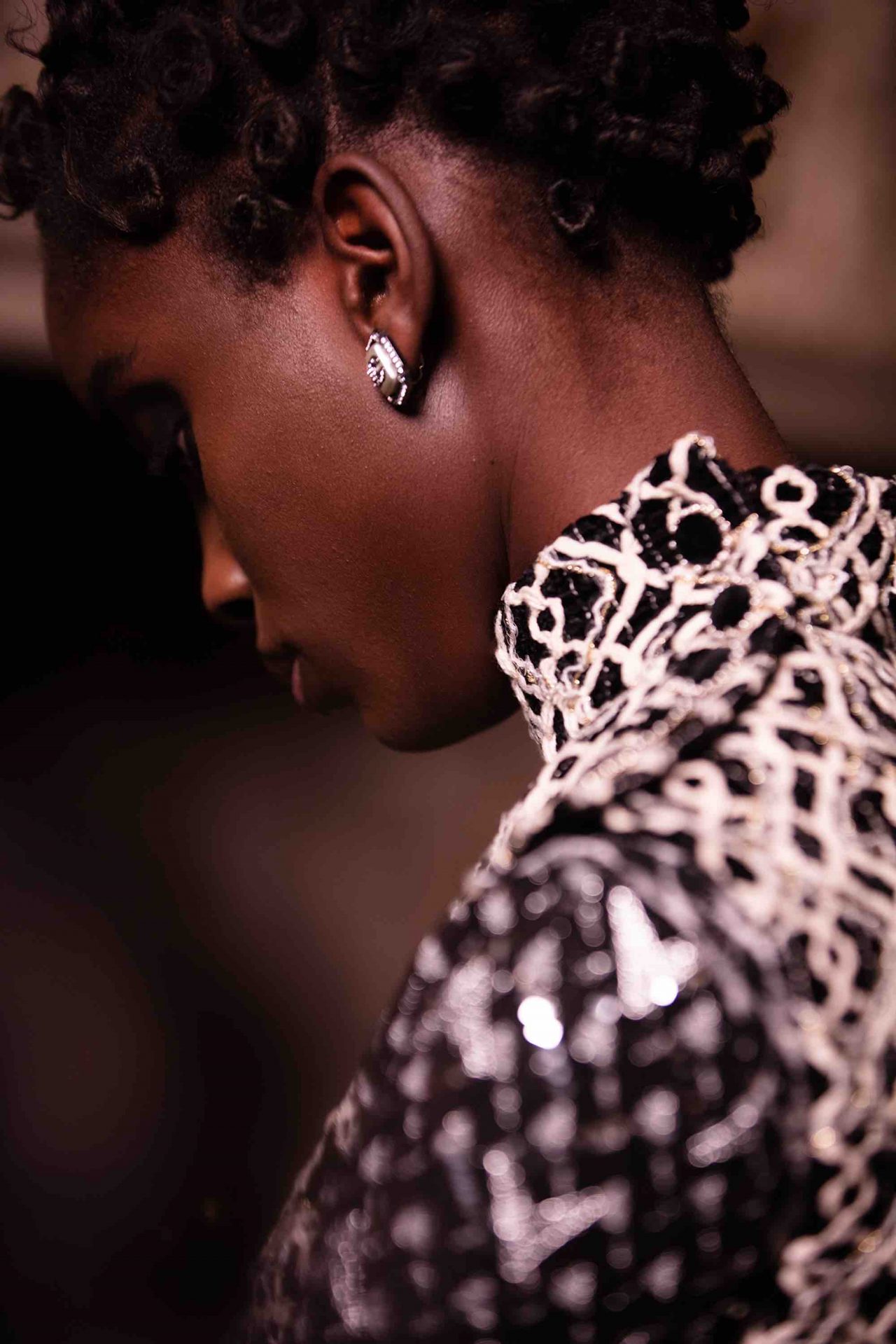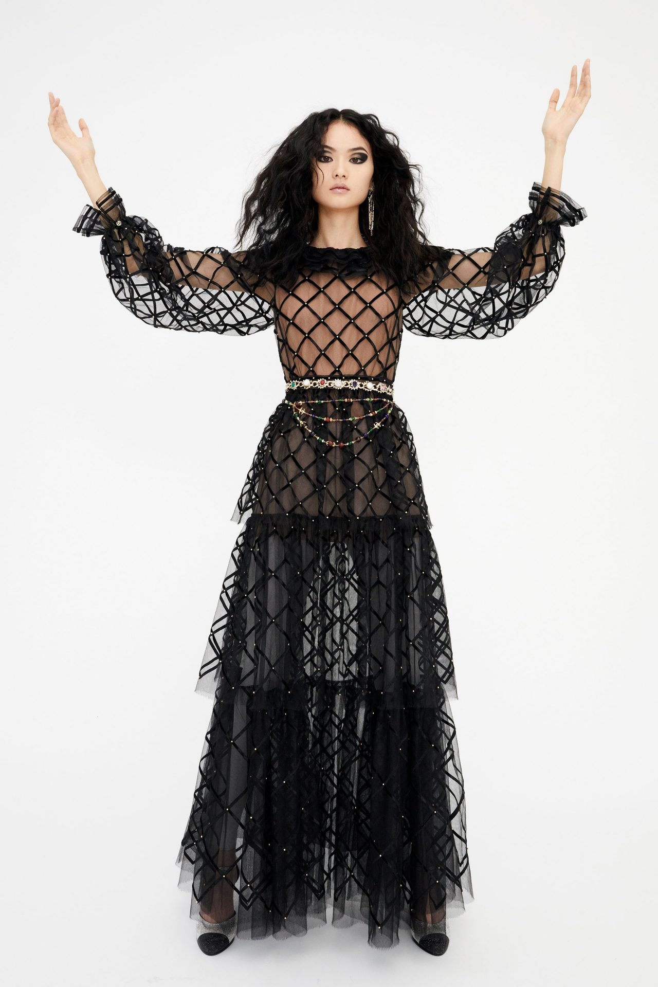 メティエダール コレクションにおいて忘れてはならないのが、メゾンが誇るアトリエの職人たちの類稀なるクリエーションの数々。スタッズがアクセントに施された格子模様の美しいレースのロングドレスはルマリエが、ダマスク柄のドレスの全体に施された贅沢な刺繍はルサージュが、バイカラーのきらめくシルバーのプラットフォームサンダルや折り返しのデザインが特徴的なテーパードブーツはマサロが手がけている。