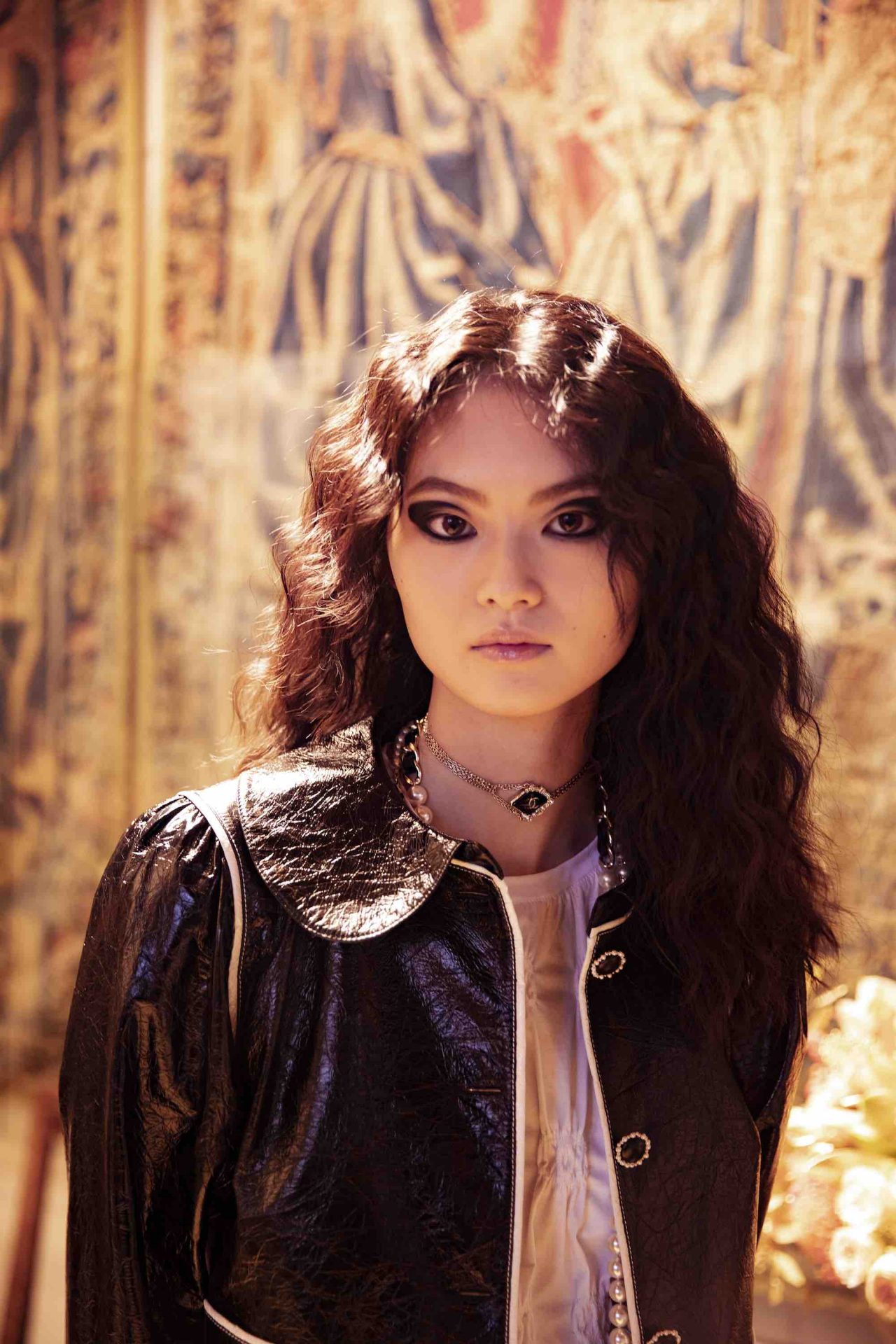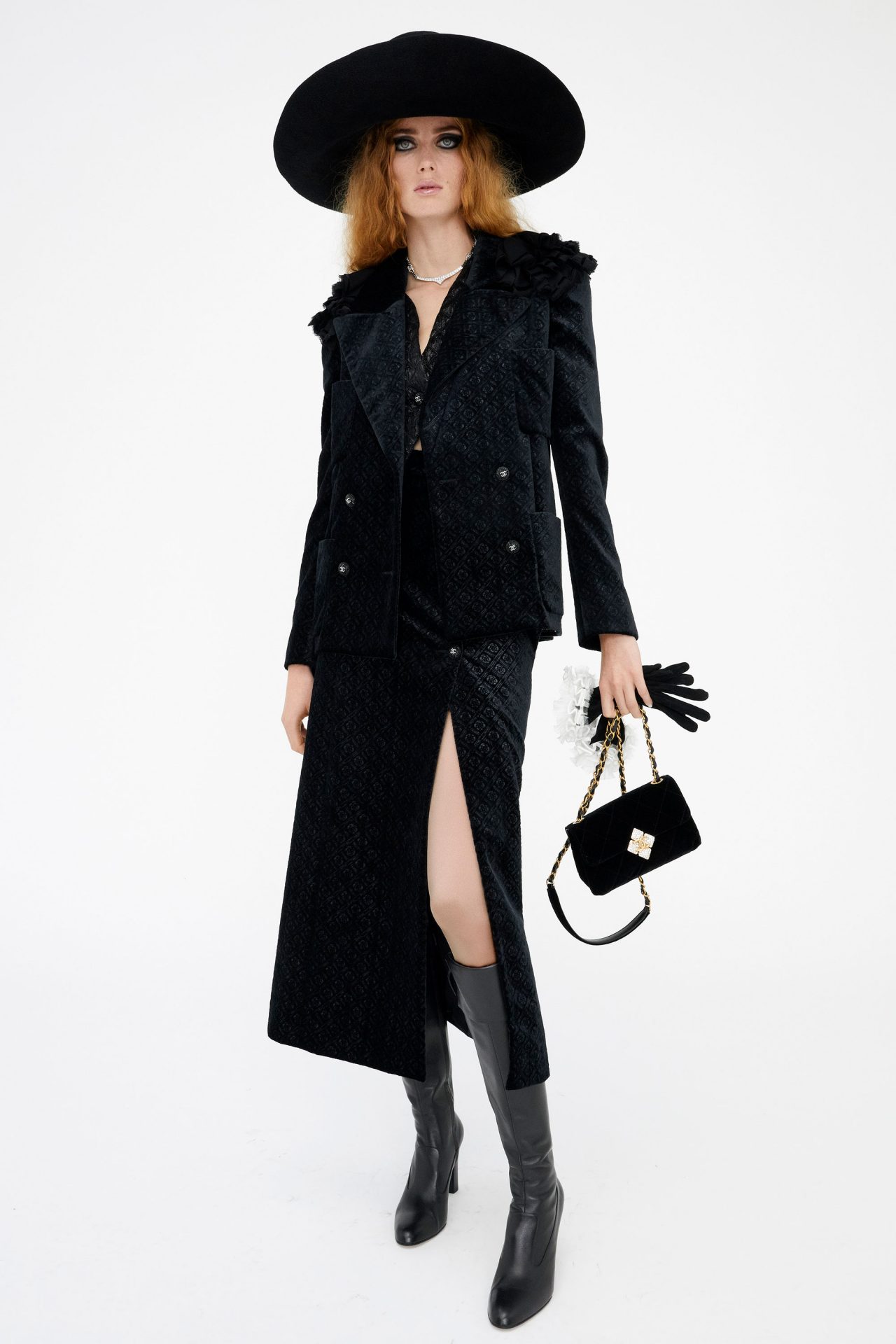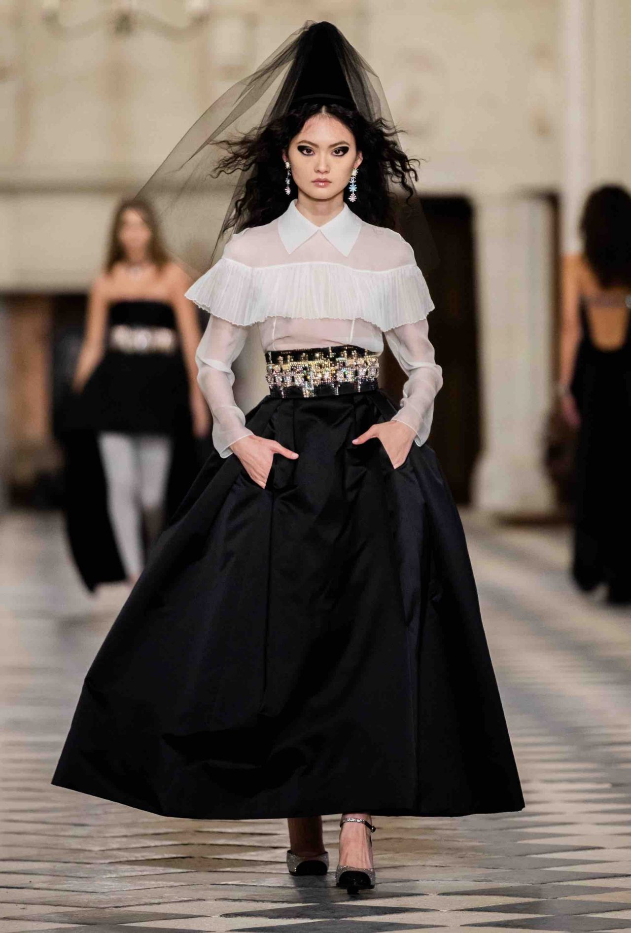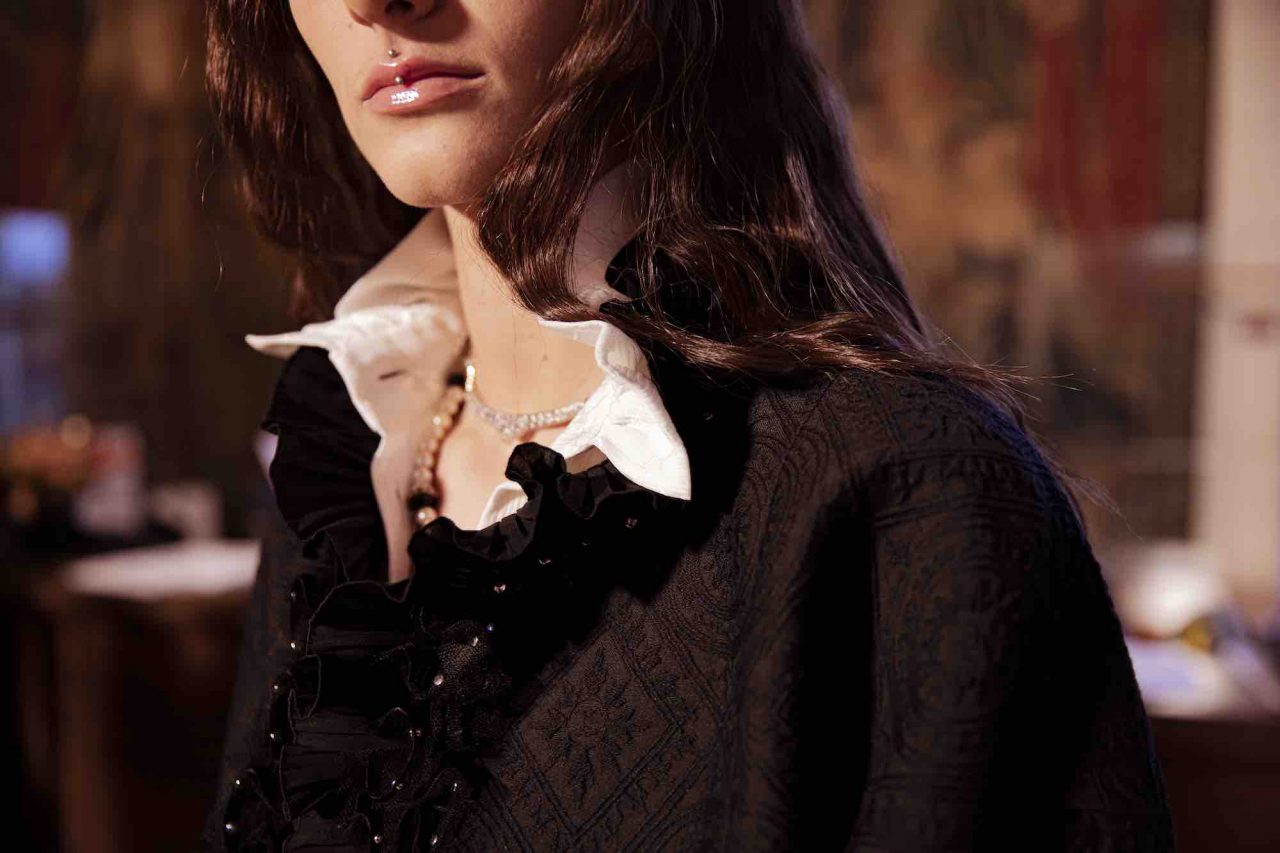 また、城内の装飾と融合するように、本コレクションではシックなモノトーンルックが多数登場。ベルベットのロングコートにツイードで作られたペールカラーのボディスーツが覗くルックについて Virginie Viard は「まるで『黒衣の花嫁』のような雰囲気を醸し出していますが、これはフランス国王であり、夫のアンリ2世が亡くなった後、カトリーヌ・ドゥ・メディシスが黒い服しか身に付けなかったと言われていることに所似します」と語る。