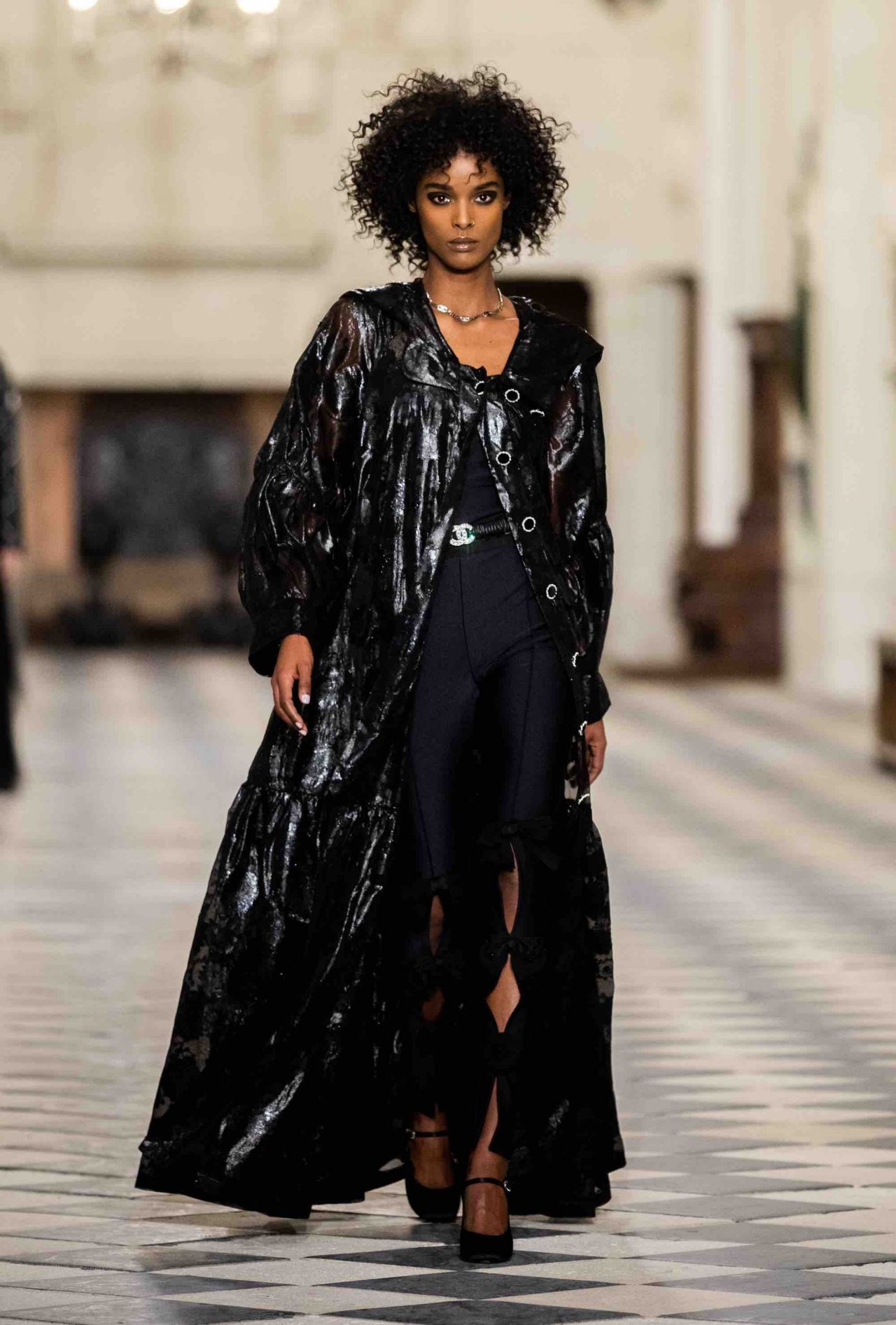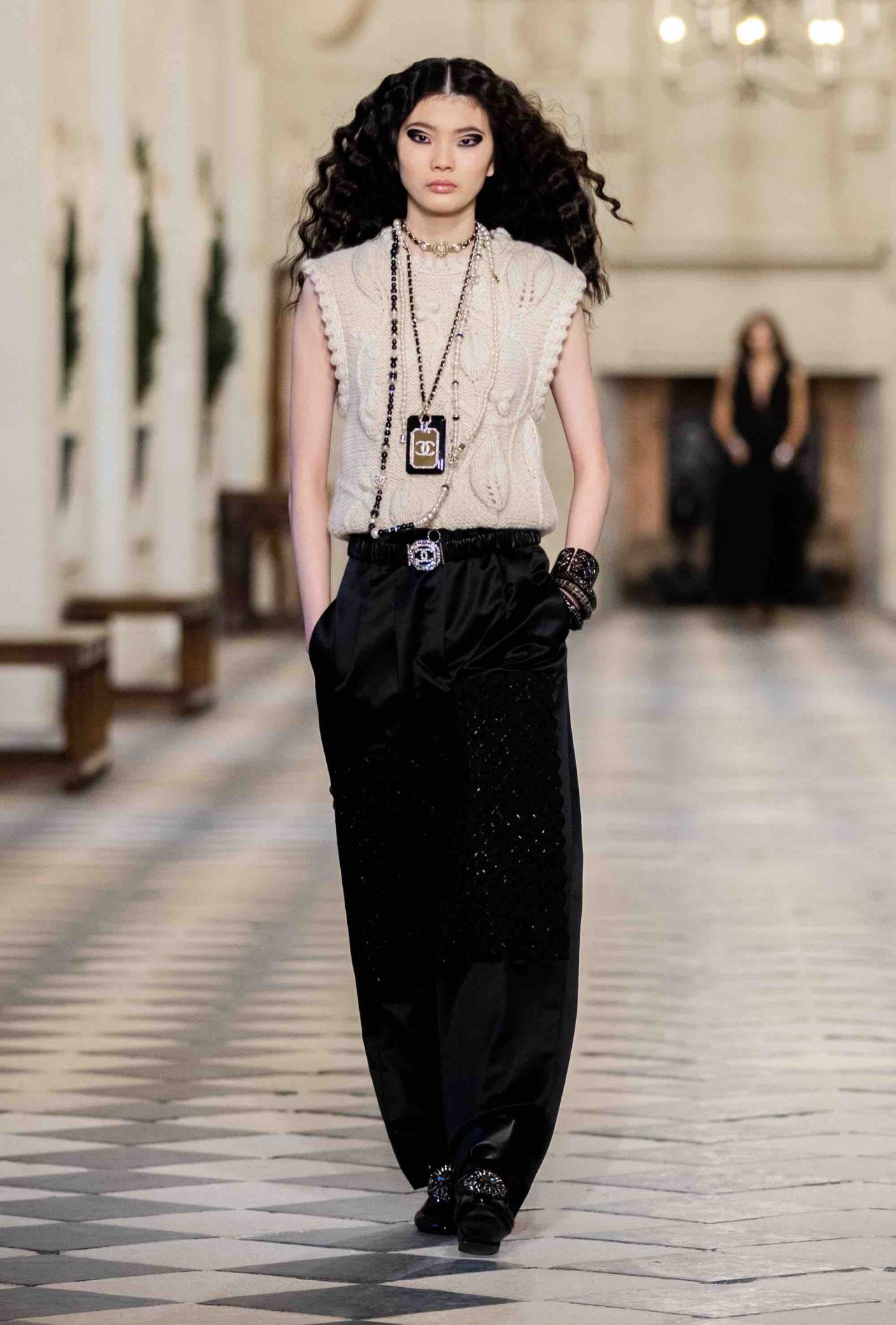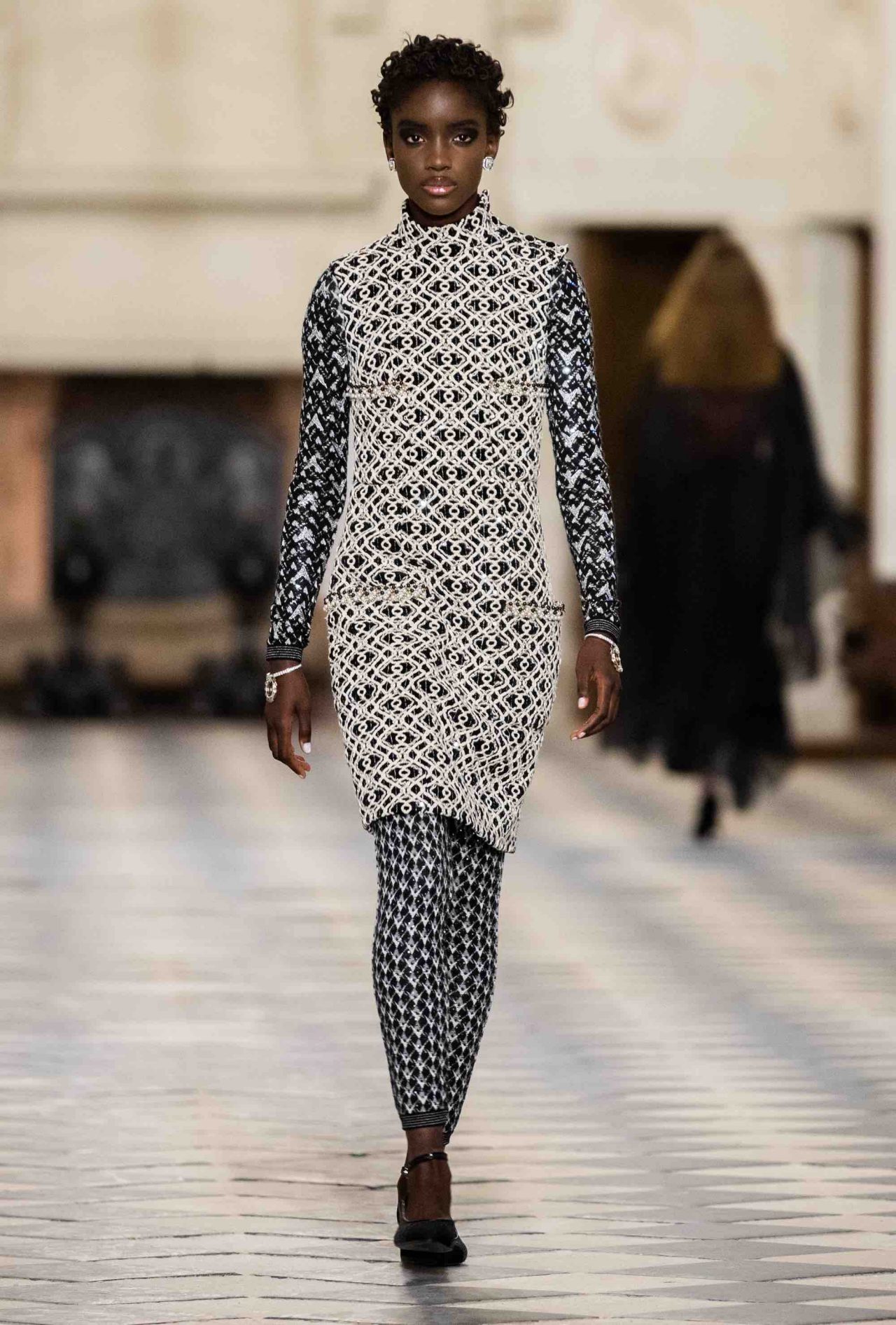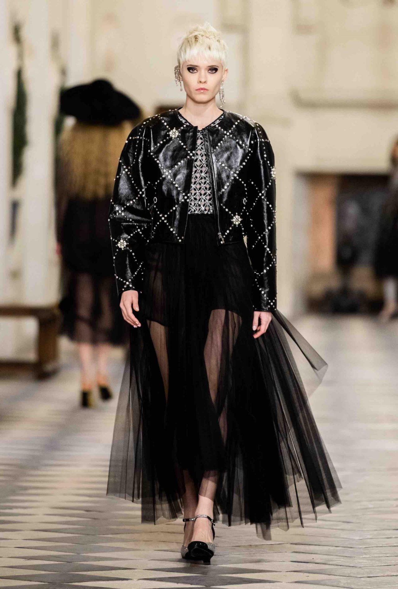また、城内の装飾と融合するように、本コレクションではシックなモノトーンルックが多数登場。ベルベットのロングコートにツイードで作られたペールカラーのボディスーツが覗くルックについて Virginie Viard は「まるで『黒衣の花嫁』のような雰囲気を醸し出していますが、これはフランス国王であり、夫のアンリ2世が亡くなった後、カトリーヌ・ドゥ・メディシスが黒い服しか身に付けなかったと言われていることに所似します」と語る。