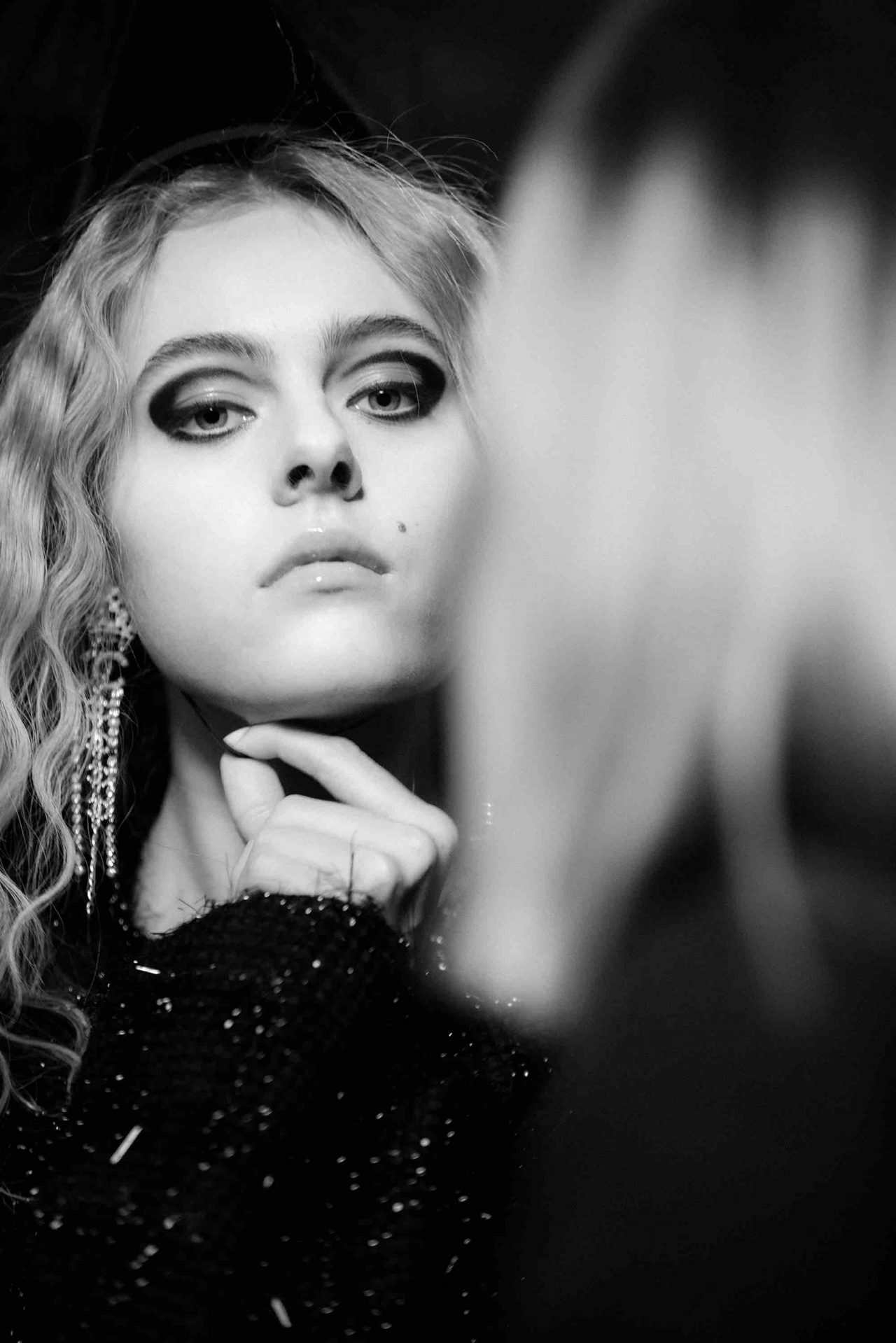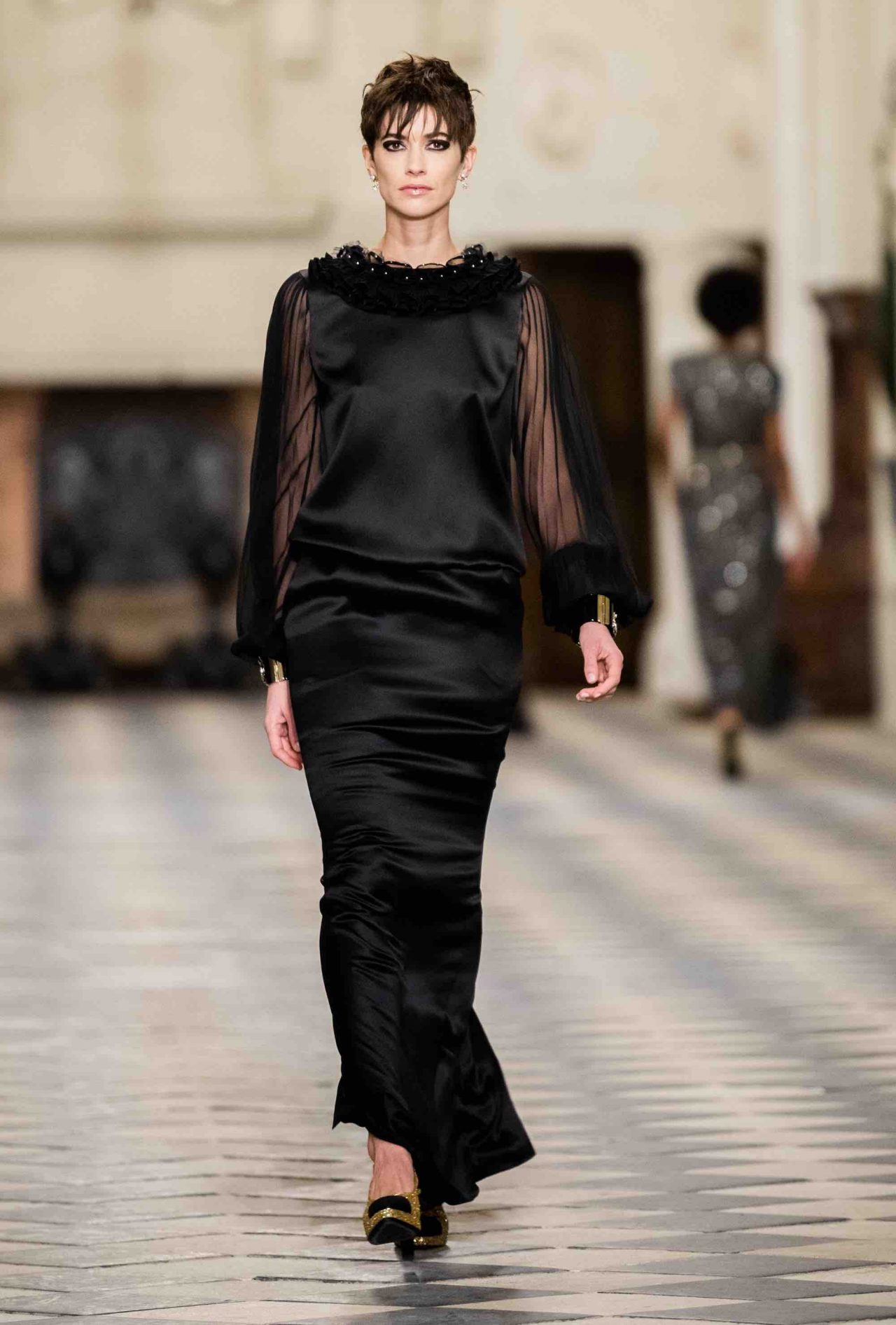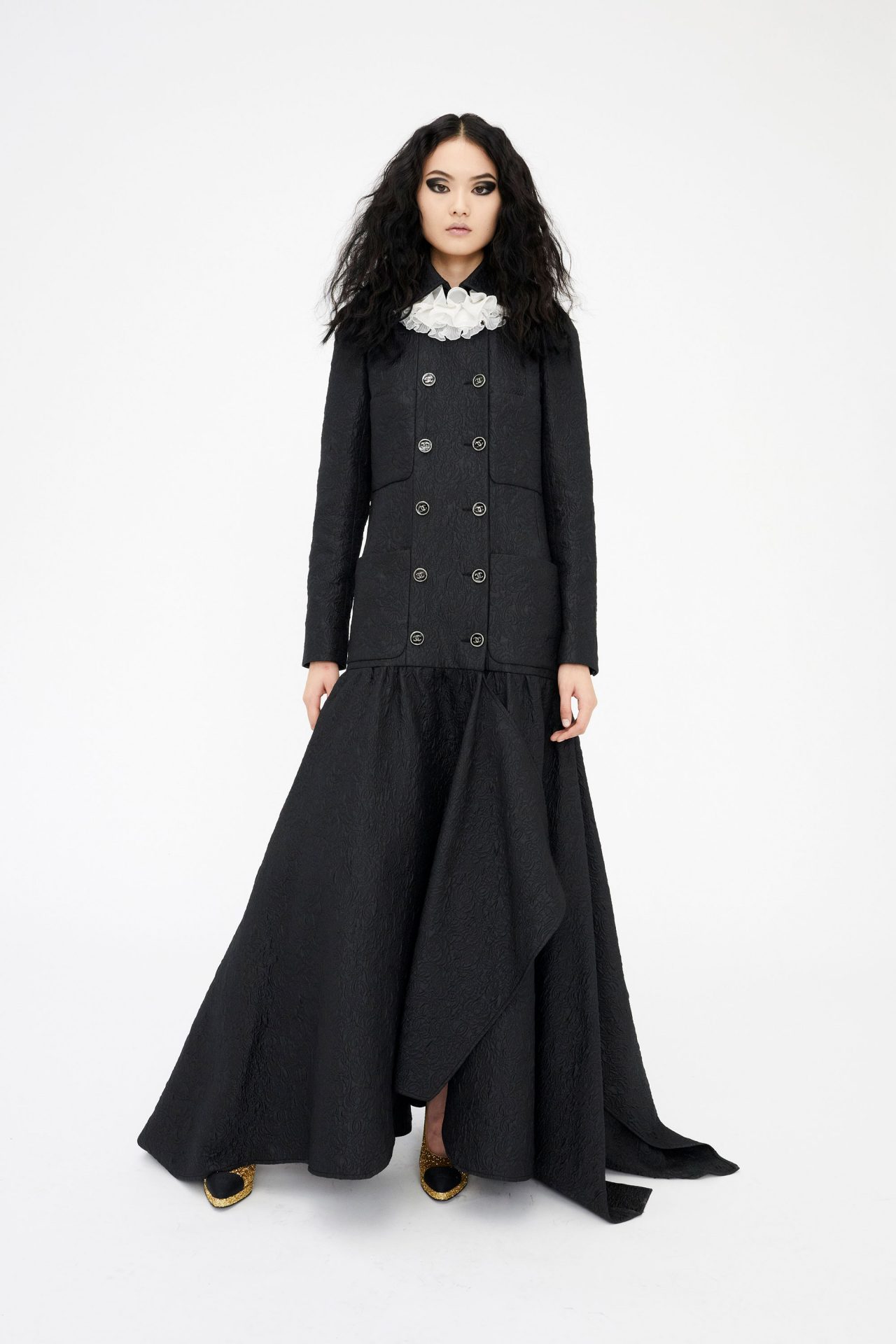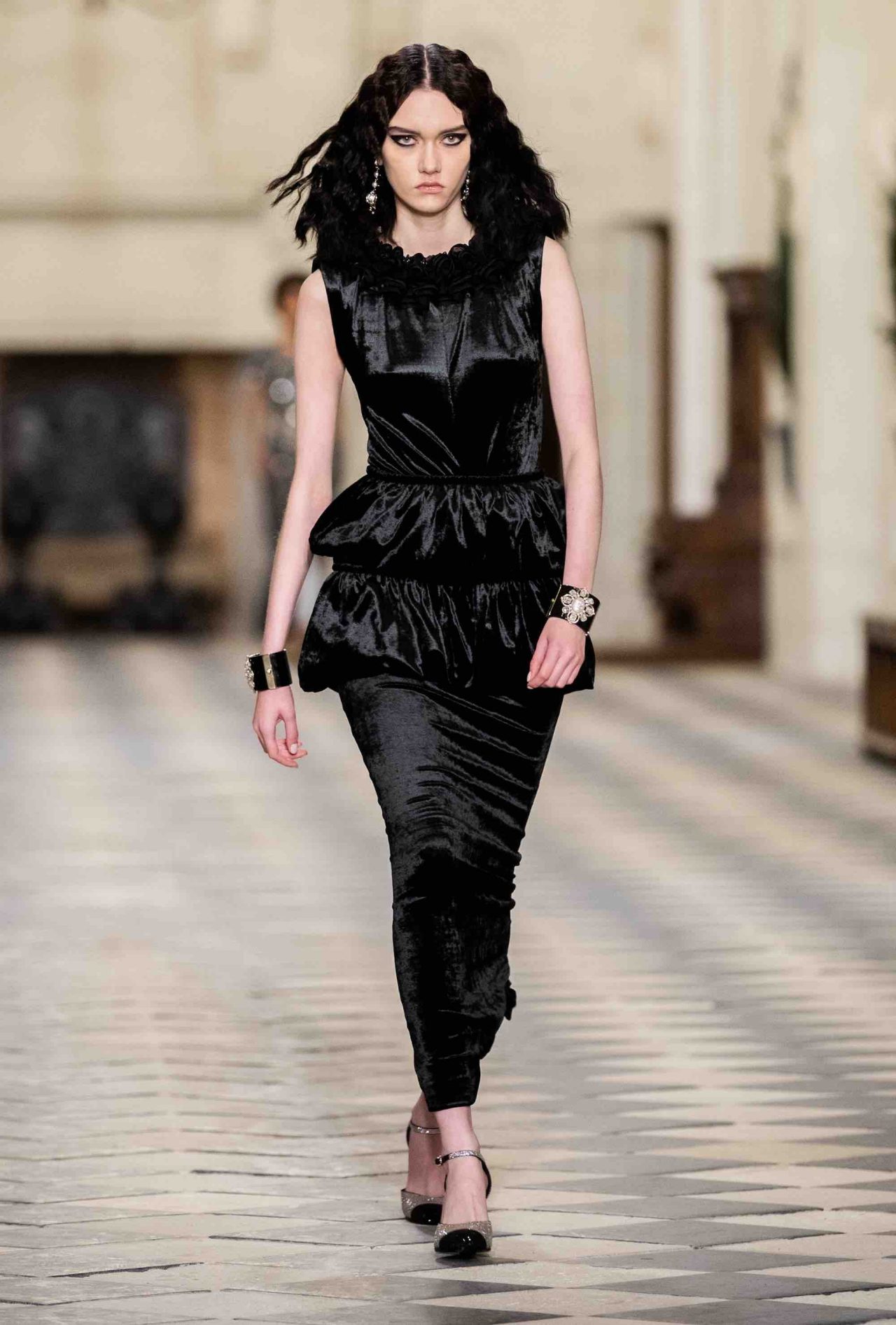また、城内の装飾と融合するように、本コレクションではシックなモノトーンルックが多数登場。ベルベットのロングコートにツイードで作られたペールカラーのボディスーツが覗くルックについて Virginie Viard は「まるで『黒衣の花嫁』のような雰囲気を醸し出していますが、これはフランス国王であり、夫のアンリ2世が亡くなった後、カトリーヌ・ドゥ・メディシスが黒い服しか身に付けなかったと言われていることに所似します」と語る。