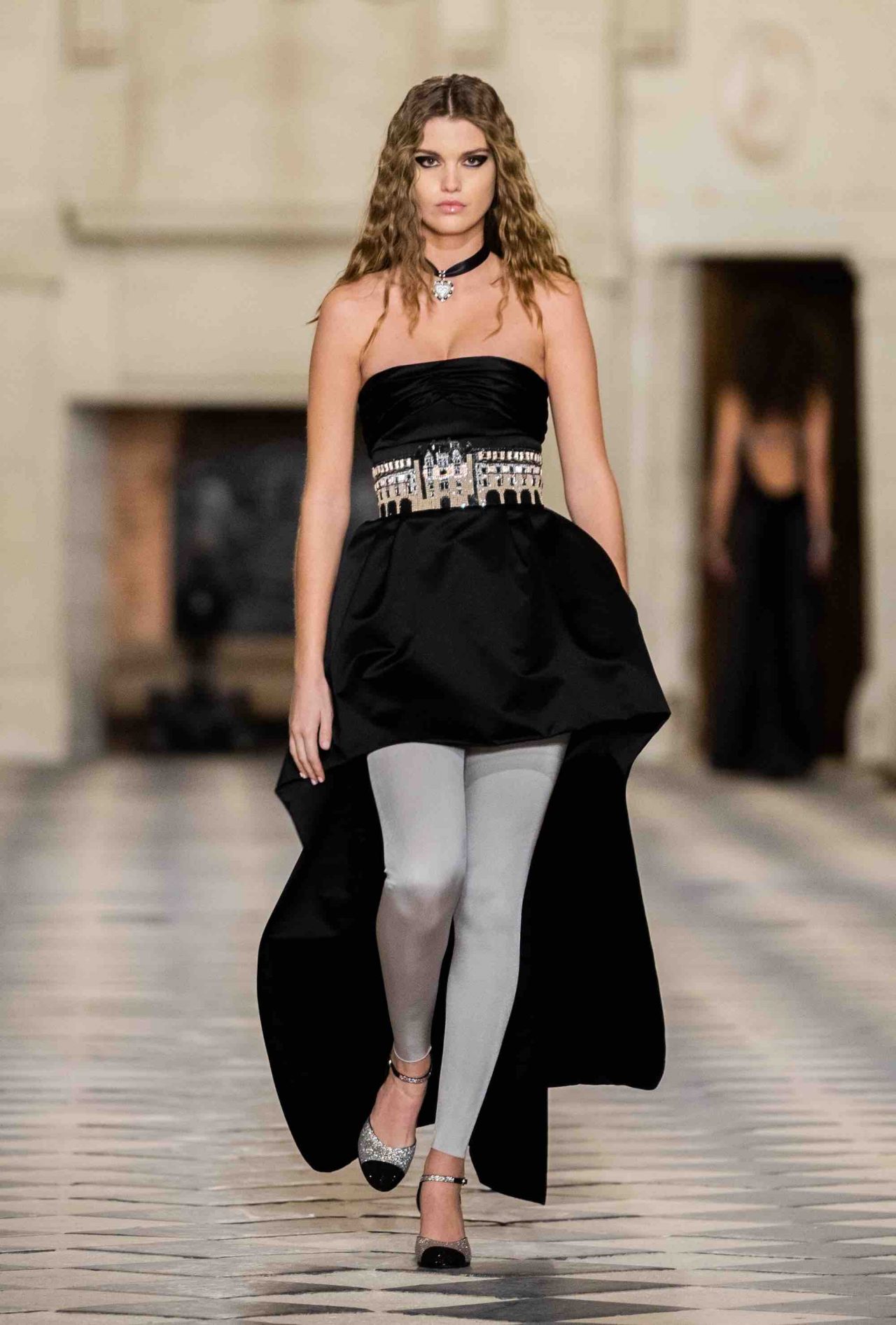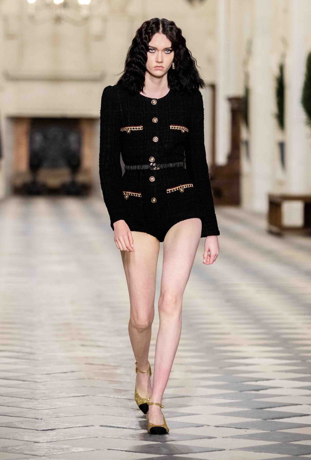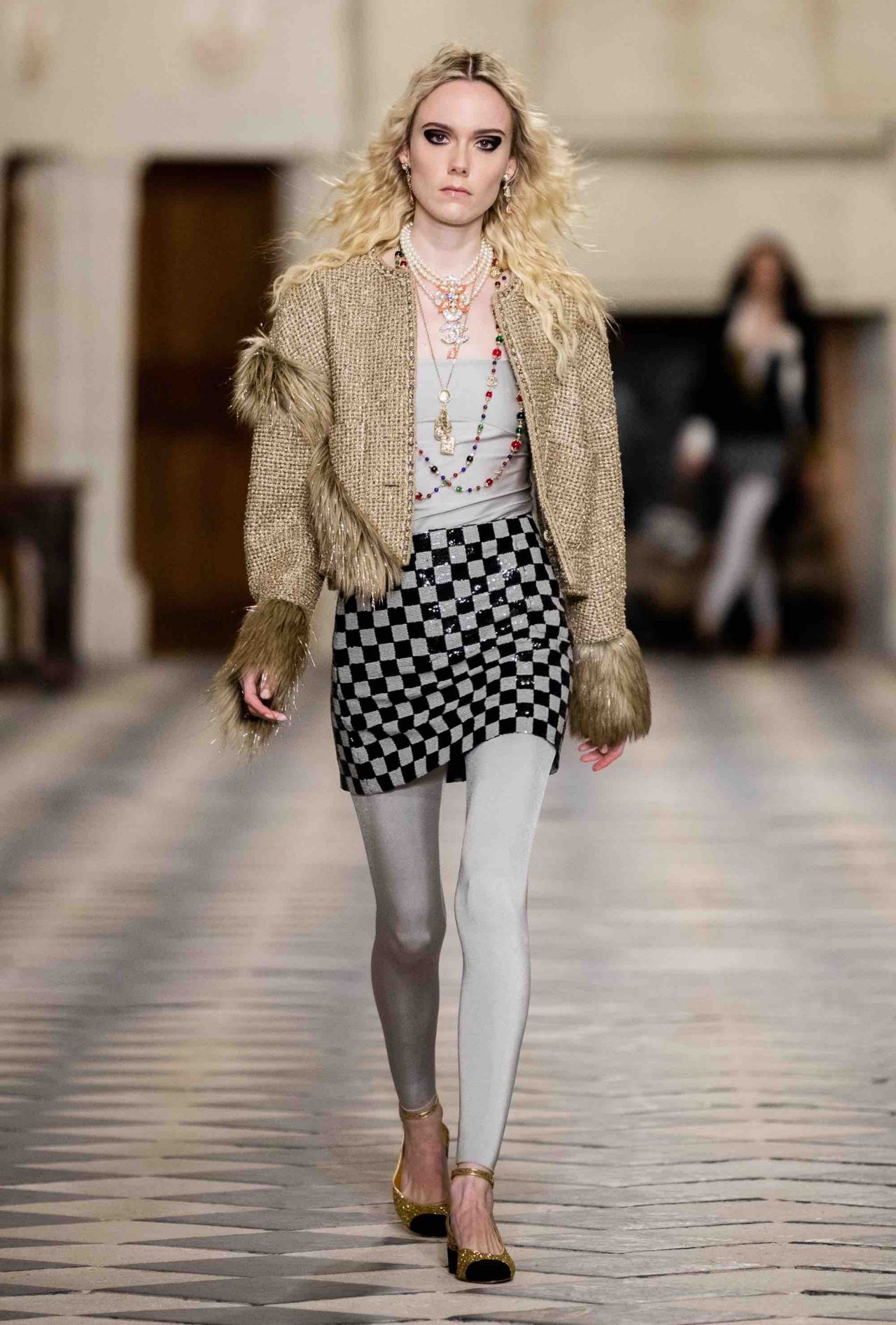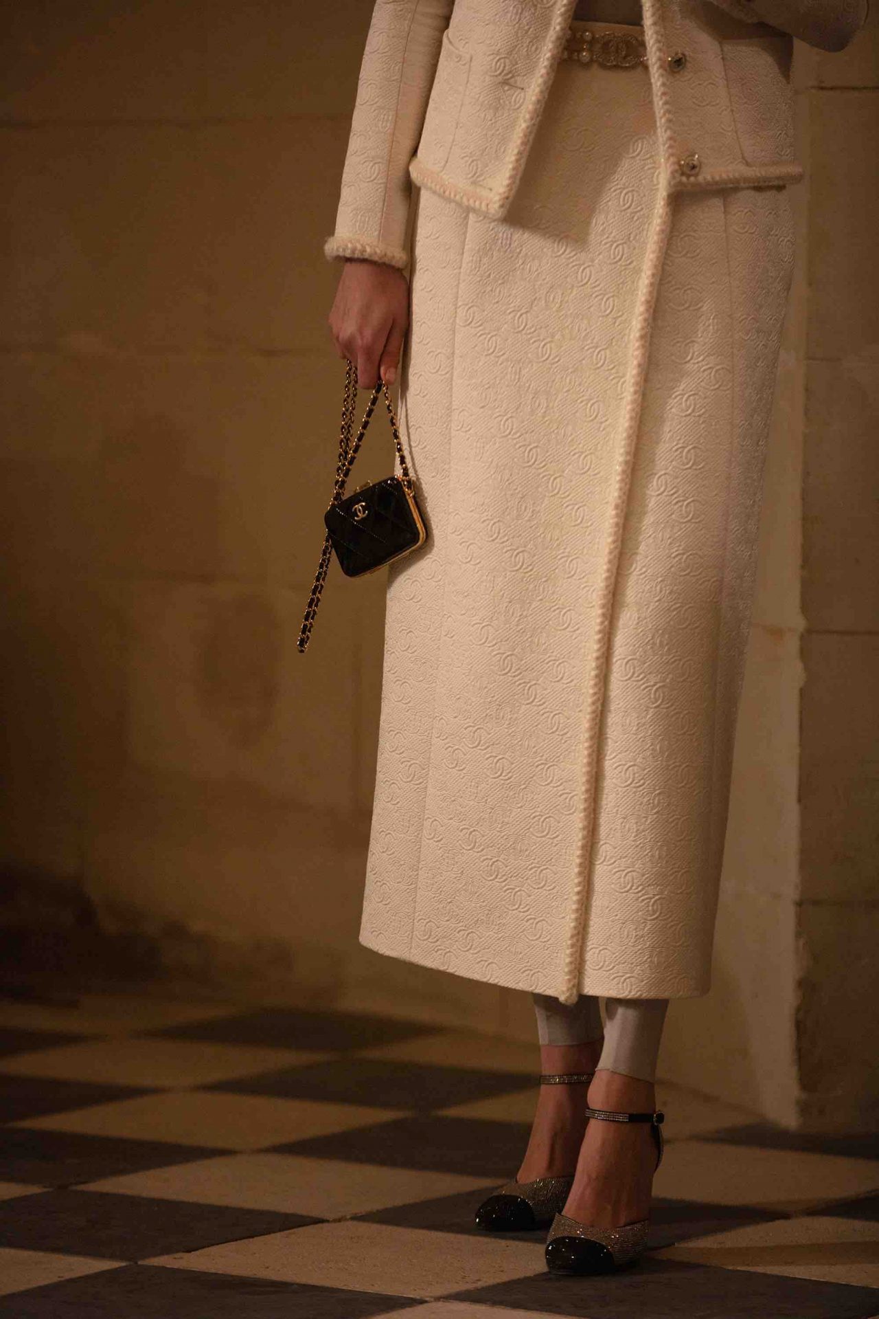 そうした経緯からショーの舞台に選ばれた「貴婦人たちの城」は、コレクション自体にも大きなインスピレーションを与えている。メゾンのミューズである Kristen Stewart (クリステン・スチュワート) が見守る中、始まったショーのランウェイとなった城内のグランドギャラリーの市松模様のフロアは、スパンコールをあしらったミニスカートに。シュノンソー城のタペストリーからインスパイアされたツイードのケープや庭園に咲く花々を想起させる花の刺繍などがコレクションに散りばめられている。ウエストをマークするように城の外観がスパンコールであしらわれた遊び心溢れるルックも。
