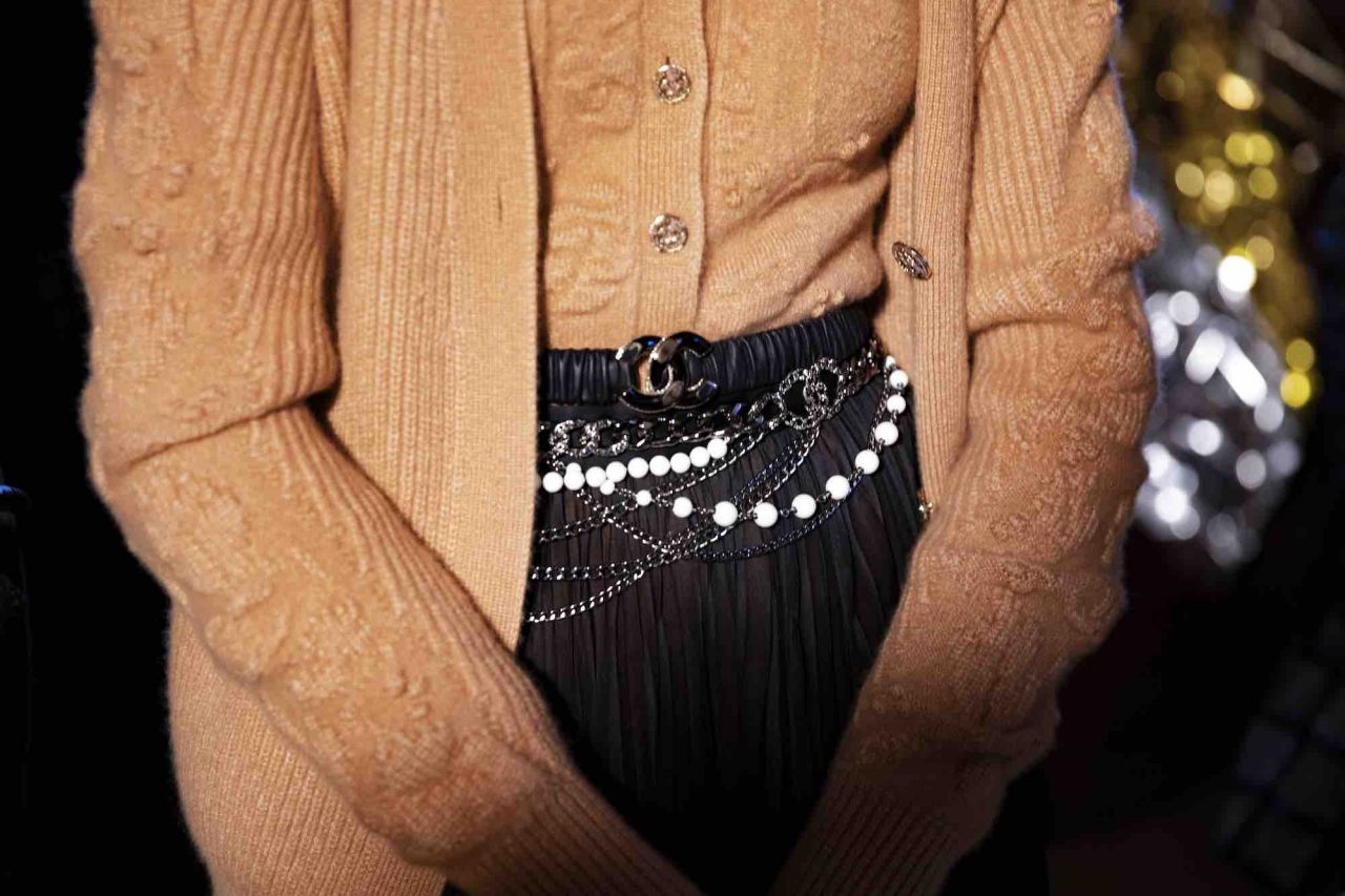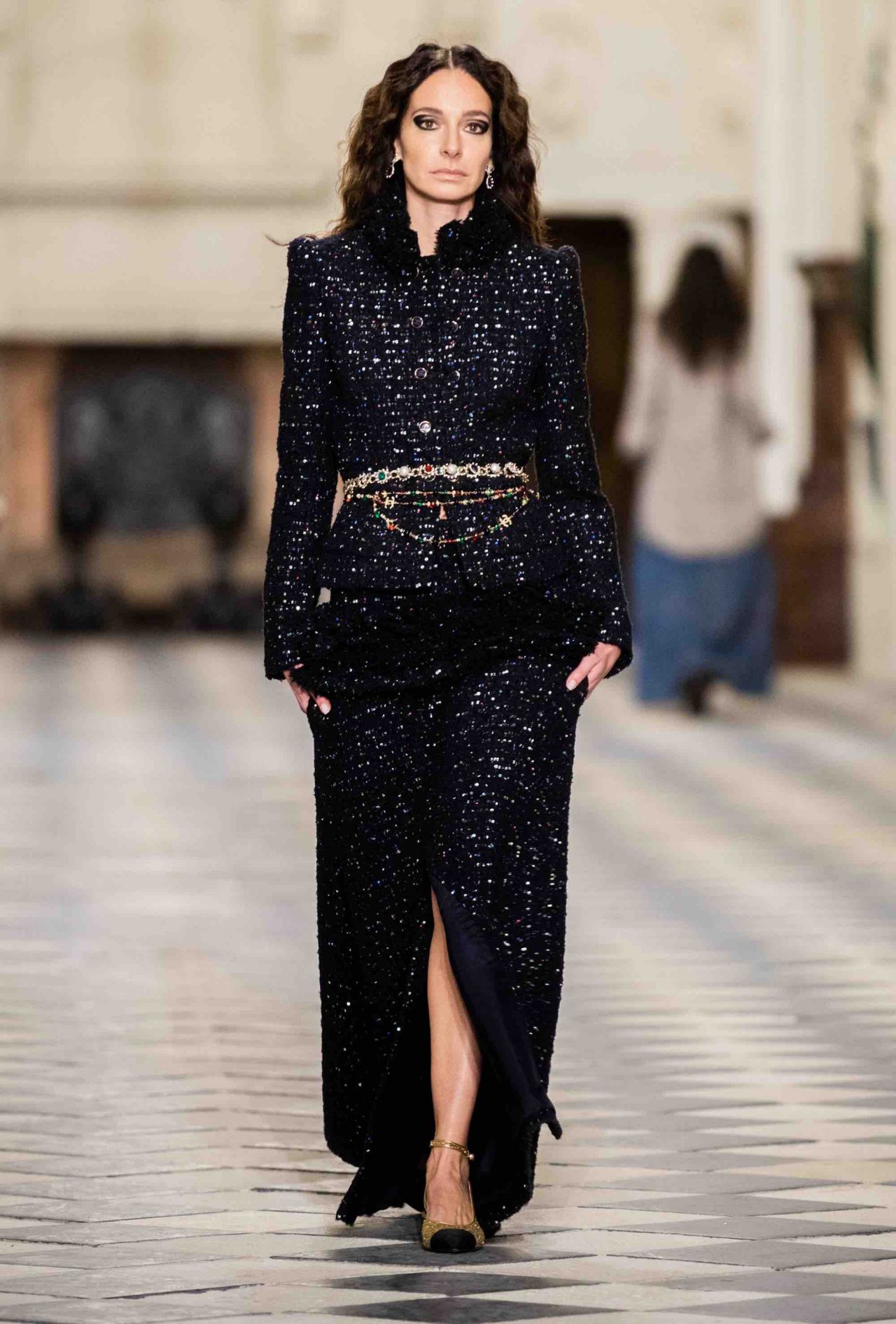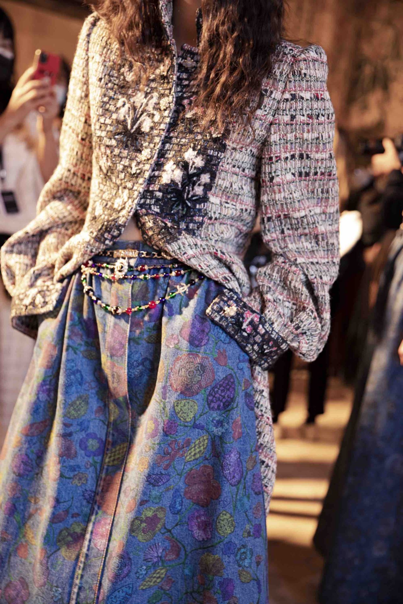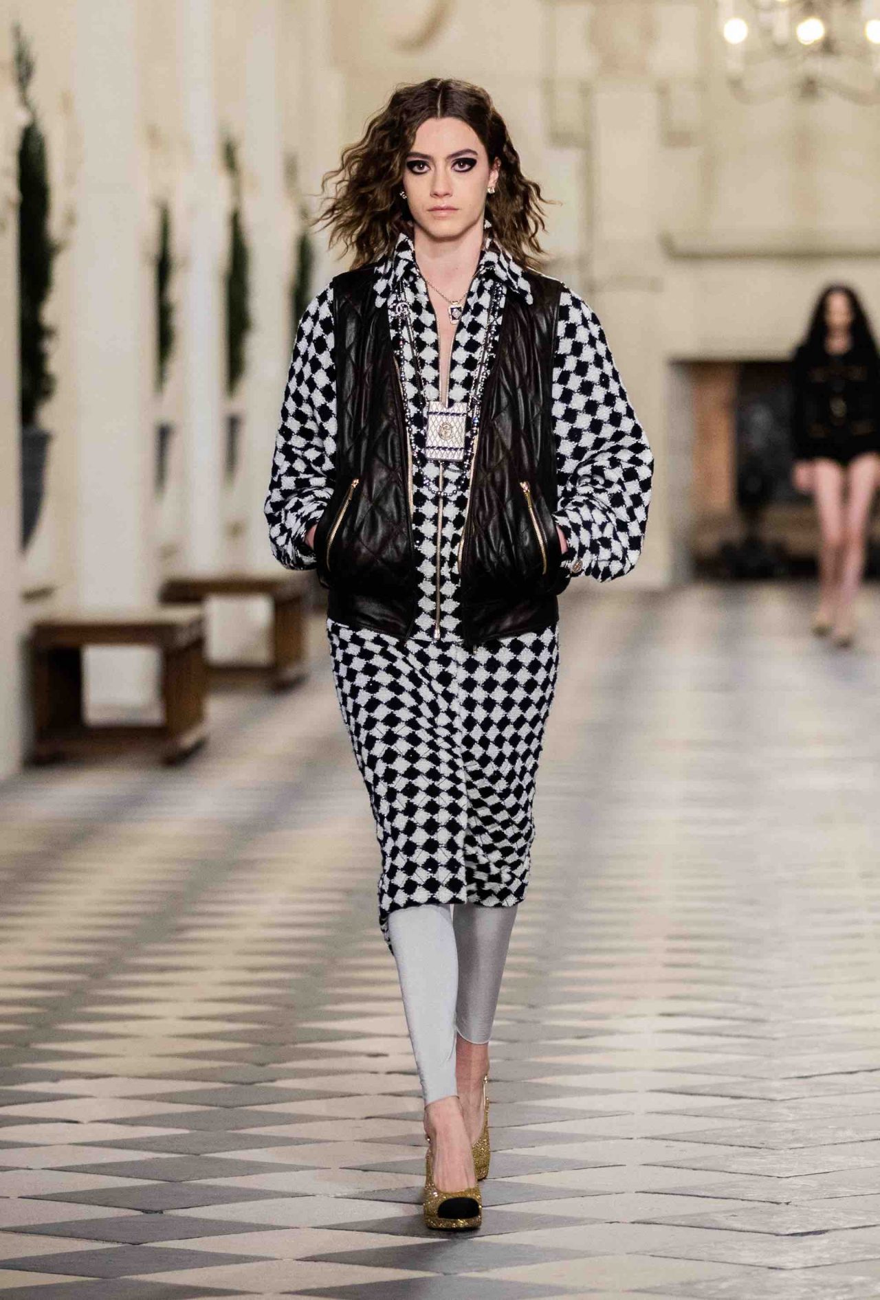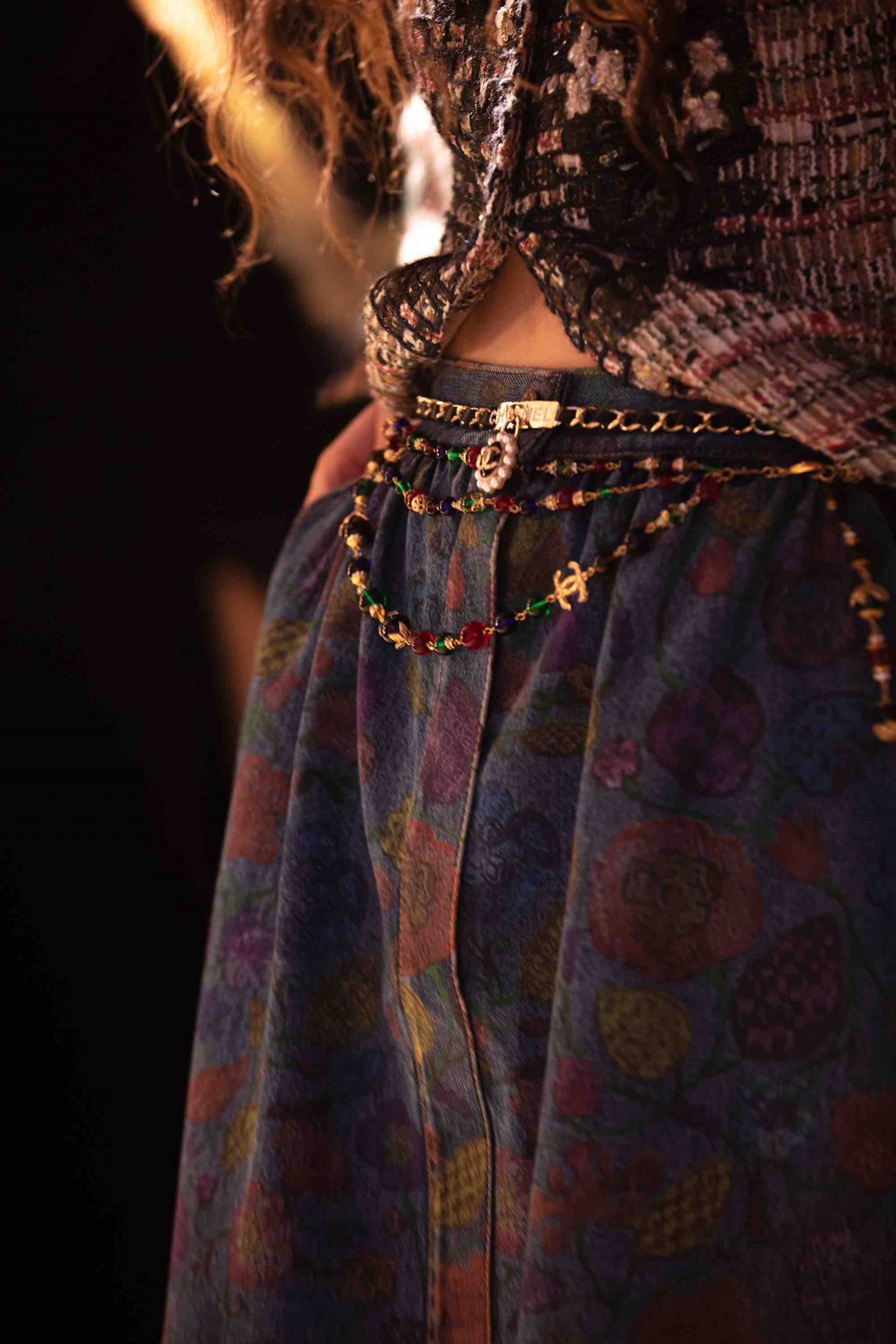 そうした経緯からショーの舞台に選ばれた「貴婦人たちの城」は、コレクション自体にも大きなインスピレーションを与えている。メゾンのミューズである Kristen Stewart (クリステン・スチュワート) が見守る中、始まったショーのランウェイとなった城内のグランドギャラリーの市松模様のフロアは、スパンコールをあしらったミニスカートに。シュノンソー城のタペストリーからインスパイアされたツイードのケープや庭園に咲く花々を想起させる花の刺繍などがコレクションに散りばめられている。ウエストをマークするように城の外観がスパンコールであしらわれた遊び心溢れるルックも。