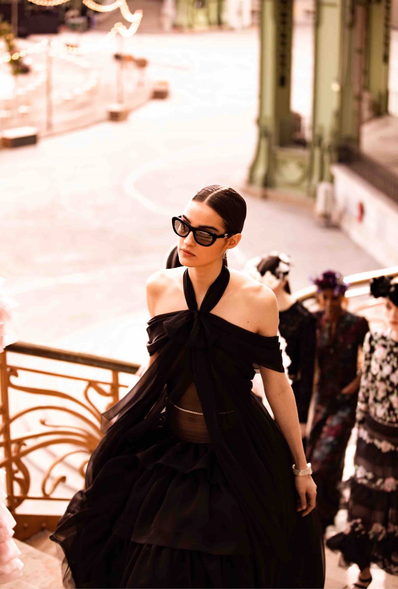 登場するのは、Marion Cotillard (マリオン・コティヤール) や Penélope Cruz (ペネロペ・クルス)、Vanessa Paradis (ヴァネッサ・パラディ)、Lily-Rose Depp (リリー=ローズ・デップ)、Alma Jodorowsky (アルマ・ホドロフスキー) らメゾンのアンバサダーや Joana Preiss (ジョアナ・プライス)、Izïa Higelin (イジア・イジュラン) ら CHANEL ファミリー。特に注目したいのは、サロンにある伝説的な鏡張りの階段で撮影され、まるで花嫁が1920年代の写真から飛び出してきたかのようなクチュールピースのひとつ。ヴェールを被り、淡いベージュ色のサテン クレープのトレーン付きロングドレスを着用。このドレスには、メゾンが誇るアトリエ、ルサージュがストラスやパールで バタフライの刺繍を施している。