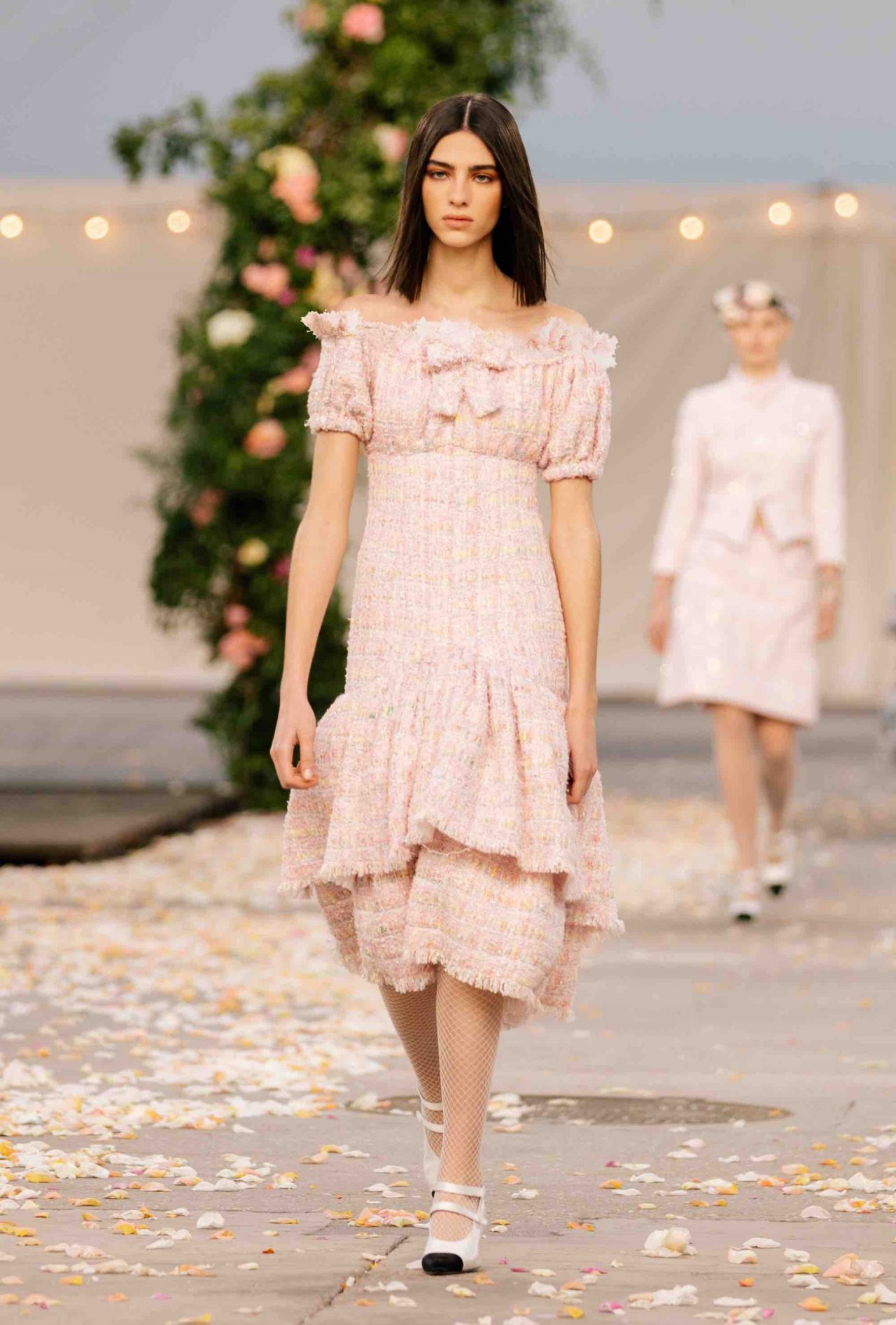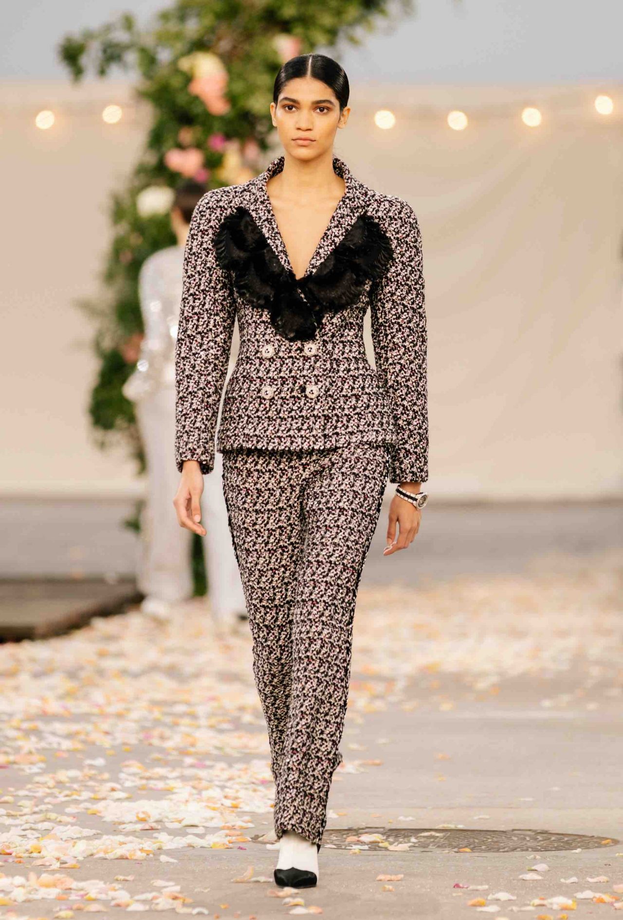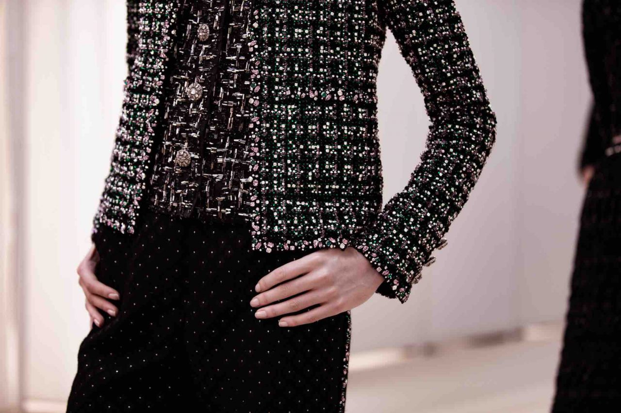 クチュールコレクションだけあって、CHANEL のパートナーであるメゾンダールの卓越した職人技が集結。アトリエ モンテックスは、パール グレーのチュールで作られたロングドレスにマクラメ刺繍を施し、オーガンザのフリルがあしらわれたツイードのリトル ブラック ドレスには、ルマリエが手掛けた繊細な羽根飾りが。